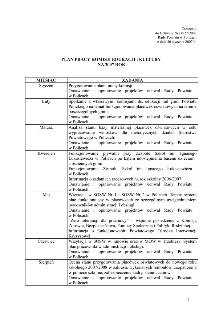 Załącznik do Uchwały Nr IV/27/2007 Rady Powiatu w Policach z dnia 26 stycznia 2007 r. PLAN PRACY KOMISJI EDUKACJI i KULTURY NA 2007 ROK MIESIĄC Styczeń Luty Marzec Kwiecień Maj Czerwiec Sierpień ZADANIA Przygotowanie planu pracy komisji. Omawianie i opiniowanie projektów uchwał Rady Powiatu w Policach. Spotkanie z właściwymi komisjami ds. edukacji rad gmin Powiatu Polickiego na temat funkcjonowania placówek oświatowych na terenie poszczególnych gmin. Omawianie i opiniowanie projektów uchwał Rady Powiatu w Policach. Analiza stanu bazy materialnej placówek oświatowych w celu wypracowanie wniosków dla metodycznych działań Starostwa Powiatowego w Policach. Omawianie i opiniowanie projektów uchwał Rady Powiatu w Policach. Funkcjonowanie pływalni przy Zespole Szkół im. Ignacego Łukasiewicza w Policach po kątem udostępnienia basenu dzieciom z ościennych gmin. Funkcjonowanie Zespołu Szkół im Ignacego Łukasiewicza w Policach. Informacja o zadaniach rzeczowych na rok szkolny 2006/2007. Omawianie i opiniowanie projektów uchwał Rady Powiatu w Policach. Wizytacja w SOSW Nr 1 i SOSW Nr 2 w Policach. Temat: system płac funkcjonujący w placówkach ze szczególnym uwzględnieniem pracowników administracji i obsługi. Omawianie i opiniowanie projektów uchwał Rady Powiatu w Policach. „Zero tolerancji dla przemocy” – wspólne posiedzenie z Komisją Zdrowia, Bezpieczeństwa, Pomocy Społecznej i Polityki Rodzinnej. Informacja o funkcjonowaniu Powiatowego Ośrodka Interwencji Kryzysowej. Wizytacja w SOSW w Tanowie oraz w MOW w Trzebieży. System płac pracowników administracji i obsługi. Omawianie i opiniowanie projektów uchwał Rady Powiatu w Policach. Ocena stanu przygotowania placówek oświatowych do nowego roku szkolnego 2007/2008 w zakresie wykonanych remontów, zaopatrzenia w pomoce szkolne, zabezpieczenia kadry, stanu uczniów. Omawianie i opiniowanie projektów uchwał Rady Powiatu w Policach. 1 Wrzesień Październik Listopad Grudzień Opracowanie priorytetów budżetowych na 2008 rok. Kultura w Powiecie Polickim. Wizytacja w Poradni Psychologiczno – Pedagogicznej w Policach. Omawianie i opiniowanie projektów uchwał Rady Powiatu w Policach. Informacja o edukacji za rok szkolny 2006/2007. Omawianie i opiniowanie projektów uchwał Rady Powiatu w Policach. Opracowanie planu pracy komisji na 2008 rok. Omawianie i opiniowanie projektów uchwał Rady Powiatu w Policach. Spotkanie z działaczami kultury z terenu Powiatu Polickiego. Opracowanie sprawozdania z pracy komisji w roku 2007. Omawianie i opiniowanie projektów uchwał Rady Powiatu w Policach. 2