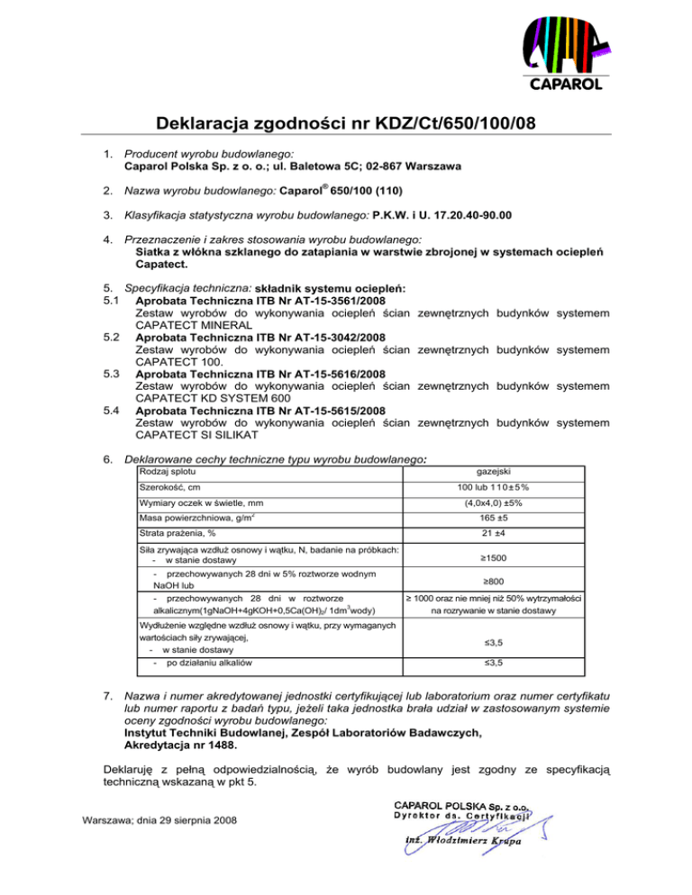 Deklaracja zgodności nr KDZ/Ct/650/100/08 1. Producent wyrobu budowlanego: Caparol Polska Sp. z o. o.; ul. Baletowa 5C; 02-867 Warszawa 2. Nazwa wyrobu budowlanego: Caparol® 650/100 (110) 3. Klasyfikacja statystyczna wyrobu budowlanego: P.K.W. i U. 17.20.40-90.00 4. Przeznaczenie i zakres stosowania wyrobu budowlanego: Siatka z włókna szklanego do zatapiania w warstwie zbrojonej w systemach ociepleń Capatect. 5. Specyfikacja techniczna: składnik systemu ociepleń: 5.1 Aprobata Techniczna ITB Nr AT-15-3561/2008 Zestaw wyrobów do wykonywania ociepleń ścian CAPATECT MINERAL 5.2 Aprobata Techniczna ITB Nr AT-15-3042/2008 Zestaw wyrobów do wykonywania ociepleń ścian CAPATECT 100. 5.3 Aprobata Techniczna ITB Nr AT-15-5616/2008 Zestaw wyrobów do wykonywania ociepleń ścian CAPATECT KD SYSTEM 600 5.4 Aprobata Techniczna ITB Nr AT-15-5615/2008 Zestaw wyrobów do wykonywania ociepleń ścian CAPATECT SI SILIKAT zewnętrznych budynków systemem zewnętrznych budynków systemem zewnętrznych budynków systemem zewnętrznych budynków systemem 6. Deklarowane cechy techniczne typu wyrobu budowlanego: Rodzaj splotu gazejski Szerokość, cm 100 lub 1 1 0 ± 5 % Wymiary oczek w świetle, mm Masa powierzchniowa, g/m (4,0x4,0) ±5% 2 165 ±5 Strata prażenia, % 21 ±4 Siła zrywająca wzdłuż osnowy i wątku, N, badanie na próbkach: - w stanie dostawy ≥1500 - przechowywanych 28 dni w 5% roztworze wodnym NaOH lub ≥800 - przechowywanych 28 dni w roztworze 3 alkalicznym(1gNaOH+4gKOH+0,5Ca(OH)2/ 1dm wody) ≥ 1000 oraz nie mniej niż 50% wytrzymałości na rozrywanie w stanie dostawy Wydłużenie względne wzdłuż osnowy i wątku, przy wymaganych wartościach siły zrywającej, - w stanie dostawy - po działaniu alkaliów ≤3,5 ≤3,5 7. Nazwa i numer akredytowanej jednostki certyfikującej lub laboratorium oraz numer certyfikatu lub numer raportu z badań typu, jeżeli taka jednostka brała udział w zastosowanym systemie oceny zgodności wyrobu budowlanego: Instytut Techniki Budowlanej, Zespół Laboratoriów Badawczych, Akredytacja nr 1488. Deklaruję z pełną odpowiedzialnością, że wyrób budowlany jest zgodny ze specyfikacją techniczną wskazaną w pkt 5. Warszawa; dnia 29 sierpnia 2008 ..................................