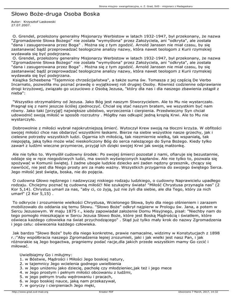 Strona misyjno- ewangelizacyjna, o. Z. Grad, SVD - misjonarz z Madagaskaru Słowo Boże-druga Osoba Boska Autor: Krzysztof Laskowski 27.07.2007. O. Grendel, przełożony generalny Misjonarzy Werbistow w latach 1932-1947, był przekonany, że nazwa "Zgromadzenie Słowa Bożego" nie została "wymyślona" przez Założyciela, ani "odkryta", ale została "dana i zasugerowana przez Boga" . Można się z tym zgodzić. Arnold Janssen nie miał czasu, by się zastanawiać bądź przeprowadzać teologiczne analizy nazwy, która nawet teologom z Kurii rzymskiej wydawała się być podejrzana. O. Grendel, przełożony generalny Misjonarzy Werbistow w latach 1932-1947, był przekonany, że nazwa "Zgromadzenie Słowa Bożego" nie została "wymyślona" przez Założyciela, ani "odkryta", ale została "dana i zasugerowana przez Boga" . Można się z tym zgodzić. Arnold Janssen nie miał czasu, by się zastanawiać bądź przeprowadzać teologiczne analizy nazwy, która nawet teologom z Kurii rzymskiej wydawała się być podejrzana. Książka Scheebena "Tajemnice chrześcijaństwa", a także suma św. Tomasza z jej częścią De Verbo Incarnato, pozwoliła mu poznać prawdę o wyjątkowej roli drugiej Osoby. Również codzienne odprawianie drogi krzyżowej, związało go uczuciowo z Osobą Jezusa, "który dla nas i dla naszego zbawienia zstąpił z nieba": "Wszystko otrzymaliśmy od Jezusa. Jako Bóg jest naszym Stworzycielem. Ale to Mu nie wystarczało. Pragnął się z nami jeszcze ściślej zjednoczyć. Chciał się stać naszym bratem, we wszystkim być nam równy. Jako taki [przyjął] największe ubóstwo, wyrzeczenia i cierpienia. Przedwieczny Syn chciał udowodnić swoją miłość w sposób rozrzutny . Mógłby nas odkupić jedną kroplą Krwi. Ale to Mu nie wystarczyło. Dobrowolnie z miłości wybrał najokrutniejszą śmierć. Wytoczył Krew swoją na tłoczni krzyża. W obfitości swojej miłości chce nas obdarzyć wszystkimi łaskami. Bierze na siebie wszystkie nasze grzechy, jak i cielesne potrzeby wszystkich ludzi. Ogarnia ich miłością, tak niezmiernie wielką, tak wspaniałą, tak niepojętą, jaką tylko może wlać nieskończony Bóg do serca należącego do Syna Bożego. Kiedy tylko zawarł z ludźmi wieczne przymierze, przyjął ich dzięki swojej Krwi jak swoją małżonkę. Ale nie tylko to. Wymyślił cudowny środek: Po swojej śmierci pozostał z nami, ofiaruje się bezustannie, oddaje się w ręce niegodziwych ludzi, ma swoich wyświęconych kapłanów. Ale nie tylko to, pozwala się spożywać w Komunii świętej. I żadne ubogie ludzkie dziecko ani żaden nędzny grzesznik, chcący się nawrócić, nie jest dla Niego prosty ani za mało ważny. Wszystkich przygarnia do swojego świętego Serca. Jego miłość jest święta, boska, nie do pojęcia. O cudowna Głowo nędznego i nadzwyczaj niskiego rodzaju ludzkiego, o cudowny Naprawicielu upadłego rodzaju. Chciejmy poznać tę cudowną miłość! Nie szukajmy świata! "Miłość Chrystusa przynagla nas" (2 Kor 5,14). Chrystus umarł za nas, "aby ci, co żyją, już nie żyli dla siebie, ale dla Tego, który za nich umarł" (2 Kor 5,15) . To odkrycie i zrozumienie wielkości Chrystusa, Wcielonego Słowa, było dla niego olśnieniem i zarazem mobilizowało do oddania się temu Słowu. "Słowo Boże" odkrył najpierw w Prologu św. Jana, a potem w Sercu Jezusowym. W maju 1875 r., kiedy zapowiadał założenie Domu Misyjnego, pisał: "Niechby nam do tego pomogło mieszkające w Sercu Jezusa Słowo Boże, które jest Boską Mądrością i światłem, które oświeca każdego człowieka na świat przychodzącego" . Stąd już tylko mały krok do nazwy Zgromadzenia i jego celu: oświecenia każdego człowieka. Jak bardzo "Słowo Boże" było dla niego konkretne, prawie namacalne, widzimy w Konstytucjach z 1898 r.:"Aby współbracia naszego Zgromadzenia lepiej zrozumieli, jaki i jak wielki jest nasz Pan, i jak różnorakie są Jego bogactwa, pragniemy podać racje,dla jakich przede wszystkim mamy Go czcić i miłować. Uwielbiajmy Go i miłujmy: 1. w Bóstwie, Mądrości i Miłości Jego boskiej natury, 2. w tajemnicy Jego wcielenia godnego uwielbienia 3. w Jego uniżeniu jako dziecię, pacholę czy młodzieniec,jak też i jego mece 4. w Jego prostym i pełnym miłości obcowaniu z ludźmi, 5. w jego pełnym trudu wędrowaniu i pracach, 6. w Jego boskiej nauce, jaką nam przekazywał, 7. w goryczy i cierpieniach Jego męki, http://www.grad.svd-mad.org Kreator PDF Utworzono 7 March, 2017, 14:32 Strona misyjno- ewangelizacyjna, o. Z. Grad, SVD - misjonarz z Madagaskaru 8. w miłości i we wszystkich cnotach Jego Serca najgodniejszego miłości, 9. w pełnej podziwu tajemnicy Ołtarza, 10. w założeniu Kościoła, nabytego Jego krwią, 11. w Jego chwale zmartwychwstania,wniebowstąpienia i zesłania Ducha Swiętego, 12. w Jego wieczyście potrójnym urzędzie,poprzez który nas nieustannie poucza,wynagradza i kieruje jako nauczyciel,kapłan i Król nasz na wieki. Ze zrozumienia Słowa Bożego wynika wielka cześć Arnolda Janssena dla modlitwy "Anioł Pański", święta Zwiastowania Pańskiego, Narodzenia Pańskiego, Dziecięctwa Bożego (wzruszająca jest modlitwawezwanie, niegdyś dodawane do modlitw porannych: "Przez Twoje święte Dziecięctwo, zlituj się nad biednymi dziećmi pogańskimi"), Najświętszego Serca Jezusowego i Eucharystii. Stąd jego gorące wołanie: "Przed światłością Słowa i duchem łaski niech ustąpią mroki grzechu i noc niewiary! " http://www.grad.svd-mad.org Kreator PDF Utworzono 7 March, 2017, 14:32
