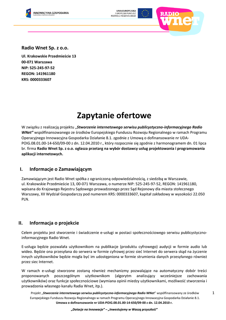 Radio Wnet Sp. z o.o. Ul. Krakowskie Przedmieście 13 00-071 Warszawa NIP: 525-245-97-52 REGON: 141961180 KRS: 0000333607 Zapytanie ofertowe W związku z realizacją projektu „Stworzenie internetowego serwisu publicystyczno-informacyjnego Radio WNet” współfinansowanego ze środków Europejskiego Funduszu Rozwoju Regionalnego w ramach Programu Operacyjnego Innowacyjna Gospodarka Działanie 8.1. zgodnie z Umową o dofinansowanie nr UDAPOIG.08.01.00-14-650/09-00 z dn. 12.04.2010 r., który rozpocznie się zgodnie z harmonogramem dn. 01 lipca br. firma Radio Wnet Sp. z o.o. ogłasza przetarg na wybór dostawcy usług projektowania i programowania aplikacji internetowych. I. Informacje o Zamawiającym Zamawiającym jest Radio Wnet spółka z ograniczoną odpowiedzialnością, z siedzibą w Warszawie, ul. Krakowskie Przedmieście 13, 00-071 Warszawa, o numerze NIP: 525-245-97-52, REGON: 141961180, wpisana do Krajowego Rejestru Sądowego prowadzonego przez Sąd Rejonowy dla miasta stołecznego Warszawy, XII Wydział Gospodarczy pod numerem KRS: 0000333607, kapitał zakładowy w wysokości 22.050 PLN. II. Informacja o projekcie Celem projektu jest stworzenie i świadczenie e-usługi w postaci społecznościowego serwisu publicystycznoinformacyjnego Radio Wnet. E-usługa będzie pozwalała użytkownikom na publikacje (produktu cyfrowego) audycji w formie audio lub wideo. Będzie ona przesyłana do serwera w formie cyfrowej przez sied Internet do serwera skąd na życzenie innych użytkowników będzie mogła byd im udostępniona w formie strumienia danych przesyłanego również przez siec Internet. W ramach e-usługi stworzone zostaną również mechanizmy pozwalające na automatyczny dobór treści proponowanych poszczególnym użytkownikom (algorytm analizujący wcześniejsze zachowania użytkowników) oraz funkcje społecznościowe (wymiana opinii miedzy użytkownikami, możliwośd stworzenia i prowadzenia własnego kanału Radia Wnet, itp.). Projekt „Stworzenie internetowego serwisu publicystyczno-informacyjnego Radio WNet” współfinansowany ze środków Europejskiego Funduszu Rozwoju Regionalnego w ramach Programu Operacyjnego Innowacyjna Gospodarka Działanie 8.1. Umowa o dofinansowanie nr UDA-POIG.08.01.00-14-650/09-00 z dn. 12.04.2010 r. „Dotacje na Innowacje” – „Inwestujemy w Waszą przyszłość” 1 III. Przedmiot zapytania ofertowego Radio Wnet w celu realizacji projektu zamierza zatrudnid zespół specjalistów w zakresie projektowania oraz implementacji aplikacji internetowych, który będzie we współpracy z kierownikiem projektu ze strony Radia Wnet realizował zadania mające na celu stworzenie systemu informatycznego, w oparciu o który świadczona będzie e- usługa Radio Wnet. System ten będzie udostępniany poprzez sied internet za pomocą przeglądarki internetowej, stąd przewiduje się jego implementację w przystosowanych do tego celu technologiach takich jak HTML, CSS, JavaScript, HTTP. Przewiduje się, że system powstanie w jednym z następujących języków programowania: C#. Java, PHP, Python lub Ruby. Koocowy wybór języka programowania oraz technologii informatycznych w oparciu, o które zostanie zbudowany system informatyczny Radia Wnet zostanie dokonany w ramach prac projektowych we współpracy z wybranym wykonawcą. Przewidywane zapotrzebowanie na powyższe prace wynosi ok. 3100 osobo godzin w okresie od 15-go lipca 2010 do 30-go czerwca 2011. Planowane jest, że system e-usługi Radio Wnet będzie udostępniał co najmniej następujące moduły: IV. moduł pozwalający użytkownikom na publikacje własnych produktów cyfrowych w tym poprzez przesyłanie strumienia danych (streaming) moduł zarządzania zgromadzoną treścią moduł odpowiadający za transmisję strumieni danych z treścią cyfrową moduł zarządzania kontami i profilami użytkowników moduł subskrypcji i komunikacji z użytkownikami pozwalający na subskrypcje treści cyfrowych w określonych kategoriach moduł społecznościowy pozwalający na wymianę opinii pomiędzy użytkownikami moduł automatycznego doboru treści użytkownika na podstawie jego preferencji badanych poprzez analizę jego zachowao moduł zarządzania treścią serwisu (CMS) moduł płatności pozwalający na realizacje płatności (np. abonament za płatna treśd) w sposób zdalny (planuje sie realizacje tej funkcjonalności poprzez integracje z zewnętrznymi systemami płatności) Wymogi formalne 1) Dla potrzeb realizacji niniejszego zamówienia Wykonawca wydeleguje jedną osobę do kontaktu, która posiadad będzie odpowiednie upoważnienie do prowadzenia negocjacji oraz ustalania danych w zakresie objętym przedmiotem zamówienia i umowy. 2) Wykonawca będzie zobowiązany do przekazania Zamawiającemu pełnej dokumentacji oraz wszelkich informacji mających znaczenie dla prawidłowego korzystania przez Zamawiającego z projektu, w tym jego modyfikowania i dostosowywania do własnych potrzeb. 3) Oferta powinna zostad przygotowana na formularzu ofertowym stanowiącym Załącznik nr 1 do niniejszego Zapytania Ofertowego, podpisana przez osobę/y upoważnioną/e do reprezentacji Oferenta zgodnie z dokumentem rejestrowym lub załączonym pełnomocnictwem. Projekt „Stworzenie internetowego serwisu publicystyczno-informacyjnego Radio WNet” współfinansowany ze środków Europejskiego Funduszu Rozwoju Regionalnego w ramach Programu Operacyjnego Innowacyjna Gospodarka Działanie 8.1. Umowa o dofinansowanie nr UDA-POIG.08.01.00-14-650/09-00 z dn. 12.04.2010 r. „Dotacje na Innowacje” – „Inwestujemy w Waszą przyszłość” 2 4) Do Oferty należy załączyd kopię aktualnego dokumentu rejestrowego potwierdzoną za zgodnośd z oryginałem przez osobę/y upoważnioną do reprezentacji. 5) Oferta wraz z załącznikami powinna zostad dostarczona drogą elektroniczną (w formie skanu) na adres e-mail: [email protected] lub w oryginale bezpośrednio do siedziby Zamawiającego – Radio Wnet Sp. z o