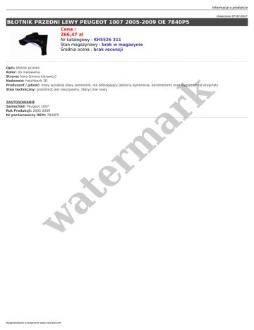 Informacje o produkcie Utworzono 07-03-2017 BŁOTNIK PRZEDNI LEWY PEUGEOT 1007 2005-2009 OE 7840P5 Cena : 266,47 zł Nr katalogowy : KH5526 311 Stan magazynowy : brak w magazynie Średnia ocena : brak recenzji w at ZASTOSOWANIE Samochód: Peugeot 1007 Rok Produkcji: 2005-2009 Nr porównawczy OEM: 7840P5 er m ar k Opis: błotnik przedni Kolor: do malowania Strona: lewa (strona kierowcy) Nadwozie: hatchback 3D Producent / jakość: nowy wysokiej klasy zamiennik, nie odbiegający jakością wykonania, parametrami oraz wyglądem od oryginału Stan techniczny: przedmiot jest nieużywany, fabrycznie nowy Wygenerowano w programie www.oscGold.com
