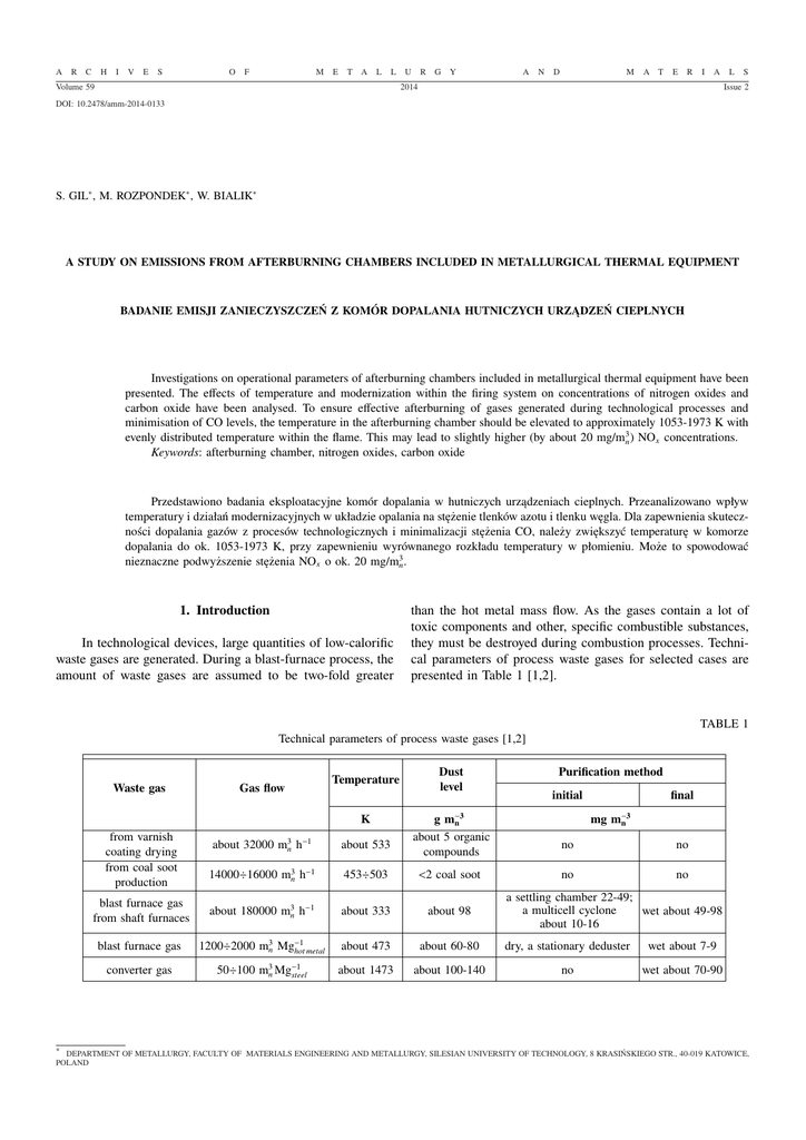 A R C H I V E S O F M E T A L L Volume 59 U R G Y A N D M A T E R I A 2014 L S Issue 2 DOI: 10.2478/amm-2014-0133 S. GIL∗ , M. ROZPONDEK∗ , W. BIALIK∗ A STUDY ON EMISSIONS FROM AFTERBURNING CHAMBERS INCLUDED IN METALLURGICAL THERMAL EQUIPMENT BADANIE EMISJI ZANIECZYSZCZEŃ Z KOMÓR DOPALANIA HUTNICZYCH URZĄDZEŃ CIEPLNYCH Investigations on operational parameters of afterburning chambers included in metallurgical thermal equipment have been presented. The effects of temperature and modernization within the firing system on concentrations of nitrogen oxides and carbon oxide have been analysed. To ensure effective afterburning of gases generated during technological processes and minimisation of CO levels, the temperature in the afterburning chamber should be elevated to approximately 1053-1973 K with evenly distributed temperature within the flame. This may lead to slightly higher (by about 20 mg/m3n ) NOx concentrations. Keywords: afterburning chamber, nitrogen oxides, carbon oxide Przedstawiono badania eksploatacyjne komór dopalania w hutniczych urządzeniach cieplnych. Przeanalizowano wpływ temperatury i działań modernizacyjnych w układzie opalania na stężenie tlenków azotu i tlenku węgla. Dla zapewnienia skuteczności dopalania gazów z procesów technologicznych i minimalizacji stężenia CO, należy zwiększyć temperaturę w komorze dopalania do ok. 1053-1973 K, przy zapewnieniu wyrównanego rozkładu temperatury w płomieniu. Może to spowodować nieznaczne podwyższenie stężenia NOx o ok. 20 mg/m3n . 1. Introduction In technological devices, large quantities of low-calorific waste gases are generated. During a blast-furnace process, the amount of waste gases are assumed to be two-fold greater than the hot metal mass flow. As the gases contain a lot of toxic components and other, specific combustible substances, they must be destroyed during combustion processes. Technical parameters of process waste gases for selected cases are presented in Table 1 [1,2]. TABLE 1 Technical parameters of process waste gases [1,2] Waste gas Gas flow Temperature K ∗ Dust level g m−3 n about 5 organic compounds Purification method initial final mg m−3 n from varnish coating drying from coal soot production about 32000 m3n h−1 about 533 14000÷16000 m3n h−1 453÷503 <2 coal soot blast furnace gas from shaft furnaces about 180000 m3n h−1 about 333 about 98 blast furnace gas 1200÷2000 m3n Mg−1 hot metal about 473 about 60-80 dry, a stationary deduster wet about 7-9 converter gas 50÷100 m3n Mg−1 steel about 1473 about 100-140 no wet about 70-90 no no no no a settling chamber 22-49; a multicell cyclone wet about 49-98 about 10-16 DEPARTMENT OF METALLURGY, FACULTY OF MATERIALS ENGINEERING AND METALLURGY, SILESIAN UNIVERSITY OF TECHNOLOGY, 8 KRASIŃSKIEGO STR., 40-019 KATOWICE, POLAND 786 The calorific values of afterburning-subjected gases from technological processes (Table 2), e.g. from coating plant dryers, are low and do not ensure auto-thermal combustion [1,2]. Therefore, afterburning chambers must be additionally equipped with burners for enriched fuel combustion. Sizes of combustion and afterburning chambers depend on flows and parameters of technological waste gases as well as on environmental requirements, i.e. pollutant emission limits. In most cases, geometrical parameters of the chambers can be determined based on assumed volumetric thermal load and surface heat-flow intensity values. TABLE 2 Methods of process waste gas management [1,2] Waste gas Calorific value Management method MJ/m3n co-combustion from varnish coating drying <1.34 natural gas from coal soot production 1.5÷1.9 natural gas blast furnace gas from shaft furnaces 1.8÷2.2 blast furnace gas 2.5÷3.2 converter gas about 6 high-nitrogen natural gas (hard coal) gases: converter, enriched fuels, hard coal with enriched gases and coal dust a thermal device an afterburning chamber – domestic hot water (DHW) production an afterburning chamber – DHW production stoker-fired boilers heating furnaces, hot-blast stoves, double-fuel boilers recovery boilers, double-fuel boilers As the primary objective of afterburning processes is effective and economical destruction of pollutants (not thermal energy production for technological processes), lower qV◦ and q◦A limit values from Table 3 can be assumed [3,4]. TABLE 3 Recommended thermal load values for combustion chambers [3,4] Furnace type multi-layer furnace with a travelling-grate stoker a pulverised coal-fired furnace boiler furnaces heating furnaces recovery boilers** Volumetric thermal load – qV◦ Intensity of heat-flow – q◦A kW m−3 kW m−2 250 – 300 1 000 – 2 000 150 – 250 2 000 – 4 000 300 – 350 3 000 – 5 000 100 – 300 * 200 – 230 8 000 – 9 000 Notes The value basically depends on the technological process parameters. *depending on the zone **radiative – convective Afterburning chambers are usually cylindrical. Their length and cross-section surface area are mainly determined by the time necessary for the reagents to remain within the recom- mended temperature zone, which is required for contaminant destruction [5]. The minimum length of time to remain in the chambers and the component afterburning is 0.3 to 1 sec. Afterburning emissions can be effectively reduced by means of the primary methods. 2. Identification of the technological process and the operating parameters of afterburners For better resistance to corrosion, steel (and aluminium) sheets are coated with paints and enamels. The coatings are placed over hot-dip galvanised, previously degreased and chemically treated, steel strip with the use of a so-called coil coating method. The analysed technological line consisted of a 4-zone continuous drying furnace and co-operative combustion and afterburning chambers. The drying process results in required mechanical and operational parameters of steel sheets, while soluble fractions of varnishes undergo evaporati