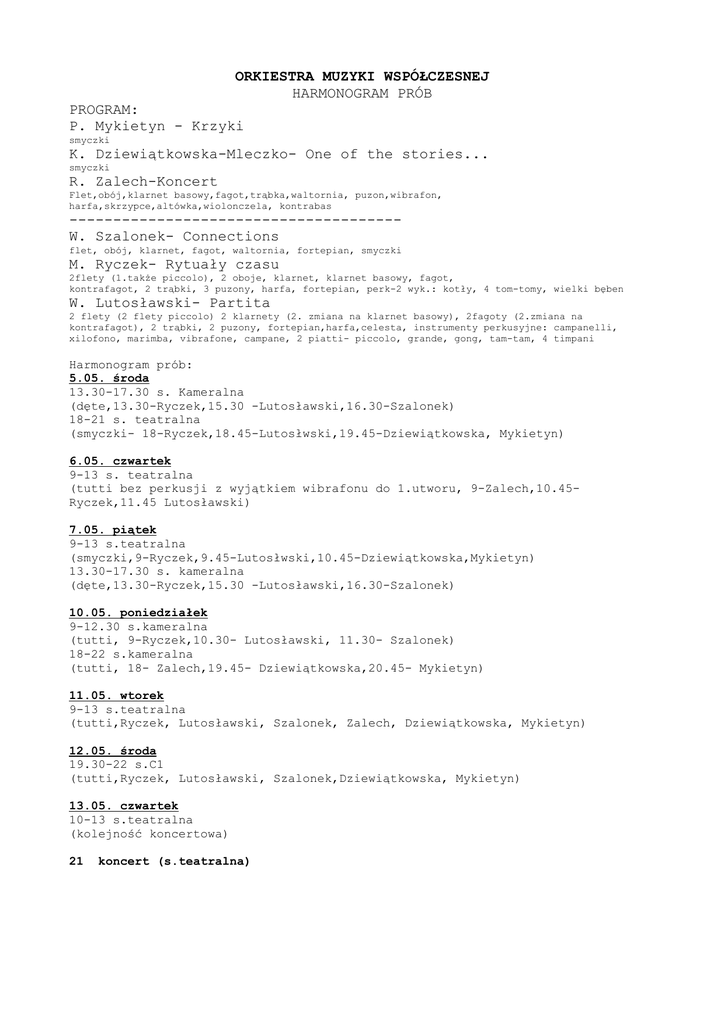 ORKIESTRA MUZYKI WSPÓŁCZESNEJ HARMONOGRAM PRÓB PROGRAM: P. Mykietyn - Krzyki smyczki K. Dziewiątkowska-Mleczko- One of the stories... smyczki R. Zalech-Koncert Flet,obój,klarnet basowy,fagot,trąbka,waltornia, puzon,wibrafon, harfa,skrzypce,altówka,wiolonczela, kontrabas -------------------------------------W. Szalonek- Connections flet, obój, klarnet, fagot, waltornia, fortepian, smyczki M. Ryczek- Rytuały czasu 2flety (1.także piccolo), 2 oboje, klarnet, klarnet basowy, fagot, kontrafagot, 2 trąbki, 3 puzony, harfa, fortepian, perk-2 wyk.: kotły, 4 tom-tomy, wielki bęben W. Lutosławski- Partita 2 flety (2 flety piccolo) 2 klarnety (2. zmiana na klarnet basowy), 2fagoty (2.zmiana na kontrafagot), 2 trąbki, 2 puzony, fortepian,harfa,celesta, instrumenty perkusyjne: campanelli, xilofono, marimba, vibrafone, campane, 2 piatti- piccolo, grande, gong, tam-tam, 4 timpani Harmonogram prób: 5.05. środa 13.30-17.30 s. Kameralna (dęte,13.30-Ryczek,15.30 -Lutosławski,16.30-Szalonek) 18-21 s. teatralna (smyczki- 18-Ryczek,18.45-Lutosłwski,19.45-Dziewiątkowska, Mykietyn) 6.05. czwartek 9-13 s. teatralna (tutti bez perkusji z wyjątkiem wibrafonu do 1.utworu, 9-Zalech,10.45Ryczek,11.45 Lutosławski) 7.05. piątek 9-13 s.teatralna (smyczki,9-Ryczek,9.45-Lutosłwski,10.45-Dziewiątkowska,Mykietyn) 13.30-17.30 s. kameralna (dęte,13.30-Ryczek,15.30 -Lutosławski,16.30-Szalonek) 10.05. poniedziałek 9-12.30 s.kameralna (tutti, 9-Ryczek,10.30- Lutosławski, 11.30- Szalonek) 18-22 s.kameralna (tutti, 18- Zalech,19.45- Dziewiątkowska,20.45- Mykietyn) 11.05. wtorek 9-13 s.teatralna (tutti,Ryczek, Lutosławski, Szalonek, Zalech, Dziewiątkowska, Mykietyn) 12.05. środa 19.30-22 s.C1 (tutti,Ryczek, Lutosławski, Szalonek,Dziewiątkowska, Mykietyn) 13.05. czwartek 10-13 s.teatralna (kolejność koncertowa) 21 koncert (s.teatralna) PRZYDZIAŁY DO POSZCZEGÓLNYCH UTWORÓW skrzypce I Aleksandra Pawłowska(Mykietyn,Dziewiątkowska,Zalech,Szalonek,Ryczek,Lutosławski) Dariusz Jakubczyk (Mykietyn,Dziewiątkowska,Szalonek,Ryczek, Lutosławski) Aleksandra Buczek (Mykietyn,Dziewiątkowska,Szalonek,Ryczek,Lutosławski) Anna Mianowska (Mykietyn,Dziewiątkowska,Szalonek,Ryczek,Lutosławski) skrzypce II Hanna Wranik (Mykietyn,Dziewiątkowska,Szalonek,Ryczek,Lutosławski) Marzena Malinowska (Mykietyn,Dziewiątkowska,Szalonek,Ryczek,Lutosławski) Adam Ługowski (Mykietyn,Dziewiątkowska,Szalonek,Ryczek,Lutosławski) Katarzyna Ilnicka (Mykietyn,Dziewiątkowska,Szalonek,Ryczek,Lutosławski) altówki Ewa Hofman (Mykietyn,Dziewiątkowska,Zalech,Szalonek,Ryczek,Lutosławski) Daria Ujejska (Mykietyn,Dziewiątkowska,Szalonek,Ryczek,Lutosławski) Magdalena Miłaszewicz (Szalonek,Ryczek,Lutosławski) Barbara Sławińska (Szalonek,Ryczek,Lutosławski) Paulina Lulek (Mykietyn,Dziewiątkowska,Szalonek,Ryczek,Lutosławski) wiolonczele Magdalena Rapcia (Mykietyn,Dziewiątkowska,Szalonek,Ryczek,Lutosławski) Judyta Gąsior (Mykietyn,Dziewiątkowska,Szalonek,Ryczek,Lutosławski) Anna Wilk (Mykietyn,Dziewiątkowska,Zalech,Szalonek,Ryczek,Lutosławski) kontrabasy Wojciech Kowcz (Mykietyn,Dziewiątkowska,Zalech,Szalonek,Ryczek,Lutosławski) flety Bogumiła Gruszczyńska (Szalonek,Ryczek,Lutosławski) Izabela Książyk (Zalech,Ryczek,Lutosławski) oboje Monika Koźluk (Zalech,Ryczek) Urszula Szostak (Szalonek,Ryczek) klarnety Miłosz Kula (Zalech,Ryczek,Lutosławski) Marek Gawliński (Szalonek,Ryczek,Lutosławski) fagoty Bartosz Kwasecki (Zalech) Dobromir Guzewicz (Szalonek,Ryczek,Lutosławski) Andrzej Górniak (Ryczek,Lutosławski) waltornie Paweł Kamieniak (Zalech,Ryczek) Jakub Wojtaś (Szalonek,Ryczek) ............... (Ryczek) ............... (Ryczek) trąbki Jędrzej Tomczyk (Zalech,Ryczek,Lutosławski) ............... (Ryczek,Lutosławski) puzony ............... (Zalech,Ryczek,Lutosławski) ............... (Ryczek,Lutosławski) ............... (Ryczek) perkusja Arkadiusz Kątny (Zalech,Ryczek,Lutosławski) Shoko Sakai (Lutosławski) Velislav Godzhunov (Ryczek,Lutosławski) fortepian Krzysztof Stefański (Szalonek,Ryczek,Lutosławski) harfa Aleksandra Pindras (Zalech,Ryczek,Lutosławski)