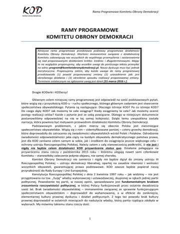 Rama Programowa Komitetu Obrony Demokracji RAMY PROGRAMOWE KOMITETU OBRONY DEMOKRACJI Niniejsza rama programowa przedstawia podstawy programowe działalności Komitetu Obrony Demokracji. Wartości immanentnie związane z działalnością Komitetu zobowiązują nas wszystkich do wspólnego przemyślenia i zastanowienia się nad proponowanymi działaniami krótko- średnio- i długoterminowymi. Mając to na względzie proponujemy, aby wszelkie uwagi do poniższego tekstu przesyłać na adres [email protected]. Nasza dyskusja musi być jednak merytoryczna. Proponujemy zatem, aby każda uwaga do ramy programowej przedstawiała (1) powód proponowanej zmiany (2) uzasadnienie jaki jest określonego działania i (3) określenie sposobu realizacji proponowanej zmiany. Terminem ostatecznym na zgłaszanie uwag jest dzień [31 marca 2016 r.]. Drogie KODerki i KODerzy! Głównym celem niniejszej ramy programowej jest odpowiedź na sześć podstawowych pytań, które wiążą się z przyszłością KOD-u - ruchu społecznego, którego głównym zadaniem jest stworzenie społeczeństwa obywatelskiego. Pytania są następujące: Dlaczego istnieje KOD? Po co istnieje KOD? Do czego dąży KOD? Jak możemy te cele osiągnąć? Kiedy osiągniemy te cele? Jak możemy ocenić postęp realizacji celów? Każde z pytanie jest ze sobą powiązane. Dlatego w niniejszym dokumencie postanowiliśmy odpowiedzieć na nie w tej samej kolejności. Dzięki temu uwypuklona została narracja, która powinna być motywem przewodnim działalności Komitetu Obrony Demokracji. Podstawowym problemem, z jakim mierzy się obecnie Polska jest nieistniejące społeczeństwo obywatelskie. Wiążą się z nim – zidentyfikowane poniżej – cztery grzechy demokracji, które doprowadziły do zatracenia się świadomości obywatelskich wśród Polek i Polaków. Odrodzenie świadomości odpowiedzialności jaka ciąży na każdym obywatelu demokratycznego państwa prawa, jest dla KOD zarówno celem samym w sobie, jak i środkiem do osiągnięcia jeszcze większego celu – ochrony ustroju Rzeczypospolitej Polskiej. Należy zatem z całą stanowczością podkreślić, iż nie jest i nigdy nie będzie celem działalności KOD przywrócenie status quo. Działanie polegające na przywróceniu stanu rzeczy z października 2015 roku – któremu ulegają nawet sami członkowie Komitetu – stanowiłoby zaleczenie jedynie objawu, nie samej choroby. Komitet Obrony Demokracji nie zamierza i nigdy nie będzie dążył do zmiany ustroju III Rzeczypospolitej Polskiej – ustroju demokracji liberalnej, opartej na zasadzie równości i wolności wszystkich obywateli, gwarantującej prawa podstawowe. KOD zawsze będzie popierał naszą przynależność do Rady Europy i Unii Europejskiej. Konstytucja Rzeczypospolitej Polskiej z dnia 2 kwietnia 1997 roku – jak widzimy – nie jest przygotowana na tzw. „fuzję” władzy wykonawczej i ustawodawczej, skupionej w rękach jednej partii politycznej. Powodzenie tej partii, w naszej opinii, spowodowane jest fundamentalnym brakiem zrozumienia rzeczywistości politycznej, w której Polacy funkcjonowali przez ostatnie dwadzieścia sześć lat. Brak świadomości obywatelskiej – immanentnie związanej ze sprawnie funkcjonującym społeczeństwem obywatelskim – doprowadził do wyhamowania, a w efekcie do zaniknięcia, elementarnej kultury prawnej dyskursu i działań politycznych. Z tego też powodu brak kultury prawnej doprowadził w ostatnich miesiącach do nadużycia władzy, którą partia rządząca zdobyła w wyborach. My mówimy takiemu stanu rzeczy dość. 1 Rama Programowa Komitetu Obrony Demokracji Postulaty Komitetu Obrony Demokracji I. UTWORZENIE SPOŁECZEŃSTWA OBYWATELSKIEGO Nie istnieje demokracja liberalna bez obywateli, którzy dbają o uniwersalne wartości, dzięki którym różne światopoglądy mogą koegzystować w jednym państwie. NIE dla neutralności. TAK dla dyskursu i wzmacniania legitymacji państwa i prawa poprzez akceptację pluralizmu i różnorodności. II. ZROZUMIENIE DEMOKRACJI Nie może istnieć demokracja, w której obywatele – adresaci praw – nie czują się jednocześnie autorami praw, którym podlegają. TAK dla zrozumienia mechanizmów funkcjonowania demokratycznego państwa prawa. NIE dla gnuśności i zobojętnienia obywateli! III. OBRONA KONSTYTUCJI Demokracja konstytucyjna nie może istnieć bez świadomych obywateli, którzy znają swoje prawa i obowiązki, a także są świadomi ciężaru odpowiedzialności, który na nich spoczywa. TAK dla zachowania ustroju III Rzeczypospolitej Polskiej. NIE dla zburzenia jej fundamentów za jakąkolwiek cenę. IV. OCHRONA NIEZALEŻNOŚCI TRYBUNAŁU Konstytucja nie może istnieć bez obywateli, którzy nie rozumieją sposobów jej funkcjonowania i polityków, którzy traktują Konstytucję elementarnie. TAK dla Trybunału, który gwarantuje, że Konstytucja jest trwałym źródłem prawa. NIE dla instrumentalnego wykorzystania jej zapisów i łamania jej przez uchwalane ustawy. V. ŚLUBOWANIE KONSTYTUCYJNIE WYBRANYCH SĘDZIÓW TRYBUNAŁU KONSTYTUCYJNEGO Jako obywatele żywo zainteresowani obroną demokracji konstytucyjnej musimy wymagać, aby władza wykonawcza podporządkowała się woli społeczeństwa odzwierciedlonej w obowiązującej Konstytucji. DOPILNUJEMY, aby Prezydent Andrzej Duda odebrał przysięgę od trzech konstytucyjnie wybranych sędziów Trybunału! VI. PLURALIZM MEDIÓW PUBLICZNYCH Nie wszyscy Polacy mają dostęp do zdywersyfikowanego źródła informacji. Często jedynym źródłem są polskie stacje telewizyjne i radiowe. NIE DOPUŚCIMY, aby przekaz w nich zawarty był interpretacją rzeczywistości jednego człowieka lub jednej partii politycznej. VII. PRZYWRÓCENIE APOLITYCZNOŚCI I OTWARTOŚCI SŁUŻBY CYWILNEJ VIII. DOPROWADZENIE DO ODPOWIEDZIALNOŚCI KONSTYTUCYJNEJ PRZEDSTAWICIELI NACZELNYCH ORGANÓW PAŃSTWOWYCH PRZYPILNUJEMY, aby każda osoba wykonująca najwyższe funkcje w państwie został