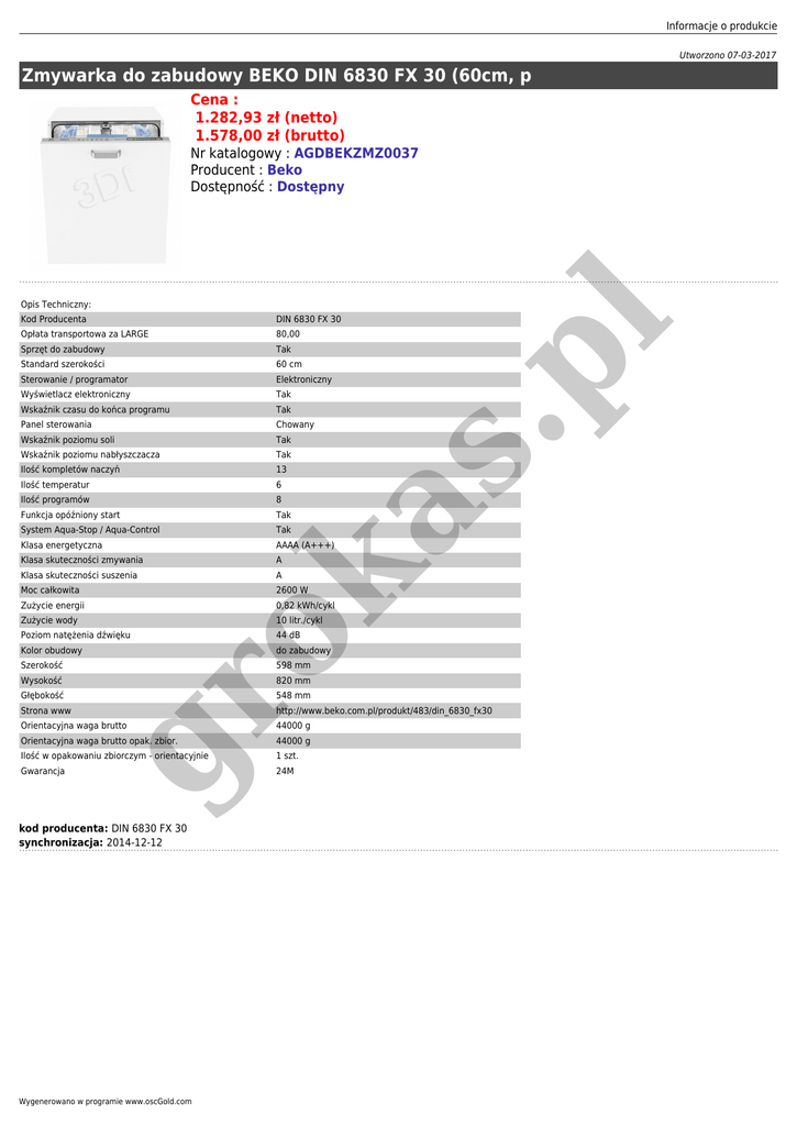 Informacje o produkcie Utworzono 07-03-2017 Zmywarka do zabudowy BEKO DIN 6830 FX 30 (60cm, p Cena : 1.282,93 zł (netto) 1.578,00 zł (brutto) Nr katalogowy : AGDBEKZMZ0037 Producent : Beko Dostępność : Dostępny DIN 6830 FX 30 Opłata transportowa za LARGE 80,00 Sprzęt do zabudowy Tak Standard szerokości 60 cm Sterowanie / programator Elektroniczny Wyświetlacz elektroniczny Tak Wskaźnik czasu do końca programu Tak Panel sterowania Chowany Wskaźnik poziomu soli Tak Wskaźnik poziomu nabłyszczacza Tak Ilość kompletów naczyń 13 Ilość temperatur 6 Ilość programów 8 Funkcja opóźniony start Tak System Aqua-Stop / Aqua-Control Tak Klasa energetyczna AAAA (A+++) Klasa skuteczności zmywania A Moc całkowita Zużycie energii Zużycie wody Poziom natężenia dźwięku Kolor obudowy Szerokość Wysokość A 2600 W 0,82 kWh/cykl 10 litr./cykl 44 dB do zabudowy 598 mm 820 mm 548 mm gr Głębokość ok Klasa skuteczności suszenia as Kod Producenta .p l Opis Techniczny: Strona www http://www.beko.com.pl/produkt/483/din_6830_fx30 Orientacyjna waga brutto 44000 g Orientacyjna waga brutto opak. zbior. 44000 g Ilość w opakowaniu zbiorczym - orientacyjnie 1 szt. Gwarancja 24M kod producenta: DIN 6830 FX 30 synchronizacja: 2014-12-12 Wygenerowano w programie www.oscGold.com
