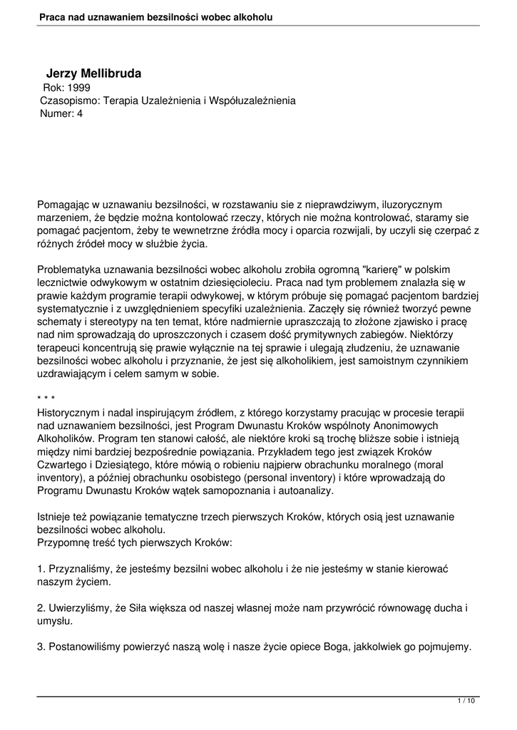 Praca nad uznawaniem bezsilności wobec alkoholu Jerzy Mellibruda Rok: 1999 Czasopismo: Terapia Uzależnienia i Współuzależnienia Numer: 4 Pomagając w uznawaniu bezsilności, w rozstawaniu sie z nieprawdziwym, iluzorycznym marzeniem, że będzie można kontolować rzeczy, których nie można kontrolować, staramy sie pomagać pacjentom, żeby te wewnetrzne źródła mocy i oparcia rozwijali, by uczyli się czerpać z różnych źródeł mocy w służbie życia. Problematyka uznawania bezsilności wobec alkoholu zrobiła ogromną "karierę" w polskim lecznictwie odwykowym w ostatnim dziesięcioleciu. Praca nad tym problemem znalazła się w prawie każdym programie terapii odwykowej, w którym próbuje się pomagać pacjentom bardziej systematycznie i z uwzględnieniem specyfiki uzależnienia. Zaczęły się również tworzyć pewne schematy i stereotypy na ten temat, które nadmiernie upraszczają to złożone zjawisko i pracę nad nim sprowadzają do uproszczonych i czasem dość prymitywnych zabiegów. Niektórzy terapeuci koncentrują się prawie wyłącznie na tej sprawie i ulegają złudzeniu, że uznawanie bezsilności wobec alkoholu i przyznanie, że jest się alkoholikiem, jest samoistnym czynnikiem uzdrawiającym i celem samym w sobie. *** Historycznym i nadal inspirującym źródłem, z którego korzystamy pracując w procesie terapii nad uznawaniem bezsilności, jest Program Dwunastu Kroków wspólnoty Anonimowych Alkoholików. Program ten stanowi całość, ale niektóre kroki są trochę bliższe sobie i istnieją między nimi bardziej bezpośrednie powiązania. Przykładem tego jest związek Kroków Czwartego i Dziesiątego, które mówią o robieniu najpierw obrachunku moralnego (moral inventory), a później obrachunku osobistego (personal inventory) i które wprowadzają do Programu Dwunastu Kroków wątek samopoznania i autoanalizy. Istnieje też powiązanie tematyczne trzech pierwszych Kroków, których osią jest uznawanie bezsilności wobec alkoholu. Przypomnę treść tych pierwszych Kroków: 1. Przyznaliśmy, że jesteśmy bezsilni wobec alkoholu i że nie jesteśmy w stanie kierować naszym życiem. 2. Uwierzyliśmy, że Siła większa od naszej własnej może nam przywrócić równowagę ducha i umysłu. 3. Postanowiliśmy powierzyć naszą wolę i nasze życie opiece Boga, jakkolwiek go pojmujemy. 1 / 10 Praca nad uznawaniem bezsilności wobec alkoholu W Pierwszym Kroku zawarte jest uznanie podstawowych faktów występujących w życiu osoby uzależnionej - bezsilności i utraty zdolności do kierowania własnym życiem. Krok Drugi poszerza to i mówi, że wprawdzie uznaliśmy własną bezsilność, ale siła jest wokół nas, i może być z nami, tylko trzeba po nią sięgnąć. Krok Trzeci jest bardziej zaawansowany - wyraźnie mówi, że ważne jest nie tylko uznanie własnego uzależnienia i własnej niemocy, i nie tylko uwierzenie, że blisko nas jest moc, która może uzdrowić, ale zdobycie się na wysiłek, żeby powierzyć się, oddać opiece Boga. Zdaniem wielu osób praca nad Trzecim Krokiem bez osobowego wyobrażenia Boga jest dość abstrakcyjna, chociaż dla unikania sporu z osobami niewierzącymi lub wątpiącymi na ogół o tym się nie mówi. Warto pamiętać o źródle, z którego wyłoniło się rozpoznanie znaczenia problemu uznawania bezsilności oraz o współpracy ze środowiskiem, w którym Program Dwunastu Kroków jest fundamentem walki o trzeźwość. Jednak w profesjonalnej psychoterapii uzależnienia, w której strategia pracy nad uznawaniem bezsilności wobec alkoholu jest czymś niezwykle ważnym, praca nad tym problemem to nie jest po prostu "przerabianie" Pierwszego Kroku. Niezwykle istotnym elementem problemu uznawania bezsilności jest sprawa rozpoznania klęski życiowej, osobistej porażki i zdania sobie sprawy z własnego upadku. Wyraźne i ważne są odniesienia religijne i musimy pamiętać, że z praktyk i doświadczeń religijnych wywiodło się całe AA. Twórca AA , Bill W., swoje zasadnicze inspiracje całego Programu uzyskał w ruchu odnowy i transformacji duchowej, religijnej czyli w Grupach Oxfordzkich. Były one bardzo ważnym i rozwijającym się w latach dwudziestych naszego wieku nurtem poszukiwań chrześcijańskich - protestanckich, w których wizja załamania i klęski życiowej była punktem startowym do głębokiej przemiany duchowej. W protestanckim chrześcijaństwie niezwykle ważnym momentem było wyznanie we wspólnocie religijnej swojej winy i grzechu, spotkanie się ze swym upadkiem i rozpoczęcie gruntownej przemiany własnego życia. Odniesienia religijne są tu bardzo istotne, bo w oparciu o nie zbudowany jest podstawowy mechanizm przemiany, która jest przemianą wewnętrzną, duchową. Stanowi ona odpowiednik nawrócenia czyli konwersji religijnej tzn. głębokiej przemiany człowieka, który na swojej drodze stracił kontakt z Bogiem, ale którego udziałem może stać się nadzieja, jeżeli zobaczy dno swego upadku i zrozumie, że nie ma dalszej drogi, że czas zawrócić i ponownie zwrócić się ku Bogu. Takie są korzenie i istota sprawy uznawania bezsilności na gruncie doświadczeń wspólnoty wzajemnej pomocy w uzyskiwaniu trzeźwości. Jest to bardzo poważne wyzwanie dla ludzi realizujących Program Dwunastu Kroków, bo chodzi o coś więcej niż żeby tylko nie pić. *** AA miało na początku problemy z wątkiem sięgania dna, bo w pierwotnej wersji upadek musiał być bardzo jednoznaczny, spektakularny. Oczywiście, w przypadku wielu alkoholików to, co zrobili ze swoim życiem pasowało do tego wzoru; wypełniało wszystkie warunki: upadku, nędzy, klęski. Nie dotyczy to jednak wszystkich. Dopiero później udało się w ideologii AA odsunąć na bezpieczną odległość od tego moralnego upadku i grzechu - pomogło w tym spotkanie z medycyną i pojęcie choroby. Jednak dyskusja na temat czy uzależnienia, nałogi to są choroby czy wady ludzkiego charakteru trwa do dzisiaj w 