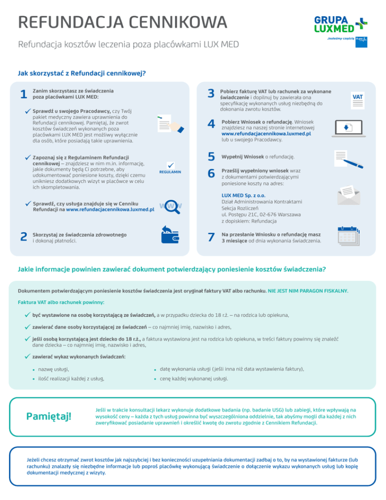 REFUNDACJA CENNIKOWA Refundacja kosztów leczenia poza placówkami LUX MED Jak skorzystać z Refundacji cennikowej? 1 Zanim skorzystasz ze świadczenia poza placówkami LUX MED: u swojego Pracodawcy, czy Twój Sprawdź pakiet medyczny zawiera uprawnienia do Refundacji cennikowej. Pamiętaj, że zwrot kosztów świadczeń wykonanych poza placówkami LUX MED jest możliwy wyłącznie dla osób, które posiadają takie uprawnienia. Zapoznaj się z Regulaminem Refundacji cennikowej – znajdziesz w nim m.in. informację, jakie dokumenty będą Ci potrzebne, aby udokumentować poniesione koszty, dzięki czemu unikniesz dodatkowych wizyt w placówce w celu ich skompletowania. czy usługa znajduje się w Cenniku Sprawdź, Refundacji na www.refundacjacennikowa.luxmed.pl 2 Skorzystaj ze świadczenia zdrowotnego i dokonaj płatności. REGULAMIN 3 Pobierz fakturę VAT lub rachunek za wykonane świadczenie i dopilnuj by zawierała ona specyfikację wykonanych usług niezbędną do dokonania zwrotu kosztów. 4 Pobierz Wniosek o refundację. Wniosek znajdziesz na naszej stronie internetowej www.refundacjacennikowa.luxmed.pl lub u swojego Pracodawcy. 5 6 Wypełnij Wniosek o refundację. Prześlij wypełniony wniosek wraz z dokumentami potwierdzającymi poniesione koszty na adres: LUX MED Sp. z o.o. Dział Administrowania Kontraktami Sekcja Rozliczeń ul. Postępu 21C, 02-676 Warszawa z dopiskiem: Refundacja www 7 Na przesłanie Wniosku o refundację masz 3 miesiące od dnia wykonania świadczenia. Jakie informacje powinien zawierać dokument potwierdzający poniesienie kosztów świadczenia? Dokumentem potwierdzającym poniesienie kosztów świadczenia jest oryginał faktury VAT albo rachunku. NIE JEST NIM PARAGON FISKALNY. Faktura VAT albo rachunek powinny: być wystawione na osobę korzystającą ze świadczeń, a w przypadku dziecka do 18 r.ż. – na rodzica lub opiekuna, zawierać dane osoby korzystającej ze świadczeń – co najmniej imię, nazwisko i adres, jeśli osobą korzystającą jest dziecko do 18 r.ż., a faktura wystawiona jest na rodzica lub opiekuna, w treści faktury powinny się znaleźć dane dziecka – co najmniej imię, nazwisko i adres, zawierać wykaz wykonanych świadczeń: nazwę usługi, datę wykonania usługi ( jeśli inna niż data wystawienia faktury), ilość realizacji każdej z usług, cenę każdej wykonanej usługi. Pamiętaj! Jeśli w trakcie konsultacji lekarz wykonuje dodatkowe badania (np. badanie USG) lub zabiegi, które wpływają na wysokość ceny – każda z tych usług powinna być wyszczególniona oddzielnie, tak abyśmy mogli dla każdej z nich zweryfikować posiadanie uprawnień i określić kwotę do zwrotu zgodnie z Cennikiem Refundacji. Jeżeli chcesz otrzymać zwrot kosztów jak najszybciej i bez konieczności uzupełniania dokumentacji zadbaj o to, by na wystawionej fakturze (lub rachunku) znalazły się niezbędne informacje lub poproś placówkę wykonującą świadczenie o dołączenie wykazu wykonanych usług lub kopię dokumentacji medycznej z wizyty. REFUNDACJA CENNIKOWA Refundacja kosztów leczenia poza placówkami LUX MED Jak i kiedy dokonujemy refundacji? Kwota zwrotu przekazywana jest przelewem na rachunek bankowy wskazany we wniosku. Zwrotu kosztów dokonujemy w terminie do 30 dni od wpłynięcia kompletnego wniosku. Jak wygląda proces obsługi wniosku o refundację? 1 Każdy Wniosek o refundację wpływający do LUX MED podlega rejestracji w naszym systemie. czy Twój pakiet medyczny zawiera uprawnienia do wykonanych świadczeń; jeśli świadczenie jest limitowane w umowie – czy posiadasz nadal dostępny limit; 2 czy wykonane świadczenia nie wymagają posiadania skierowania, a jeśli tak czy skierowanie widnieje w systemie LUX MED lub jego kopia została dołączona do wniosku. W pierwszej kolejności Twój wniosek zostanie zweryfikowany formalnie i merytorycznie. Sprawdzimy: czy Wniosek o refundację zawiera wszystkie niezbędne informacje; czy dołączone zostały oryginały faktur VAT lub rachunków potwierdzające poniesienie kosztów; czy została do nich dołączona specyfikacja zawierająca komplet informacji niezbędnych do ustalenia uprawnień do wykonanych świadczeń; zweryfikujemy również, czy w chwili wykonania świadczenia: posiadałeś uprawnienia do Refundacji cennikowej; czy wykonane świadczenie znajduje się w Cenniku Refundacji; 3 Jeżeli w wyniku weryfikacji ustalimy, iż nie posiadasz uprawnień do refundacji, nie masz w pakiecie wykonanego świadczenia lub wykorzystałeś już limit itp. – otrzymasz od nas informację o odmowie zwrotu kosztów. 4 Jeżeli przesłane dokumenty zawierają braki – otrzymasz od nas informację o konieczności uzupełnienia dokumentacji. 5 Jeśli zaś weryfikacja przebiegnie pomyślnie, dokonamy zwrotu kosztów w terminie do 30 dni od wpłynięcia wniosku. ?