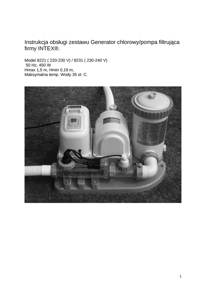 Instrukcja obsługi zestawu Generator chlorowy/pompa filtrująca firmy INTEX®. Model 8221 ( 220-230 V) / 8231 ( 230-240 V) 50 Hz, 450 W Hmax 1,5 m, Hmin 0,19 m, Maksymalna temp. Wody 35 st. C. 1 OSTRZEŻENIA............................................................................................... 3 LISTA CZĘSCI................................................................................................ 4-9 INFORMACJA O PRODUKCIE I SPECYFIKACJE............................................................................................. 10 MONTAŻ......................................................................................................... 11-14 ILOŚC SOLI I OBJĘTOŚC WODY................................................................. 15 TABELA ZESTAWIENIA ILOŚCI SOLI W BASENACH INTEX........................................................................................ 16 TABELA CZASU DZIAŁANIA......................................................................... 17 TABELA ZESTAWIENIA KWASU CYJANUROWEGO......................................................................................... 18 TABELA ZESTAWIENIA ILOŚCI SOLI W BASENACH INNEJ FIRMY ............................................................................ 19 TABELA CZASU DZIAŁANIA DLA BASENÓW INNEJ FIRMY............................................................................... 19 TABELA ZESTAWIENIA KWASU CYJANUROWEGO DLA BASENÓW INNEJ FIRMY....................................................................... 19 OBSŁUGA........................................................................................................ 20-22 WYŚWIETLACZ LED....................................................................................... 23 MONTAŻ NA PODŁOŻU.................................................................................. 24 KONSERWACJA............................................................................................. 25-28 PRZECHOWYWANIE...................................................................................... 28 KONSERWACJA BASENU I CHEMIA BASENOWA...................................... 29 MOŻLIWE PROBLEMY................................................................................... 30-32 OGÓLNE ZASADY BEZPIECZEŃSTWA....................................................... 33 GWARANCJA................................................................................................. 34 SERWIS.......................................................................................................... 35 2 ZASADY BEZPIECZEŃSTWA PRZECZYTAJ I POSTĘPUJ ZGODNIE ZE WSZYSTKIMI WSKAZÓWKAMI Wyłącznie dla przenośnych basenów rozkładanych • Aby zredukować ryzyko doznania obrażeń, nie pozwalaj dzieciom używać pompy filtrującej jeśli nie są pod ciągłym nadzorem dorosłych. • Dzieci muszą znajdować się w bezpiecznej odległości od produktu i przewodów zasilających. • Dzieci muszą być nadzorowane aby upewnić się, że nie bawią się urządzeniem. • Urządzenie nie jest przeznaczone do użytku dla osób (włączając dzieci) z obniżonymi zdolnościami fizycznymi, czuciowymi lub psychicznymi, lub z brakiem doświadczenia i wiedzy, chyba że byli nadzorowani lub przeszkoleni co do obsługi tego urządzenia przez osobę odpowiedzialną za ich bezpieczeństwo. • Montaż i demontaż tylko przez osoby dorosłe. • Aby uniknąć ryzyka porażania prądem należy pompę filtrującą podłączyć do gniazdka sieciowego z podłączonym wyłącznikiem różnicowym. Skontaktuj się z wykwalifikowanym elektrykiem, jeśli nie jesteś w stanie określić czy gniazdo sieciowe jest zabezpieczone wyłącznikiem różnicowym. Skorzystaj z usług wykwalifikowanego elektryka w celu zainstalowania wyłącznika różnicowego, którego maksymalne natężenie wynosi 30 mA. • Zawsze należy odłączać produkt, gdy jest on czyszczony, naprawiany itp. • Po zainstalowaniu produktu należy mieć dostęp do wtyczki. • Nie należy zakopywać przewodu elektrycznego. Umieść przewód w miejscu gdzie nie zostanie uszkodzony przez maszynę do strzyżenia trawy, nożyce do żywopłotu czy inny sprzęt ogrodniczy. • Jeżeli przewód zasilający jest zniszczony to musi być wymieniony przez producenta, pracownika serwisu lub wykwalifikowaną osobę aby uniknąć ryzyka. • Aby zredukować ryzyko wstrząsu elektrycznego nie używaj przedłużaczy elektrycznych, wyłączników czasowych i zmienników prądu w celu podłączenia pompy do źródła prądu. Zawsze zapewnij odpowiednie dojście go gniazdka. • Nie włączać lub wyłączać z gniazdka tego produktu stojąc w wodzie lub gdy ręce są mokre. • Wtyczka od przewodu pompy powinna znajdować się co najmniej 3,5 metra od basenu. • Ustaw produkt z dala od basenu, aby dzieci nie mogły się po nim wspiąć i wejść do basenu. • Pompa filtrująca nie może być włączona podczas korzystania z basenu. • Pompa służy do pracy wyłącznie z basenami rozkładanymi. Nie można jej używać do filtrowania wody w basenach stałych. • Pompa służy wyłącznie do użytku dla celów wskazanych w niniejszej instrukcji. NIESTOSOWANIE SIĘ DO POWYŻSZYCH ZASAD MOŻE DOPROWADZIĆ DO POWAŻNYCH OBRAŻEŃ CIAŁA, A W SKRAJNYCH PRZYPADKACH NAWET DO ŚMIERCI. Zawsze stosuj się do powyższych zasad i kieruj się zdrowym rozsądkiem kiedy korzystasz z zabawy w wodzie. W przeciwnym wypadku może dojść do zniszczenia posesji, porażenia prądem lub innych poważnych uszkodzeń ciał a, a w skrajnych przypadkach nawet śmierci. 3 Spis części UWAGA: Rysunki mają charakter poglądowy, mogą się różnić od aktualnej wersji produktu. Nie zachowano skali. 4 Lista części cd. 5 OPIS CZĘŚCI 6 Numer Opis 1 2 3 4 5 6 7 14 Zawór wypuszczający powietrze Uszczelka zaworu Nagwintowany pierścień obudowy filtra Pokrywa obudowy filtra Uszczelka obudowy (o-ring) Wymienny wkład ( kartridż) Zawór wypuszcza