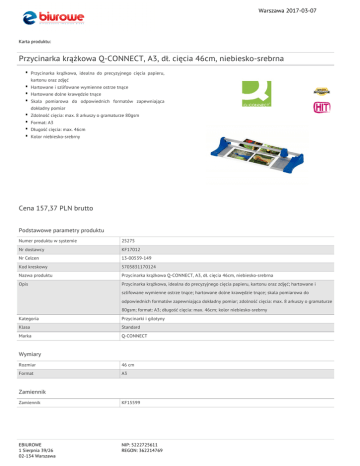 Warszawa 2017-03-07 Karta produktu: Przycinarka krążkowa Q-CONNECT, A3, dł. cięcia 46cm, niebiesko-srebrna Przycinarka krążkowa, idealna do precyzyjnego cięcia papieru, kartonu oraz zdjęć Hartowane i szlifowane wymienne ostrze tnące Hartowane dolne krawędzie tnące Skala pomiarowa do odpowiednich formatów zapewniająca dokładny pomiar Zdolność cięcia: max. 8 arkuszy o gramaturze 80gsm Format: A3 Długość cięcia: max. 46cm Kolor niebiesko-srebrny Cena 157,37 PLN brutto Podstawowe parametry produktu Numer produktu w systemie 25275 Nr dostawcy KF17012 Nr Celcen 13-00539-149 Kod kreskowy 5705831170124 Nazwa produktu Przycinarka krążkowa Q-CONNECT, A3, dł. cięcia 46cm, niebiesko-srebrna Opis Przycinarka krążkowa, idealna do precyzyjnego cięcia papieru, kartonu oraz zdjęć; hartowane i szlifowane wymienne ostrze tnące; hartowane dolne krawędzie tnące; skala pomiarowa do odpowiednich formatów zapewniająca dokładny pomiar; zdolność cięcia: max. 8 arkuszy o gramaturze 80gsm; format: A3; długość cięcia: max. 46cm; kolor niebiesko-srebrny Kategoria Przycinarki i gilotyny Klasa Standard Marka Q-CONNECT Wymiary Rozmiar 46 cm Format A3 Zamiennik Zamiennik KF15599 EBIUROWE 1 Sierpnia 39/26 02-134 Warszawa NIP: 5222725611 REGON: 362214769 Warszawa 2017-03-07 Karta katalogowa produktu cd. Przycinarka krążkowa Q-CONNECT, A3, dł. cięcia 46cm, niebiesko-srebrna Cecha W ofercie od 2015-10 Rodzaj Hartowane ostrze Typ Krążkowa Produkt Przycinarka Materiał Metal/plastik Ilość Ilość arkuszy 8 Kolor Kolor Srebrny/niebieski Wspólny słownik zamówień CPV 30191000-4 Sprzęt biurowy, z wyjątkiem mebli Certyfikaty Hit Hit Nowy produkt w ofercie Standard Serdecznie zapraszamy do współpracy EBIUROWE zespół. EBIUROWE 1 Sierpnia 39/26 02-134 Warszawa NIP: 5222725611 REGON: 362214769