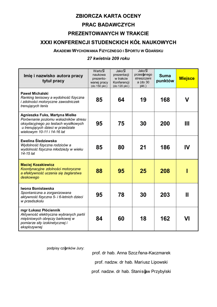 ZBIOR CZA K ARTA OCEN Y PRAC B AD AWC ZYCH PREZENTOW AN YCH W TR AK CIE XXXI KONFEREN CJI S TUDENCK ICH KÓŁ N AUKOW YC H AKADEMII W YCHOWANIA FIZYCZNEGO I SPORTU W GDAŃSKU 27 kwietnia 209 roku Suma punktów Miejsce (do 120 pkt.) Jakość przesłanego streszczeni a (do 30 pkt.) 85 64 19 168 V Agnieszka Fuks, Martyna Mielke Porównanie poziomu wskaźników stresu oksydacyjnego po testach wysiłkowych u trenujących dzieci w przedziale wiekowym 10-11 i 14-16 lat 95 75 30 200 III Ewelina Śledziewska Wydolność fizyczna rodziców a wydolność fizyczna młodzieży w wieku 14-15 lat 85 80 21 186 IV Maciej Kozakiewicz Koordynacyjne zdolności motoryczne a efektywność uczenia się żeglarstwa deskowego 88 95 25 208 I Iwona Bonisławska Spontaniczna a zorganizowana aktywność fizyczna 5- i 6-letnich dzieci w przedszkolu 95 78 30 203 II mgr Łukasz Płóciennik Aktywność elektryczna wybranych partii mięśniowych obręczy barkowej w pomiarze siły izokinetycznej i eksplozywnej 84 60 18 162 VI Wartość naukowa prezentowanej pracy Jakość prezentacji w trakcie Konferencji (do 150 pkt.) Paweł Michalski Ranking tenisowy a wydolność fizyczna i zdolności motoryczne zawodniczek trenujących tenis Imię i nazwisko autora pracy tytuł pracy podpisy członków Jury: prof. dr hab. Anna Szczęsna-Kaczmarek prof. nadzw. dr hab. Mariusz Lipowski prof. nadzw. dr hab. Stani sław Przybylski