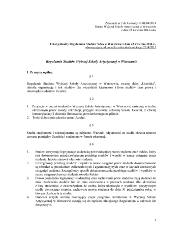 Załącznik nr 2 do Uchwały Nr 01/04/2014 Senatu Wyższej Szkoły Artystycznej w Warszawie z dnia 23 kwietnia 2014 roku Tekst jednolity Regulaminu Studiów WSA w Warszawie z dnia 23 kwietnia 2014 r., obowiązujący od początku roku akademickiego 2014/2015 Regulamin Studiów Wyższej Szkoły Artystycznej w Warszawie 1. Przepisy ogólne. §1 Regulamin Studiów Wyższej Szkoły Artystycznej w Warszawie, zwanej dalej „Uczelnią”, określa organizację i tok studiów dla wszystkich kierunków i form studiów oraz prawa i obowiązki studentów Uczelni. §2 1. Przyjęcie w poczet studentów Wyższej Szkoły Artystycznej w Warszawie następuje w trybie określonym przez zasady rekrutacji, przyjęte stosowną uchwałą Senatu Uczelni, z chwilą immatrykulacji i złożenia ślubowania, potwierdzonego na piśmie. 2. Treść ślubowania określa statut Uczelni. §3 Studia stacjonarne i niestacjonarne są odpłatne. Warunki odpłatności za studia określa umowa zawarta pomiędzy Uczelnią i studentem w formie pisemnej. §4 1. 2. 3. 4. Student otrzymuje legitymację studencką poświadczającą status studenta oraz indeks, który jest dokumentem przedstawiającym przebieg studiów i wyniki w nauce osiągane przez studenta. Indeks stanowi własność studenta. Szczegółowy przebieg studiów i wyniki w nauce osiągane przez studenta dokumentowane są również w protokołach zaliczeniowych i egzaminacyjnych oraz w kartach okresowych osiągnięć studenta. Szczegółowy sposób dokumentowania przebiegu studiów i wyników w nauce osiąganych przez studenta określa Rektor. Prawo posiadania legitymacji studenckiej oraz zachowania praw studenta mają studenci do dnia ukończenia studiów lub do dnia zawieszenia w prawach studenta albo skreślenia z listy studentów, z zastrzeżeniem, iż osoba, która ukończyła z wynikiem pozytywnym studia pierwszego stopnia, zachowuje prawa studenta do dnia 31 października roku, w którym ukończyła te studia. Studenci innych uczelni realizujący część programu kształcenia w Wyższej Szkole Artystycznej w Warszawie stosują się do zapisów niniejszego Regulaminu w zakresie ich dotyczącym. 1 §5 1. Najwyższym zwierzchnikiem wszystkich studentów Uczelni jest Rektor. Nadzór nad całością przebiegu procesu dydaktycznego i wychowawczego w Uczelni sprawuje prorektor do spraw dydaktycznych. 2. Prorektor, o którym mowa w ust. 1, sprawuje ponadto nadzór nad realizacją planów studiów i programów kształcenia. 3. Prorektor do spraw dydaktycznych może dokonywać czynności mieszczących się w ramach kompetencji Rektora, na podstawie pełnomocnictwa udzielonego mu przez Rektora w formie pisemnej 4. Od decyzji Rektora, z zastrzeżeniem ust. 3, studentowi przysługuje możliwość złożenia wniosku do Rektora o ponowne rozpatrzenie sprawy, w terminie 14 dni od otrzymania decyzji. Ponowna decyzja Rektora w sprawie jest ostateczna. §6 1. 2. 3. 4. Na studiach pierwszego stopnia mogą zostać powołani spośród nauczycieli akademickich opiekunowie poszczególnych roczników. Opiekunów roczników powołuje Rektor na czas określony. Rektor może powołać pełnomocnika ds. osób niepełnosprawnych. Do zadań pełnomocnika rektora ds. osób niepełnosprawnych należy przede wszystkim określenie szczególnych potrzeb studentów niepełnosprawnych dotyczących organizacji i realizacji procesu dydaktycznego, w tym dostosowania warunków odbywania studiów do rodzaju niepełnosprawności. §7 1. Wszyscy studenci Uczelni tworzą Samorząd Studentów, którego organy, pochodzące z wyboru, są wyłącznym reprezentantem ogółu studentów Uczelni. 2. Samorząd Studentów działa na podstawie Regulaminu Samorządu Studentów, zatwierdzonego przez Senat Uczelni pod względem jego zgodności z ustawą – Prawo o szkolnictwie wyższym (zwanej dalej „ustawą”) i statutem Uczelni. 3. Samorząd Studentów prowadzi na terenie Uczelni działalność w zakresie spraw studenckich, w tym socjalno-bytowych, artystycznych i kulturalnych. 4. Organy Samorządu Studentów, w zakresie ich działalności, upoważnione są do występowania wobec władz Uczelni w sprawach dotyczących studentów, w szczególności mogą wyrażać opinie i przedstawiać wnioski. 2. Obowiązki i prawa studenta. §8 Student ma obowiązek systematycznego zdobywania wiedzy i umiejętności zgodnie z planem studiów i programem kształcenia. §9 W szczególności, w toku odbywania studiów, student jest zobowiązany do: 2 1) postępowania zgodnego z treścią ślubowania i regulaminem studiów oraz pełnego wykorzystania możliwości kształcenia się, 2) aktywnego uczestniczenia w zajęciach dydaktycznych, naukowych i innych organizowanych przez Uczelnię, uzyskiwania zaliczeń i składania egzaminów, odbywania praktyk studenckich i innych zajęć określonych w planach studiów i programach kształcenia, 3) przestrzegania przepisów obowiązujących w Uczelni, 4) poszanowania mienia Uczelni oraz własności koleżanek i kolegów, 5) dbania o godność studenta i dobre imię Uczelni, 6) terminowego wnoszenia opłat za usługi edukacyjne, określonych w odrębnych przepisach, 7) dostarczenia na żądanie Rektora orzeczenia lekarskiego o istnieniu lub braku przeciwwskazań zdrowotnych do udziału w zajęciach dydaktycznych lub innych zajęciach określonych w planach studiów i programach kształcenia, 8) przestrzegania dobrych obyczajów wspólnoty akademickiej. § 10 1. Student ma prawo do: 1) wyrażania opinii w formie ankiet o prowadzonych w Uczelni zajęciach dydaktycznych, zgodnie z przepisami obowiązującymi w Uczelni , 2) zdobywania wiedzy na wybranym kierunku lub kierunkach studiów kilku szkół, na zasadach określonych odrębnie przepisami powszechnie obowiązującego prawa, rozwijania własnych zainteresowań naukowych, a także uczestnictwa w zajęciach innych specjalności, po wcześniejszym uzgodnieniu z prowadzącym, 3) ubiegania się o studiowanie według indywidualnego planu studi