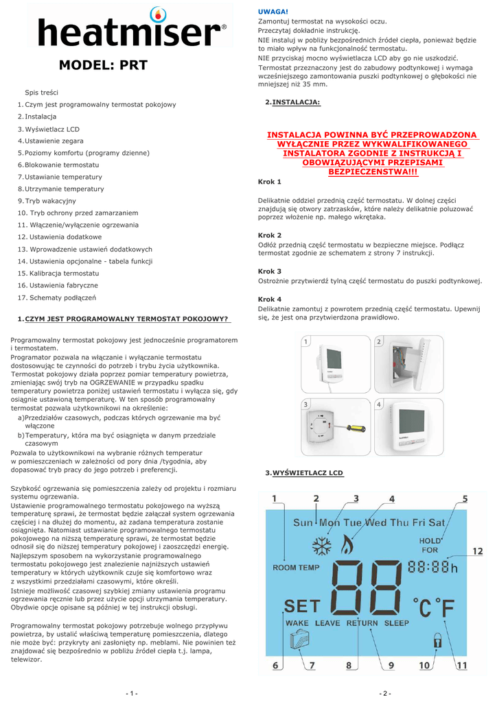 UWAGA! MODEL: PRT 1. Czym jest programowalny termostat pokojowy Termostat przeznaczony jest do zabudowy podtynkowej i wymaga 2.INSTALACJA: 2. Instalacja 3. 4.Ustawienie zegara 5.Poziomy komfortu (programy dzienne) 6.Blokowanie termostatu BEZPIECZENSTWA!!! 7.Ustawianie temperatury Krok 1 8.Utrzymanie temperatury 9. Tryb wakacyjny 10. Tryb ochrony przed zamarzaniem 11. Krok 2 12. Ustawienia dodatkowe 13. termostat zgodnie ze schematem z strony 7 instrukcji. 14. Ustawienia opcjonalne - tabela funkcji Krok 3 15. Kalibracja termostatu 16. Ustawienia fabryczne 17. Krok 4 1. CZYM JEST PROGRAMOWALNY TERMOSTAT POKOJOWY? i termostatem. a) b) czasowym 3. systemu ogrzewania. Najlepszym sposobem na wykorzystanie programowalnego telewizor. -1- -2- HEATMISER MODEL:PRT HEATMISER MODEL:PRT 1. Temperatura 2. Sun-Niedziela 3.Symbol ochrony przed zamarzaniem ochrony przed zamarzaniem jest aktywny. 4. 5.Podtrzymywanie temperatury 6.Ustaw planu programu lub w czasie wprowadzania tymczasowych zmian temperatury. --:-- 6.BLOKOWANIE TERMOSTATU: 7.Symbol walizki aktywny. 8.Aktualna temperatura czujnika. 9.Nazwa cyklu programu 7.USTAWIANIE TEMPERATURY 10. zablokowany. 11. stopnie C lub F. 12. Zegar ekranu.......................................................................... 4.USTAWIENIE ZEGARA zegara.............................................................................. 8.UTRZYMANIE TEMPERATURY temperatury ................................................................. czas Utrzymania........................................................ Sun-Niedziela do ekranu poczatkowego..................................................... 5.POZIOMY KOMFORTU Termostat oferuje dwie opcje trybu programowania: Programowanie 7-dniowe (7) 08:00 - 21 C (Budzenie/WAKE) 09:30 - 16 9.TRYB WAKACYJNY 16:30 - 22 23:00 - 17 C (Sen/SLEEP) temperatury ustawionej w trybie zapobiegania przed mrozem (opis na stronie 5) --:-UWAGA! W przypadku programowania (5/2) cztery poziomy komfortu sobota-niedziela. W przypadku programowania siedmiodniowego (7), -3- powrotu. walizki na ekranie)......................................................... -4- HEATMISER MODEL:PRT HEATMISER MODEL:PRT ta funkcja nie jest Funkcja 10 - Optimum start: jest ustawiony w trybie wakacyjnym. w pomieszczeniu o 1 C. ogrzewanie. godzinie 00:00. C. 10. TRYB OCHRONY PRZED ZAMARZANIEM Funkcja 12 -Tryb programu: Programowanie 7 dniowe - pozwala na programowanie weekend Tryb Programu 7-dniowego przycisk zasilania. 13. WPROWADZENIE USTAWIEN DODATKOWYCH 11. pozostaje aktywny. 14. USTAWIENIA OPCJONALNE 12. USTAWIENIA DODATKOWE 1. Format temperatury:..................................... 00 = C, 01 = F 2.Regulacja Histerezy:............................................... 01 (01 Funkcja 01 - Format temperatury : ta funkcja pozwala na wybranie C i F. Funkcja 02 - Histereza termostatu: C, - 03 C 3. 4. - 17 C (12 ogrzewanie przy 19 20 20 C.itd. Funkcja 03 - Ochrona przed zamarzaniem : 5. 6. Adres sieciowy:.......................... ustaw unikalny adres (01-32) 7.Limit regulacji temperatury:................................... 00 C- 10 C : jest to Ochrony przed zamarzaniem. Zakres to 07-17 temperatura to 12 aby zapobiec zbyt szybkim 8. powietrza 9. 10. 11. wzrasta o 1 Funkcja 06 - Ustawienia komunikacji w sieci: to ustawienie nadany unikalny adres (01-32). Funkcja 07 - Limit regulacji temperatury: ta funkcja pozwala na 15. KALIBRACJA TERMOSTATU ten model posiada wbudowany czujnik temperatury powietrza -5- -6- HEATMISER MODEL:PRT Notatki: ......................................................................................................................... 16. USTAWIENIA FABRYCZNE ......................................................................................................................... ......................................................................................................................... ......................................................................................................................... ......................................................................................................................... ......................................................................................................................... wszystkie ikony) ......................................................................................................................... ......................................................................................................................... ......................................................................................................................... ......................................................................................................................... ......................................................................................................................... ......................................................................................................................... ........................................................................................................................ ......................................................................................................................... ......................................................................................................................... ......................................................................................................................... ......................................................................................................................... ........................................................................................................................ ......................................................................................................................... ......................................................................................................................... ..........