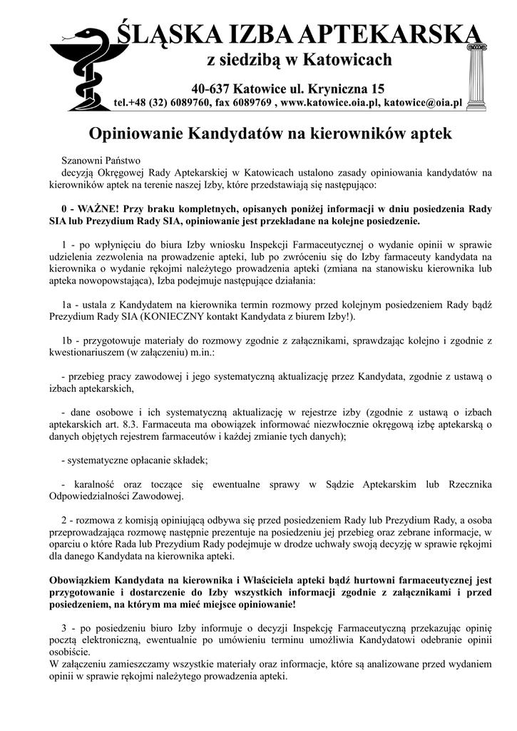 Opiniowanie Kandydatów na kierowników aptek Szanowni Państwo decyzją Okręgowej Rady Aptekarskiej w Katowicach ustalono zasady opiniowania kandydatów na kierowników aptek na terenie naszej Izby, które przedstawiają się następująco: 0 - WAŻNE! Przy braku kompletnych, opisanych poniżej informacji w dniu posiedzenia Rady SIA lub Prezydium Rady SIA, opiniowanie jest przekładane na kolejne posiedzenie. 1 - po wpłynięciu do biura Izby wniosku Inspekcji Farmaceutycznej o wydanie opinii w sprawie udzielenia zezwolenia na prowadzenie apteki, lub po zwróceniu się do Izby farmaceuty kandydata na kierownika o wydanie rękojmi należytego prowadzenia apteki (zmiana na stanowisku kierownika lub apteka nowopowstająca), Izba podejmuje następujące działania: 1a - ustala z Kandydatem na kierownika termin rozmowy przed kolejnym posiedzeniem Rady bądź Prezydium Rady SIA (KONIECZNY kontakt Kandydata z biurem Izby!). 1b - przygotowuje materiały do rozmowy zgodnie z załącznikami, sprawdzając kolejno i zgodnie z kwestionariuszem (w załączeniu) m.in.: - przebieg pracy zawodowej i jego systematyczną aktualizację przez Kandydata, zgodnie z ustawą o izbach aptekarskich, - dane osobowe i ich systematyczną aktualizację w rejestrze izby (zgodnie z ustawą o izbach aptekarskich art. 8.3. Farmaceuta ma obowiązek informować niezwłocznie okręgową izbę aptekarską o danych objętych rejestrem farmaceutów i każdej zmianie tych danych); - systematyczne opłacanie składek; - karalność oraz toczące się ewentualne sprawy w Sądzie Aptekarskim lub Rzecznika Odpowiedzialności Zawodowej. 2 - rozmowa z komisją opiniującą odbywa się przed posiedzeniem Rady lub Prezydium Rady, a osoba przeprowadzająca rozmowę następnie prezentuje na posiedzeniu jej przebieg oraz zebrane informacje, w oparciu o które Rada lub Prezydium Rady podejmuje w drodze uchwały swoją decyzję w sprawie rękojmi dla danego Kandydata na kierownika apteki. Obowiązkiem Kandydata na kierownika i Właściciela apteki bądź hurtowni farmaceutycznej jest przygotowanie i dostarczenie do Izby wszystkich informacji zgodnie z załącznikami i przed posiedzeniem, na którym ma mieć miejsce opiniowanie! 3 - po posiedzeniu biuro Izby informuje o decyzji Inspekcję Farmaceutyczną przekazując opinię pocztą elektroniczną, ewentualnie po umówieniu terminu umożliwia Kandydatowi odebranie opinii osobiście. W załączeniu zamieszczamy wszystkie materiały oraz informacje, które są analizowane przed wydaniem opinii w sprawie rękojmi należytego prowadzenia apteki. miejscowość, data .............................................. ......................................................................................... imię, nazwisko kandydata na kierownika …………………………………………………………. adres zamieszkania, tel. Śląska Okręgowa Izba Aptekarska w Katowicach WNIOSEK w sprawie wydania opinii dotyczącej nowopowstającej apteki ogólnodostępnej. stwierdzenia rękojmi należytego prowadzenia W związku z zamiarem ubiegania się podmiotu: ………………………………………………………………………………………………………………. ……………..……………………………………………………………………………………………….... (pełna nazwa i adres siedziby podmiotu ubiegającego się o wydanie zezwolenia lub pieczęć) o udzielenie zezwolenia na prowadzenie apteki ogólnodostępnej mieszczącej się w: ……………………………………………………………………………………………………………… ……………………………………………………………………………………………………………… (nazwa i adres apteki) zwracam się o wydanie opinii dotyczącej stwierdzenia rękojmi należytego prowadzenia nowopowstającej apteki ogólnodostępnej jw. .................................................................... czytelny podpis kandydata na kierownika UWAGA: - Do wniosku należy dołączyć ZAŁĄCZNIK nr 1 ZAŁĄCZNIK nr 1 do wniosku miejscowość, data .............................................. ......................................................................................... (pełna nazwa i adres siedziby podmiotu ubiegającego się o wydanie zezwolenia) Na podstawie Karty Informacyjnej Nr 1 Śląskiego Wojewódzkiego Inspektoratu Farmaceutycznego w Katowicach dotyczącej procedury udzielania zezwoleń uprawniających do prowadzenia apteki ogólnodostępnej Oświadczam, że opinia dotycząca stwierdzenia rękojmi należytego prowadzenia nowopowstającej apteki ogólnodostępnej w…………………………………………………………………………………………………………….. przez kandydata na kierownika, którym jest……………………………………………………….……….. jest niezbędna do przedstawienia w SlWIF w Katowicach w związku ze złożeniem / planowanym złożeniem* wniosku o udzielenie zezwolenia na prowadzenie apteki ogólnodostępnej jw. .................................................................... czytelny podpis właściciela apteki *niepotrzebne skreślić miejscowość, data .............................................. ........................................................................................... nazwa, adres apteki (pieczęć firmy) Śląska Okręgowa Izba Aptekarska w Katowicach dotyczy: personelu fachowego i godzin otwarcia apteki w związku z opiniowaniem kandydata na kierownika apteki i wydaniem rękojmi należytego prowadzenia apteki Informuję, że apteka: ………………………………………………………………………………….. będzie funkcjonowała w godzinach: poniedziałek – piątek ………………………………….. sobota ………………………………………………….. niedziela ……………