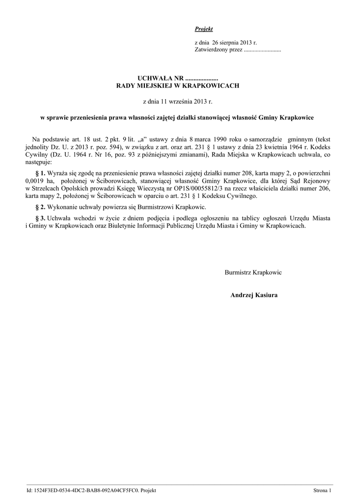 Projekt z dnia 26 sierpnia 2013 r. Zatwierdzony przez ......................... UCHWAŁA NR .................... RADY MIEJSKIEJ W KRAPKOWICACH z dnia 11 września 2013 r. w sprawie przeniesienia prawa własności zajętej działki stanowiącej własność Gminy Krapkowice Na podstawie art. 18 ust. 2 pkt. 9 lit. „a” ustawy z dnia 8 marca 1990 roku o samorządzie gminnym (tekst jednolity Dz. U. z 2013 r. poz. 594), w związku z art. oraz art. 231 § 1 ustawy z dnia 23 kwietnia 1964 r. Kodeks Cywilny (Dz. U. 1964 r. Nr 16, poz. 93 z późniejszymi zmianami), Rada Miejska w Krapkowicach uchwala, co następuje: § 1. Wyraża się zgodę na przeniesienie prawa własności zajętej działki numer 208, karta mapy 2, o powierzchni 0,0019 ha, położonej w Ściborowicach, stanowiącej własność Gminy Krapkowice, dla której Sąd Rejonowy w Strzelcach Opolskich prowadzi Księgę Wieczystą nr OP1S/00055812/3 na rzecz właściciela działki numer 206, karta mapy 2, położonej w Ściborowicach w oparciu o art. 231 § 1 Kodeksu Cywilnego. § 2. Wykonanie uchwały powierza się Burmistrzowi Krapkowic. § 3. Uchwała wchodzi w życie z dniem podjęcia i podlega ogłoszeniu na tablicy ogłoszeń Urzędu Miasta i Gminy w Krapkowicach oraz Biuletynie Informacji Publicznej Urzędu Miasta i Gminy w Krapkowicach. Burmistrz Krapkowic Andrzej Kasiura ————————————————————————————————————————————————————————— Id: 1524F3ED-0534-4DC2-BAB8-092A04CF5FC0. Projekt Strona 1 Uzasadnienie 1) podstawa prawna, Art. 18 ust. 2 pkt. 9 lit. „a” ustawy z dnia 8 marca 1990 roku o samorządzie gminnym (Dz. U. nr 142 poz. 1591 z 2001 roku) Art.18. 1. 2. Do wyłącznej właściwości rady gminy należy: 9) podejmowanie uchwał w sprawach majątkowych gminy, przekraczających zakres zwykłego zarządu, dotyczących: a) zasad nabywania, zbywania i obciążania nieruchomości oraz ich wydzierżawiania lub wynajmowania na czas oznaczony dłuższy niż 3 lata lub na czas nieoznaczony, o ile ustawy szczególne nie stanowią inaczej; uchwała rady gminy jest wymagana również w przypadku, gdy po umowie zawartej na czas oznaczony do 3 lat strony zawierają kolejne umowy, których przedmiotem jest ta sama nieruchomość; do czasu określenia zasad wójt może dokonywać tych czynności wyłącznie za zgodą rady gminy, Art. 231 §1 ustawy z dnia 23 kwietnia 1964 r. Kodeks Cywilny (DZ. U. z 1964 r. Nr 16 poz.93 z 1964 r. z późniejszymi zmianami ) Art.231. 1. 1 Samoistny posiadacz gruntu w dobrej wierze, który wzniósł na powierzchni lub pod powierzchnią gruntu budynek lub inne urządzenie o wartości przenoszącej znacznie wartość zajętej na ten cel działki, może żądać, aby właściciel przeniósł na niego własność zajętej działki za odpowiednim wynagrodzeniem. 2) uzasadnienie faktyczne, w tym cele jakie mają byś osiągnięte, W dniu 10.07.2013 roku do Burmistrza Krapkowic zwrócił się właściciel działki 206 o sprzedaż działki sąsiedniej nr 208 z mapy 2 położonej we wsi Ściborowice, a stanowiącej własność Gminy Krapkowice, gdyż okazało się, że część jego budynku mieszkalnego położona jest na działce nr 208. Przepisy dopuszczają w takich przypadkach w oparciu o art. 231 § 1 KC przeniesienie prawa własności działki na rzecz tego, który wzniósł budynek na tej działce jeżeli wartość zajętej działki jest mniejsza od wartości budynku, co w tym przypadku jest bezsprzeczne (działka ma powierzchnię 0,0019 ha i jej wartość to ok. 1500,00 zł). Fakt ten potwierdzi zlecona wycena. Zatem zachodzi potrzeba podjęcia niniejszej uchwały. 3) wskazanie jednostek/komórek na które będzie oddziaływać, Wydział Budżetowo Finansowy, Wydział Podatków i Opłat Lokalnych, Wydział Gospodarki Gruntami, Rolnictwa i Ochrony Środowiska 4) wskazanie uchwał, zarządzeń, regulaminów, instrukcji, na które będzie oddziaływać, uchwała budżetowa 5) wskazanie przewidywanych skutków finansowych, zostanie zlecona wycena, która określi wartość przenoszonego prawa własności działki 6) wskazanie zasobów osobowych i finansowych niezbędnych do realizacji postanowień zawartych w projekcie uchwały, zarządzeniu, regulaminie, instrukcji. Naczelnicy: Wydział Budżetowo Finansowy, Wydział Podatków i Opłat Lokalnych, Wydział Gospodarki Gruntami, Rolnictwa i Ochrony Środowiska. ————————————————————————————————————————————————————————— Id: 1524F3ED-0534-4DC2-BAB8-092A04CF5FC0. Projekt Strona 1