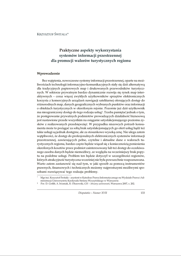 KRZYSZTOF ŒWITA£A* Praktyczne aspekty wykorzystania systemów informacji przestrzennej dla promocji walorów turystycznych regionu Wprowadzenie Bez w¹tpienia, nowoczesne systemy informacji przestrzennej, oparte na mo¿liwoœciach technologii informacyjno-komunikacyjnych sta³y siê dziœ alternatyw¹ dla tradycyjnych papierowych map i drukowanych przewodników turystycznych. W sektorze prywatnym bardzo dynamicznie rozwija siê rynek map interaktywnych – coraz wiêcej zwyk³ych u¿ytkowników sprzêtów elektronicznych korzysta z komercyjnych urz¹dzeñ nawigacji satelitarnej oferuj¹cych dostêp do ró¿norodnych map, danych geograficznych wybranych punktów oraz informacji o obiektach turystycznych w okreœlonym rejonie. Pozornie ju¿ dziœ u¿ytkownik ma nieograniczony dostêp do tego rodzaju us³ug1. Trzeba pamiêtaæ jednak o tym, ¿e postêpowanie prywatnych podmiotów prowadz¹cych dzia³alnoœæ biznesow¹ jest nastawione przede wszystkim na osi¹ganie satysfakcjonuj¹cego poziomu zysków z realizowanych przedsiêwziêæ. W przypadku niszowych potrzeb konsumenta mo¿e to poci¹gaæ za sob¹ brak satysfakcjonuj¹cych go ofert us³ug b¹dŸ te¿ takie us³ugi s¹ jednak dostêpne, ale za stosunkowo wysok¹ cenê. Nie ulega zatem w¹tpliwoœci, ¿e dostêp do profesjonalnych elektronicznych systemów informacji przestrzennej, zawieraj¹cych pe³ne, czytelne i aktualne dane o walorach turystycznych regionu, bardzo czêsto bêdzie wi¹za³ siê z koniecznoœci¹ poniesienia okreœlonych kosztów przez podmiot zainteresowany lub te¿ dostêp do oczekiwanego zasobu danych bêdzie niemo¿liwy, ze wzglêdu na wczeœniejszy brak popytu na podobne us³ugi. Problem ten bêdzie dotyczy³ w szczególnoœci regionów, których atrakcyjnoœæ turystyczna wczeœniej nie by³a powszechnie rozpoznawana. Warto zatem zastanowiæ siê nad tym, w jaki sposób za pomoc¹ instrumentów prawnych, finansowych i technicznych mo¿emy najprostszymi mo¿liwymi sposobami rozwi¹zywaæ tego rodzaju problemy. * 1 Mgr in¿. Krzysztof Œwita³a – asystent w Katedrze Prawa Informatycznego na Wydziale Prawa i Administracji Uniwersytetu Kardyna³a Stefana Wyszyñskiego w Warszawie. Por. D. Gotlib, A. Iwaniak, R. Olszewski, GIS – obszary zastosowañ, Warszawa 2007, s. 202. Disputatio – Numer XVII 133 Krzysztof Œwita³a 1. Podstawowe aspekty prawne zwi¹zane z promowaniem walorów turystycznych regionu Przedsiêwziêcia zwi¹zane z promocj¹ walorów turystycznych regionów bez w¹tpienia mo¿na zaklasyfikowaæ jako dzia³alnoœæ bêd¹c¹ praktyczn¹ realizacj¹ zadañ w³asnych jednostek samorz¹du terytorialnego. Zgodnie z art. 5 ust. 1 Konstytucji ustrój terytorialny Rzeczypospolitej Polskiej zapewnia decentralizacjê w³adzy publicznej. Konkretyzacj¹ tej zasady jest art. 163, w którym wskazano, ¿e samorz¹d terytorialny2 wykonuje zadania publiczne nie zastrze¿one przez Konstytucjê lub ustawy dla organów innych w³adz publicznych. Przepis ten statuuje domniemanie w³aœciwoœci samorz¹du terytorialnego3, które stanowi konkretyzacjê zasady decentralizacji – wyra¿aj¹cej siê w „ustawowym przeniesieniu odpowiedzialnoœci publicznoprawnej za realizacjê okreœlonych zadañ publicznych na samodzielne prawnie podmioty, w³adze lub instytucje administracyjne, nienale¿¹ce do scentralizowanej administracji rz¹dowej”4. Zgodnie z art. 15 ust. 2 zasadniczy podzia³ terytorialny, uwzglêdniaj¹cy wiêzi spo³eczne, gospodarcze i kulturowe i zapewniaj¹cy jednostkom terytorialnym zdolnoœæ wykonywania zadañ publicznych, zosta³ okreœlony w nastêpuj¹cych ustawach: 5 – z dnia 8 marca 1990 r. o samorz¹dzie gminnym , 6 – z dnia 5 czerwca 1995 r. o samorz¹dzie powiatowym , 7 – z dnia 5 czerwca 1998 r. o samorz¹dzie wojewódzkim . W art. 7 ust. 1 u.s.g. wskazano, ¿e zaspokajanie zbiorowych potrzeb wspólnoty nale¿y do zadañ w³asnych gminy, które obejmuj¹ tak¿e za³o¿enia zwi¹zane z wspieraniem turystyki (pkt 10) i promocj¹ gminy8 (pkt 18). W opinii przedstawicieli doktryny „promocja gminy i idei samorz¹dnoœci terytorialnej mo¿e byæ realizowana przez organizowanie imprez, prowadzenie dzia³alnoœci informatycz2 3 4 5 6 7 8 Jest to „wyodrêbniony w strukturze pañstwa, powsta³y z mocy prawa zwi¹zek lokalnego spo³eczeñstwa, powo³ywany do samodzielnego wykonywania administracji pañstwowej (publicznej), wyposa¿ony w materialne œrodki realizacji na³o¿onych zadañ” (Z. Niewiadomski, Podmioty administruj¹ce – samorz¹d terytorialny, [w:] Z. Niewiadomski, Z. Cieœlak, I. Lipowicz, G. Szpor, Prawo administracyjne, Warszawa 2006, s. 134). W. Skrzyd³o, Konstytucja Rzeczypospolitej Polskiej. Komentarz, Warszawa 2009, s. 204. H. Izdebski, M. Kulesza, Administracja publiczna – zagadnienia ogólne, Warszawa 2004, s. 135. Tekst jedn.: Dz. U. z 2001 r. Nr 142 poz. 1591; W art. 164 Konstytucji wskazano, ¿e podstawow¹ jednostk¹ samorz¹du terytorialnego jest gmina, wykonuj¹ca wszystkie zadania samorz¹du terytorialnego nie zastrze¿one dla innych jednostek samorz¹du terytorialnego, co oznacza domniemanie jej w³aœciwoœci w ramach samorz¹du terytorialnego. Tekst jedn.: Dz. U. z 2001 r. Nr 142 poz. 1592. Tekst jedn.: Dz. U. z 2001 r. Nr 142 poz. 1590. Pod tym pojêciem „bêdziemy rozumieli dzia³ania zmierzaj¹ce do poinformowania i zachêcenia okreœlonych osób prawnych i fizycznych do aktywnoœci gospodarczej ukierunkowanej tak, aby dawa³a efekty po¿¹dane przez w³adze gminy czy regionu i zgodnie z programami rozwoju przez te w³adze opracowanymi” (M. Huczek, Promocja gminy jako sposób wspierania lokalnego rozwoju spo³eczno-gospodarczego, Zeszyty Naukowe Wy¿szej Szko³y Humanitas, nr 1, 2007, s. 108). Bez w¹tpienia promocja walorów turystycznych regionu za pomoc¹ rozwi¹zañ GIS opartych o TIK mieœci siê w omawianej kategorii dzia³añ samorz¹du terytorialnego. 134 Disputatio – Numer XVII Aspekty praktyczne wykorzystania systemów informacji przes