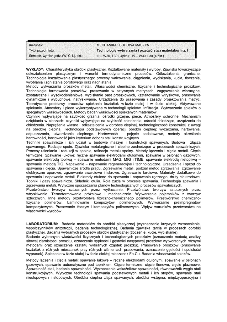 Kierunek: MECHANIKA I BUDOWA MASZYN Tytuł przedmiotu: Technologie wytwarzania i przetwórstwa materiałów inż. I Semestr, wymiar godz. (W, C, L), pkt.: III − W30, L30 ( 4pkt.); IV – W30, L30 (4 pkt.) WYKŁADY: Charakterystyka obróbki plastycznej. Kształtowane materiały i wyroby. Zjawiska towarzyszące odkształceniom plastycznym i warunki termodynamiczne procesów. Odkształcenia graniczne. Technologia kształtowania plastycznego: procesy walcowania, ciągnienia, wyciskania, kucia, tłoczenia, wyoblania i zgniatania obrotowego oraz nagniatania. Metody wytwarzania proszków metali. Właściwości chemiczne, fizyczne i technologiczne proszków. Technologie formowania proszków, prasowanie w sztywnych matrycach, zagęszczanie wibracyjne, izostatyczne i wysokociśnieniowe, wyciskanie past proszkowych, kształtowanie wtryskowe, prasowanie dynamiczne i wybuchowe, natryskiwanie. Urządzenia do prasowania i zasady projektowania matryc. Teoretyczne podstawy procesów spiekania kształtek w fazie stałej i w fazie ciekłej. Aktywowane spiekanie. Atmosfery i piece wykorzystywane w technologii spieków. Infiltracja. Wytwarzanie spieków o specjalnych właściwościach. Metody badań właściwości spiekanych materiałów. Czynniki wpływające na szybkość grzania, ośrodki grzejne, piece. Atmosfery ochronne. Mechanizm oziębiania w cieczach: czynniki wpływające na szybkość chłodzenia, ośrodki chłodzące, urządzenia do chłodzenia. Naprężenia własne i odkształcenia w obróbce cieplnej, technologiczność konstrukcji z uwagi na obróbkę cieplną. Technologia podstawowych operacji obróbki cieplnej: wyżarzania, hartowania, odpuszczania, utwardzania cieplnego. Hartowność − pojęcie podstawowe, metody określania hartowności, hartowność jako kryterium doboru stali konstrukcyjnych. Techniki spawalnicze i ich udział w budowie maszyn i konstrukcji spawanych. Budowa złącza spawanego. Rodzaje spoin. Zjawiska metalurgiczne i cieplne zachodzące w procesach spawalniczych. Procesy utleniania i redukcji w spoinie, rafinacja metalu spoiny. Metody łączenia i cięcia metali. Cięcie termiczne. Spawanie łukowe: ręczne spawanie elektrodami otulonymi, spawanie w osłonach gazowych, spawanie elektrodą topliwą – spawanie metodami MAG, MIG i TIME, spawanie elektrodą nietopliwą – spawanie metodą TIG. Napawanie − napawanie regeneracyjne i technologiczne. Urządzenia i sprzęt do spawania i cięcia. Spawalnicze źródła prądu. Zgrzewanie metali, podział metod zgrzewania, zgrzewanie elektryczne oporowe, zgrzewanie zwarciowe i iskrowe. Zgrzewanie tarciowe. Materiały dodatkowe do spawania i napawania metali. Elektrody otulone do spawania i napawania ręcznego, druty elektrodowe. Topniki i gazy spawalnicze. Składniki otulin. Rola żużla w procesie spawania. Technologia spawania i zgrzewania metali. Wytyczne sporządzania planów technologicznych procesów spawalniczych. Przetwórstwo tworzyw sztucznych przez wytłaczanie. Przetwórstwo tworzyw sztucznych przez wtryskiwanie. Termoformowanie próżniowe i mechanicznie. Wytwarzanie pojemników z tworzyw sztucznych. Inne metody przetwórstwa fizyczno-chemicznego polimerów. Przetwórstwo chemicznofizyczne polimerów. Laminowanie kompozytów polimerowych. Wytwarzanie preimpregnatów kompozytowych. Prasowanie tłoczyw i kompozytów polimerowych. Wpływ warunków przetwórstwa na właściwości wyrobów LABORATORIUM: Badania materiałów do obróbki plastycznej (wyznaczanie krzywych wzmocnienia, współczynników anizotropii, badania technologiczne). Badania zjawiska tarcia w procesach obróbki plastycznej. Badania wybranych procesów obróbki plastycznej (tłoczenie, kucie, wyciskanie). Badanie wybranych właściwości fizycznych i technologicznych proszków (oznaczenie metodą analizy sitowej ziarnistości proszku, oznaczenie sypkości i gęstości nasypowej proszków wytworzonych różnymi metodami oraz oznaczenie kształtu wybranych cząstek proszku). Prasowanie proszków (prasowanie kształtek z różnych mieszanek przy różnych ciśnieniach prasowania, oznaczenie gęstości i spoistości wyprasek). Spiekanie w fazie stałej i w fazie ciekłej mieszanek Fe-Cu. Badania właściwości spieków. Metody łączenia i cięcia metali: spawanie łukowe – ręczne elektrodami otulonymi, spawanie w osłonach gazowych, spawanie automatyczne pod topnikiem. Cięcie termiczne: cięcie tlenowe, cięcie plazmowe. Spawalność stali, badania spawalności. Wyznaczanie wskaźników spawalności, równoważnik węgla stali konstrukcyjnych. Wytyczne technologii spawania podstawowych metali i ich stopów, spawanie stali niestopowych i stopowych. Obróbka cieplna złącz spawanych: obróbka wstępna, międzyoperacyjna i końcowa; parametry obróbki cieplnej. Badania odbiorcze złącz spawanych. Badania jakości mas formierskich, Kontrola jakości tworzyw odlewniczych w procesie kształtowania odlewów, Badania użytkowych własności odlewów. Naprężenia własne i odkształcenia w obróbce cieplnej, technologiczność konstrukcji z uwagi na obróbkę cieplną. Technologia podstawowych operacji obróbki cieplnej: wyżarzania, hartowania, odpuszczania, utwardzania cieplnego. Hartowność − pojęcie podstawowe, metody określania hartowności, hartowność jako kryterium doboru stali konstrukcyjnych. Przetwórstwo polimerów – metoda wtryskiwania, schemat wtryskarki, cykle pracy, wpływ parametrów na jakość wyrobów. Wytłaczanie profili, wymogi technologiczne przy przetwórstwie. Spienianie termoplastycznych tworzyw sztucznych. Otrzymywanie styropianu. Wulkanizacja i lepkość mieszanek gumowych. Odlewanie tworzyw utwardzalnych. Wytwarzanie kompozytów Osoba odpowiedzialna za przedmiot: Prof. dr hab. inż. Jan Kazior Jednostka organizacyjna: Instytut Inżynierii Materiałowej (M-2)