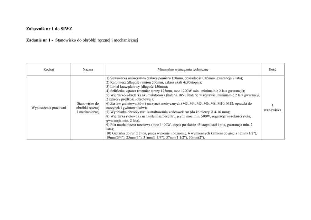 Załącznik nr 1 do SIWZ Zadanie nr 1 - Stanowisko do obróbki ręcznej i mechanicznej Rodzaj Wyposażenie pracowni Nazwa Minimalne wymagania techniczne Ilość Stanowisko do obróbki ręcznej i mechanicznej 1) Suwmiarka uniwersalna (zakres pomiaru 150mm, dokładność 0,05mm, gwarancja 2 lata); 2) Kątomierz (długość ramion 200mm, zakres skali 4x90stopni); 3) Liniał krawędziowy (długość 150mm); 4) Szlifierka kątowa (rozmiar tarczy 125mm, moc 1200W min., minimalnie 2 lata gwarancji); 5) Wiertarko-wkrętarka akumulatorowa (bateria 18V, 2baterie w zestawie, minimalnie 2 lata gwarancji, 2 zakresy prędkości obrotowej); 6) Zestaw gwintowników i narzynek metrycznych (M3, M4, M5, M6, M8, M10, M12, oprawki do narzynek i gwintowników); 7) Wyoblarka obrzeży rur i kształtowania końcówek rur (do kołnierzy Ø 4-16 mm); 8) Wiertarka stołowa (z uchwytem samocentrującym, moc min. 500W, regulacja wysokości stołu, gwarancja min. 2 lata); 9) Piła mechaniczna tarczowa (moc 1400W, cięcie po skosie 45 stopni stół i piła, gwarancja min. 2 lata); 10) Giętarka do rur (12 ton, praca w pionie i poziomie, 6 wymiennych kamieni do gięcia 12mm(1/2"), 19mm(3/4"), 25mm(1"), 31mm(1 1/4"), 37mm(1 1/2"), 50mm(2"). 3 stanowiska FORMULARZ RZECZOWO – CENOWY Dostawa wyposażenia pracowni Technika urządzeń i systemów energii odnawialnej dla Centrum Kształcenia Zawodowego w Puławach lp. nazwa przedmiotu opis przedmiotu producent i model jm Cena ilość jednostkowa brutto Wartość brutto (ilość x cena jedn. brutto) 1) Suwmiarka uniwersalna (zakres pomiaru 150mm, dokładność 0,05mm, gwarancja 2 lata); 2) Kątomierz (długość ramion 200mm, zakres skali 4x90stopni); 3) Liniał krawędziowy (długość 150mm); 4) Szlifierka kątowa (rozmiar tarczy 125mm, moc minimum 1200W , minimalnie 2 lata gwarancji); 5) Wiertarko-wkrętarka akumulatorowa (bateria 18V, 2 baterie w zestawie, minimalnie 2 lata gwarancji, 2 zakresy prędkości obrotowej); 1 Stanowisko do obróbki ręcznej i mechanicznej 6) Zestaw gwintowników i narzynek metrycznych (M3, M4, M5, M6, M8, M10, M12, oprawki do narzynek i gwintowników); St. 3 7) Wyoblarka obrzeży rur i kształtowania końcówek rur (do kołnierzy Ø 4-16 mm); 8) Wiertarka stołowa (z uchwytem samocentrującym, moc min. 500W, regulacja wysokości stołu, gwarancja min. 2 lata); 9) Piła mechaniczna tarczowa (moc 1400W, cięcie po skosie 45 stopni stół i piła, gwarancja min. 2 lata); 10) Giętarka do rur (12 ton, praca w pionie i poziomie, 6 wymiennych kamieni do gięcia 12mm(1/2"), 19mm(3/4"), 25mm(1"), 31mm(1 1/4"), 37mm(1 1/2"), 50mm(2"). Razem wartość brutto poz. 1 Razem wartość brutto słownie złotych: …………………………………………….. Miejscowość, data ………………………………………………… Podpis Wykonawcy