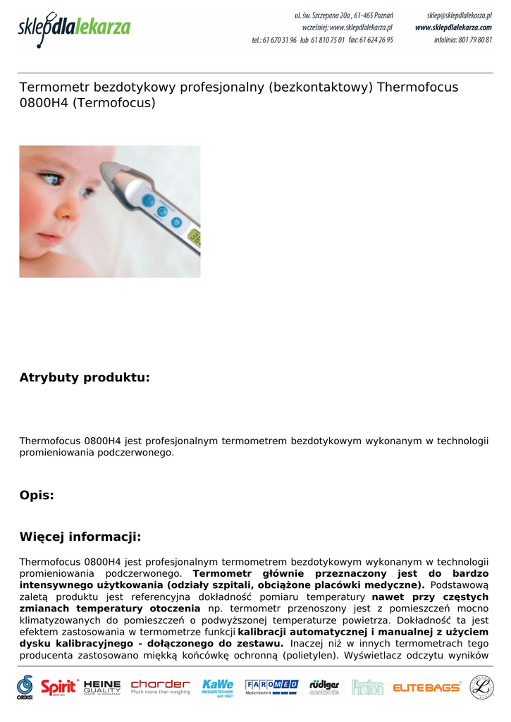 Termometr bezdotykowy profesjonalny (bezkontaktowy) Thermofocus 0800H4 (Termofocus) Atrybuty produktu: Thermofocus 0800H4 jest profesjonalnym termometrem bezdotykowym wykonanym w technologii promieniowania podczerwonego. Opis: Więcej informacji: Thermofocus 0800H4 jest profesjonalnym termometrem bezdotykowym wykonanym w technologii promieniowania podczerwonego. Termometr głównie przeznaczony jest do bardzo intensywnego użytkowania (odziały szpitali, obciążone placówki medyczne). Podstawową zaletą produktu jest referencyjna dokładność pomiaru temperatury nawet przy częstych zmianach temperatury otoczenia np. termometr przenoszony jest z pomieszczeń mocno klimatyzowanych do pomieszczeń o podwyższonej temperaturze powietrza. Dokładność ta jest efektem zastosowania w termometrze funkcji kalibracji automatycznej i manualnej z użyciem dysku kalibracyjnego - dołączonego do zestawu. Inaczej niż w innych termometrach tego producenta zastosowano miękką końcówkę ochronną (polietylen). Wyświetlacz odczytu wyników ma funkcję podświetlenia. Funkcje termometru: pomiar temperatury ciała. Możliwy pomiar w okolicach: czoło, jama ustna, okolice odbytu, dół pachowy, pomiar temperatury: cieczy, powietrza, dowolnego przedmiotu, funkcja kalibracji: automatyczna i manualna z użyciem dysku kalibracyjnego (w zestawie). W zestawie: Termometr 0800H4, płyta instruktażowa DVD, dysk kalibracyjny, specjalna długa zapinana smycz, komplet baterii alkalicznych AAA. Powered by TCPDF (www.tcpdf.org)
