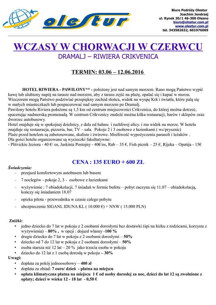 Biuro Podróży Olestur Joachim Jendrzej ul. Rynek 20/1 46-300 Olesno [email protected] www.olestur.com.pl tel. 343582632, 601976069 WCZASY W CHORWACJI W CZERWCU DRAMALJ – RIWIERA CRIKVENICA TERMIN: 03.06 – 12.06.2016 HOTEL RIWIERA - PAWILONY** - położony jest nad samym morzem. Rano mogą Państwo wypić kawę lub ulubiony napój na tarasie nad morzem, aby z tarasu zejść na plażę, opalać się i kapać w morzu. Wieczorem mogą Państwo podziwiać przepiękny zachód słońca, widok na wyspę Krk i światła, które palą się w małych miasteczkach lub pospacerować nad samym morzem po Dramalj. Pawilony hotelu Riviera położone są 1,5 km od centrum miejscowości Crikvenica, do której można dotrzeć, spacerując nadmorską promenadą. W centrum Crikvenicy znaleźć można kilka restauracji, barów i sklepów oraz dworzec autobusowy. Hotel znajduje się w spokojnej dzielnicy, z dala od hałasu i ruchliwej ulicy. i ma widok na morze. W hotelu znajduje się restauracja, pizzeria, bar, TV – sala. Pokoje 2 i 3 osobowe z łazienkami ( wc/prysznic) Plaże przed hotelem są zabetonowane, skaliste i żwirowe. Możliwość wypożyczenia parasoli i leżaków . Dla gości hotelu organizowane są wycieczki fakultatywne: - Plitvickie Jeziora - 40 €/ os, Jaskinia Postojny - 40€/os, Rab – 35 €, Fish picnik – 25 €, Rijeka – Opatija - 15€ CENA : 135 EURO + 600 ZŁ Świadczenia: przejazd komfortowym autobusem lub busem 7 noclegów - pokoje 2, 3 - osobowe z łazienkami wyżywienie : 7 obiadokolacji, 7 śniadań w formie bufetu – pobyt zaczyna się 11.07 – obiadokolacją, kończy się śniadaniem 18.07 opieka pilota - przewodnika w czasie całego pobytu ubezpieczenie SIGANL IDUNA KL ( 10.000 €) + NNW ( 15.000 PLN) Zniżki: • jedno dziecko do 7 lat w pokoju z 2 osobami dorosłymi bez dostawki (śpi na łóżku z rodzicami, korzysta z wyżywienia) – 80% , w opcji : dojazd własny -100 % • drugie dziecko do 7 lat w pokoju z 2 osobami dorosłymi – 50% • dziecko od 7 do 12 lat w pokoju z 2 osobami dorosłymi – 50% • osoba starsza niż 12 lat – 20 % jako trzecia osoba w pokoju • dziecko do 12 lat z 1 osobą dorosłą w pokoju – 30% Uwagi: • dopłata za pokój jednoosobowy – 400 zł • dopłata za obiad: 7 euro/ dzień - płatna na miejscu • opłata klimatyczna płatna na miejscu 1 € od osoby dorosłej za noc, dzieci do lat 12 są zwolnione z opłaty; dzieci w wieku 12 - 18 lat - 0,50 €