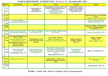 ZAJĘCIA DODATKOWE UCZNIÓW SP 38 - KLASA I - VI rok szkolny 2015 / 2016 lek -cja godz. Poniedziałek 7.25 8.15 1. 8.10 8.55 2. 9.05 Zajęcia rozwijające zainteresowania uczniówkl.IB 9.50 Wtorek Środa Czwartek Przygotowanie do sprawdzianu -matematyka kl.VI Wspomaganie rozwoju uczniów oraz rozwijanie zainteresowań uczniów ( język polski) gr.I “Mały matematyk” - kółko matematyczne kl.II Wspomaganie rozwoju uczniów oraz rozwijanie zainteresowań uczniów ( język polski) gr.II Zajęcia wyrównawcze - język polski) kl.VB 1 i 3 piątek miesiąca lub wg potrzeb Zajęcia zwiększające szanse edukacyjne uczniów kl. I A 3. 10.0010.45 5. 12.00 12.45 6. 7. 8. Zajęcia rozwijające zainteresowania uczniów , konkursy (historia , przyroda ) kl.I - VI Zajęcia artystyczne kl.II B język angielski ( dodatkowy) Gry i zabawy kształtujące mowę dziecka kl.IC Język angielski informatycznie -kl.VA , VB ,VI Zajęcia czytelnicze “Przed sprawdzianem” kl.VI Wspomaganie rozwoju ucznia kl.IVA,VA,VB,VI (przyroda ,historia) Wspomaganie rozwoju ucznia -kl.IVb (przyroda ,historia) 13.45 14.30 Sprawy Samorządu Uczniowskiego Język hiszpański - kl.I - VI Wspomaganie rozwoju ucznia z trudnościami z matematyki kl.IVB 14.30 15.15 Zajęcia sportowe -kl.I - VI 12.55 13.40 Piątek Zajęcia rozwijające zainteresowania uczniów kl.IC Język włoski - kl.IIB, IA Zajęcia zwiększające szanse edukacyjne uczniów zdolnych kl.III Wspomaganie rozwoju ucznia z trudnościami z matematyki kl.IVA Język włoski - kl.VB , IIIA,IB Szachy Zajęcia sportowe -kl.I - VI Zajęcia z ceramiki kl.I B i IIA Zajęcia czytelnicze “Godzina z lekturą” kl.II - III Przygotowanie do sprawdzianu z języka angielskigo kl.VI Wspomaganie rozwoju ucznia z trudnościami (zajęcia techniczne) kl.VI 9. 15.1516.15 Zajęcia z ceramiki kl.IIIA , II B Kółko religijne kl.I -III Zajęcia z ceramiki kl.IA , IV Zajęcia taneczne kl.I - III (od 14.15) Zajęcia taneczne kl.IV - VI Ponadto : Projekt “ Kino - Szkoła” we współpracy z BCK ( wg harmonogramu)
