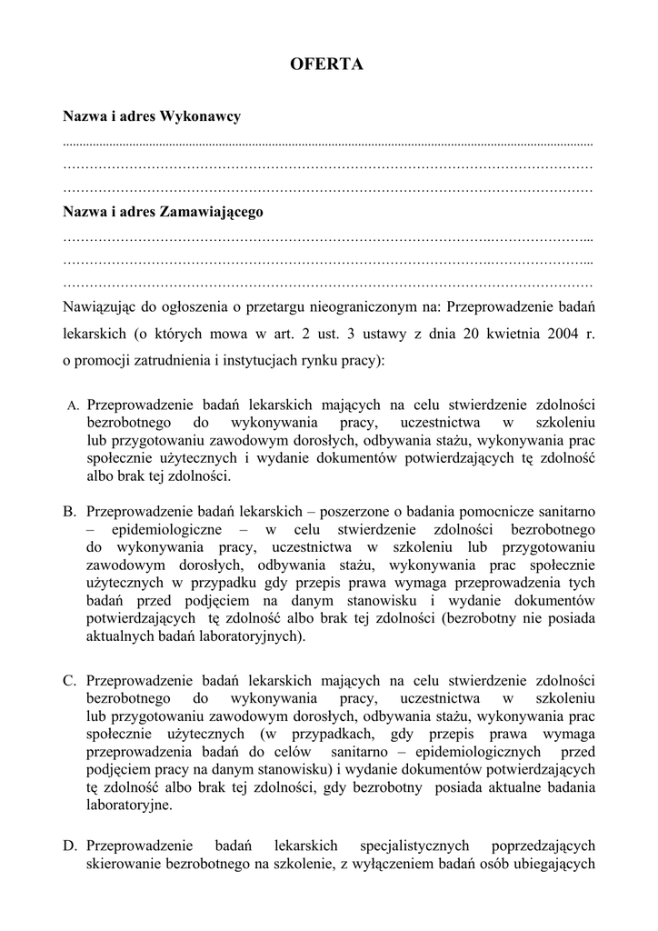 OFERTA Nazwa i adres Wykonawcy ................................................................................................................................................................ ………………………………………………………………………………………………………… ………………………………………………………………………………………………………… Nazwa i adres Zamawiającego …………………………………………………………………………………….…………………... …………………………………………………………………………………….…………………... ………………………………………………………………………………………………………… Nawiązując do ogłoszenia o przetargu nieograniczonym na: Przeprowadzenie badań lekarskich (o których mowa w art. 2 ust. 3 ustawy z dnia 20 kwietnia 2004 r. o promocji zatrudnienia i instytucjach rynku pracy): A. Przeprowadzenie badań lekarskich mających na celu stwierdzenie zdolności bezrobotnego do wykonywania pracy, uczestnictwa w szkoleniu lub przygotowaniu zawodowym dorosłych, odbywania stażu, wykonywania prac społecznie użytecznych i wydanie dokumentów potwierdzających tę zdolność albo brak tej zdolności. B. Przeprowadzenie badań lekarskich – poszerzone o badania pomocnicze sanitarno – epidemiologiczne – w celu stwierdzenie zdolności bezrobotnego do wykonywania pracy, uczestnictwa w szkoleniu lub przygotowaniu zawodowym dorosłych, odbywania stażu, wykonywania prac społecznie użytecznych w przypadku gdy przepis prawa wymaga przeprowadzenia tych badań przed podjęciem na danym stanowisku i wydanie dokumentów potwierdzających tę zdolność albo brak tej zdolności (bezrobotny nie posiada aktualnych badań laboratoryjnych). C. Przeprowadzenie badań lekarskich mających na celu stwierdzenie zdolności bezrobotnego do wykonywania pracy, uczestnictwa w szkoleniu lub przygotowaniu zawodowym dorosłych, odbywania stażu, wykonywania prac społecznie użytecznych (w przypadkach, gdy przepis prawa wymaga przeprowadzenia badań do celów sanitarno – epidemiologicznych przed podjęciem pracy na danym stanowisku) i wydanie dokumentów potwierdzających tę zdolność albo brak tej zdolności, gdy bezrobotny posiada aktualne badania laboratoryjne. D. Przeprowadzenie badań lekarskich specjalistycznych poprzedzających skierowanie bezrobotnego na szkolenie, z wyłączeniem badań osób ubiegających się o uprawnienia kierowców (prawo jazdy kat. C, C+E, D, B+E,), operatorów wózków jezdniowych, pracowników magazynowych, instruktorów nauki jazdy i wydanie dokumentu potwierdzającego tę zdolność albo brak tej zdolności. Zamówienie jest finansowane ze środków Funduszu Pracy, PFRON-u lub Europejskiego Funduszu Społecznego i realizowane w ramach aktywizacji zawodowej osób, w tym w ramach projektów współfinansowanych ze środków Unii Europejskiej. oferuję przeprowadzenie tych badań dla Powiatowego Urzędu Pracy w Lesznie na warunkach określonych w „Specyfikacji istotnych warunków zamówienia publicznego” sporządzonej przez Zamawiającego za następującą cenę: Cena badania 1 osoby: 1) dla badania określonego w SIWZ w pkt 3A …………….zł, w tym VAT ………….… 2) dla badania określonego w SIWZ w pkt 3B ……………...zł, w tym VAT ……..….. 3) dla badania określonego w SIWZ w pkt 3C ……………...zł, w tym VAT ……..….. 4) dla badania określonego w SIWZ w pkt 3D ……………...zł, w tym VAT ……..….. Termin płatności .................................................................................................... Termin wykonania zamówienia ............................................................................ Warunki płatności ................................................................................................. Data ................................. Podpis składającego ofertę .................................................... Załączniki: 1. oświadczenie o spełnianiu warunków udziału w postępowaniu według wzoru załączonego do specyfikacji, 2. aktualny odpis z właściwego rejestru albo aktualne zaświadczenie o wpisie do ewidencji działalności gospodarczej, jeśli odrębne przepisy wymagają wpisu do rejestru lub zgłoszenia do ewidencji działalności gospodarczej, wystawione nie wcześniej niż 6 miesięcy przed upływem terminu składania ofert. 3. aktualne zaświadczenie właściwego naczelnika urzędu skarbowego oraz właściwego Zakładu Ubezpieczeń Społecznych lub KRUS potwierdzających odpowiednio, że wykonawca nie zalega z opłacaniem podatków, opłat oraz składek na ubezpieczenie zdrowotne lub społeczne lub zaświadczeń, że uzyskał przewidziane prawem zwolnienie, odroczenie lub rozłożenie na raty zaległych płatności lub wstrzymanie w całości wykonywania decyzji właściwego organu – wystawionych nie wcześniej niż 3 miesiące przed upływem terminu składania ofert. 4. dokument potwierdzający, że wykonawca: - jest lekarzem posiadającym uprawnienia do przeprowadzania badań profilaktycznych albo zakładem opieki zdrowotnej zatrudniającym lekarza posiadającego uprawnienia do prowadzenia badań profilaktycznych (badania pkt 3A , 3B, 3C SIWZ), - jest lekarzem posiadającym specjalizację w dziedzinie medycyny pracy albo jest zakładem opieki zdrowotnej zatrudniającym posiadającego specjalizację w dziedzinie medycyny pracy lekarza (badania pkt 3D SIWZ) 5. Wykaz niezbędnych do wykonania zamówienia narzędzi i urządzeń, którymi dysponuje lub będzie dysponował wykonawca. 6. Wykaz osób i podmiotów, którymi dysponuje lub będzie dysponował wykonawca i które będą uczestniczyć w wykonywaniu zamówienia, wraz z informacjami na temat ich kwalifikacji zawodowych, doświadczenia i wykształcenia niezbędnych, n