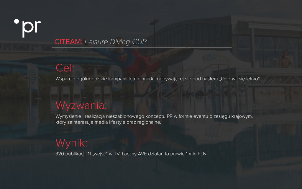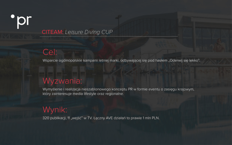 CITEAM: Leisure Diving CUP Cel: Wsparcie ogólnopolskie kampanii letniej marki, odbywającej się pod hasłem „Oderwij się lekko”. Wyzwania: Wymyślenie i realizacja nieszablonowego konceptu PR w formie eventu o zasięgu krajowym, który zainteresuje media lifestyle oraz regionalne. Wynik: 320 publikacji, 11 „wejść” w TV. Łączny AVE działań to prawie 1 mln PLN. ZAŁOŻENIA PROJEKTU Cele Zbudowanie widoczności klienta w mediach lifestyle i telewizjach śniadaniowych. Promocja marki CITEAM zgodnie z przyjętymi key messages. Stworzenie angażującej komunikacji wokół cyklu eventów. Opis projektu Stworzyliśmy koncept i odpowiadaliśmy za kompleksową komunikację 5 eventów, które swtorzone zostały z ideą pierwszych otwartych mistrzostw w Leisure Diving (skakanie do wody w przebraniach) w Polsce. POMYSŁ I REALIZACJA Agencja odpowiadała za realizację działań eventowych i pełny zakres działań komunikacyjnych kampanii "Oderwij się lekko". W ramach obsługi PR nawiązano współpracę z Dzień Dobry TVN, TVP (Kawa, czy herbata?) . W kampanii wykorzystano także kanały social media do angażowania fanów i budowania relacji z marką. W ramach „pierwszych polskich mistrzostw” Leisure Diving nawiązana także kontakt z twórcami trendu, którzy uczestniczyli w wyborze najlepszych skoków. Do akcji zaangażowano także wielu celebrytów. Swoje skoki do wody oddali m.in. Maciej Musiał, Radosław Majdan, czy XXXXX EFEKTY DZIAŁAŃ Uzyskano ponad 320 publikacji lub materiałów TV i radio (11 „wejść” w TV). Reportaże z akcji emitowane były w największych stacjach ogólnopolskich (Polsat, TVP, TVN). Ekwiwalent reklamowy, po miesiącu akcji, wyniósł prawie 1 mln PLN. Grupa dotPR [email protected] +48 604 705 233