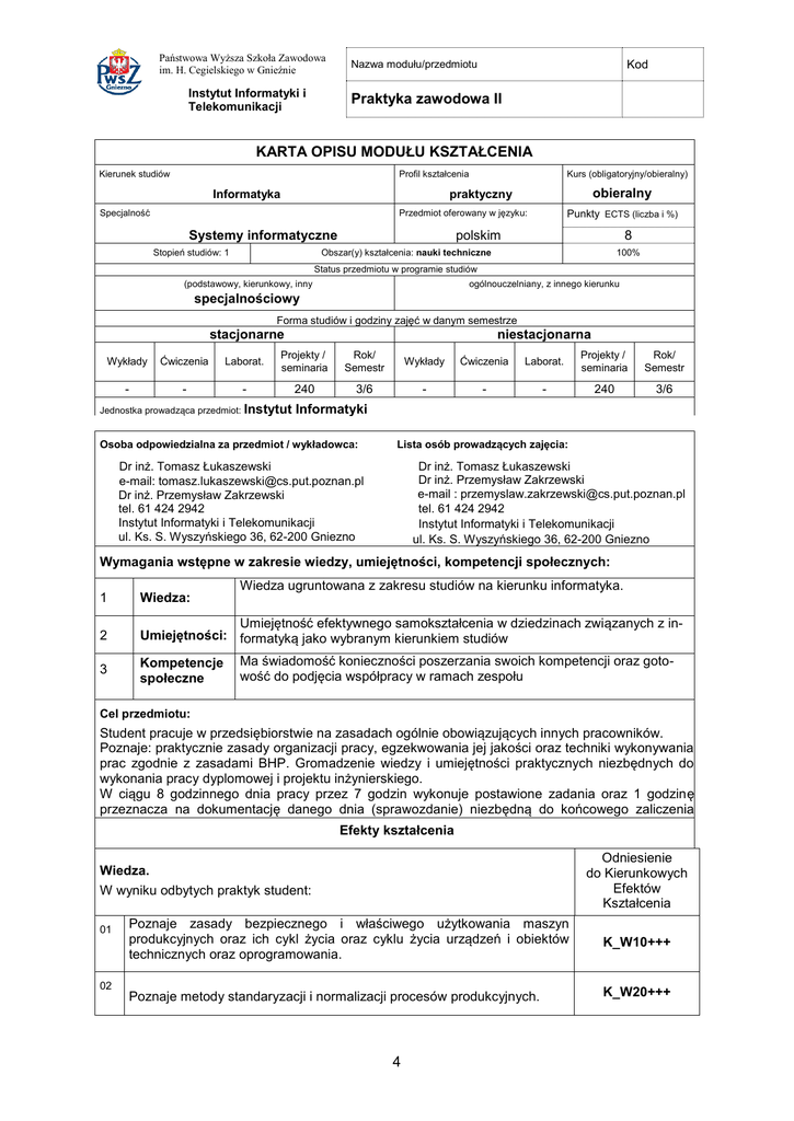 Państwowa Wyższa Szkoła Zawodowa im. H. Cegielskiego w Gnieźnie Instytut Informatyki i Telekomunikacji Nazwa modułu/przedmiotu Kod Praktyka zawodowa II KARTA OPISU MODUŁU KSZTAŁCENIA Kierunek studiów Profil kształcenia Informatyka Kurs (obligatoryjny/obieralny) obieralny praktyczny Specjalność Przedmiot oferowany w języku: Systemy informatyczne Punkty ECTS (liczba i %) polskim 8 Obszar(y) kształcenia: nauki techniczne Stopień studiów: 1 100% Status przedmiotu w programie studiów ogólnouczelniany, z innego kierunku (podstawowy, kierunkowy, inny specjalnościowy Forma studiów i godziny zajęć w danym semestrze stacjonarne niestacjonarna Wykłady Ćwiczenia Laborat. Projekty / seminaria Rok/ Semestr Wykłady Ćwiczenia Laborat. Projekty / seminaria Rok/ Semestr - - - 240 3/6 - - - 240 3/6 Jednostka prowadząca przedmiot: Instytut Informatyki Osoba odpowiedzialna za przedmiot / wykładowca: Lista osób prowadzących zajęcia: Dr inż. Tomasz Łukaszewski e-mail: [email protected] Dr inż. Przemysław Zakrzewski tel. 61 424 2942 Instytut Informatyki i Telekomunikacji ul. Ks. S. Wyszyńskiego 36, 62-200 Gniezno Dr inż. Tomasz Łukaszewski Dr inż. Przemysław Zakrzewski e-mail : [email protected] tel. 61 424 2942 Instytut Informatyki i Telekomunikacji ul. Ks. S. Wyszyńskiego 36, 62-200 Gniezno Wymagania wstępne w zakresie wiedzy, umiejętności, kompetencji społecznych: Wiedza ugruntowana z zakresu studiów na kierunku informatyka. 1 Wiedza: 2 Umiejętność efektywnego samokształcenia w dziedzinach związanych z inUmiejętności: formatyką jako wybranym kierunkiem studiów 3 Kompetencje społeczne Ma świadomość konieczności poszerzania swoich kompetencji oraz gotowość do podjęcia współpracy w ramach zespołu Cel przedmiotu: Student pracuje w przedsiębiorstwie na zasadach ogólnie obowiązujących innych pracowników. Poznaje: praktycznie zasady organizacji pracy, egzekwowania jej jakości oraz techniki wykonywania prac zgodnie z zasadami BHP. Gromadzenie wiedzy i umiejętności praktycznych niezbędnych do wykonania pracy dyplomowej i projektu inżynierskiego. W ciągu 8 godzinnego dnia pracy przez 7 godzin wykonuje postawione zadania oraz 1 godzinę przeznacza na dokumentację danego dnia (sprawozdanie) niezbędną do końcowego zaliczenia praktyki. Efekty kształcenia Odniesienie do Kierunkowych Efektów Kształcenia Wiedza. W wyniku odbytych praktyk student: 01 02 Poznaje zasady bezpiecznego i właściwego użytkowania maszyn produkcyjnych oraz ich cykl życia oraz cyklu życia urządzeń i obiektów technicznych oraz oprogramowania. K_W10+++ Poznaje metody standaryzacji i normalizacji procesów produkcyjnych. K_W20+++ 4 Praktyka zawodowa II 03 Poznaje technologie wytwarzania stosowane w przedsiębiorstwach produkcyjnych i/lub usługowych oraz procesy podstawowe i pomocnicze w nich zachodzące. K_W09+++ K_W11+++ Umiejętności. W wyniku odbytych praktyk student potrafi: 01 Pracować w środowisku przemysłowym stosując zasady bezpieczeństwa i higieny pracy. K_U10+++ 02 Korzystać z norm, przepisów oraz instrukcji obsługi urządzeń i obiektów. K_U20+++ 03 04 Przeanalizować proces produkcyjny pod katem jego sprawności, efektywności, wykorzystania zdolności produkcyjnych i ekonomicznej opłacalności. Zinterpretować uzyskane wyniki. Zaproponować działania korygujące. Zapewnić utrzymanie urządzeń i maszyn produkcyjnych oraz obiektów i systemów technicznych. K_U11++ K_U17+++ K_U018+++ Kompetencje społeczne. W wyniku odbytych praktyk student zdobędzie następujące kompetencje: 01 Potrafi przekazywać w sposób zrozumiały zdobytą wiedzę i wymieniać informacje z najbliższym otoczeniem w działalności zawodowej. K_K01++ K_K07++ 02 Rozumie pozatechniczne ( w tym ekologiczne) skutki swojego działania i jego wpływu na środowisko i potrafi dokonać wyboru właściwych metod K_K02+++ 03 Potrafi działać i współpracować w zespole i przyjmować w nim różne role. K_K03+++ Sposoby sprawdzenia efektów kształcenia Sprawozdanie z odbytej praktyki zgodnie z wytycznymi dla praktyk obowiązującymi w PWSZ w Gnieźnie, zatwierdzone przez zakładowego opiekuna praktyk i ocenione przez uczelnianego opiekuna praktyki zawiera: • krótki opis zadań realizowanych w przedsiębiorstwie we współpracy z opiekunem i samodzielnie; • wyniki obserwacji i uwagi dotyczące wykonywanej pracy i wykorzystywanych narzędzi informatycznych, sprzętu, oprogramowania itp. Ocena: warunki konieczne: -obecność i dyscyplina pracy - aktywność w realizacji programu praktyk - dbałość o bezpieczeństwo i higienę pracy Składniki oceny końcowej: (średnia z ocen): • ocena formująca zakładowego opiekuna praktyk (50%); • ocena formująca sprawozdania z odbytej praktyki (20%); • ocena formująca wiedzy i umiejętności oraz kompetencji w trakcie rozmowy praktykanta z uczelnianym opiekunem praktyki (30%). Minimalne wymagania zaliczenia praktyki: • odbycie praktyki w pełnym wymiarze (w trybie ustalonym z uczelnią oraz przedsiębiorstwem)*; • pozytywna opinia opiekuna zakładowego; • opracowanie sprawozdania z praktyki zawierającego: • ogólny opis zakładu; • opis wykonywanych zadań; • własne wnioski i spostrzeżenia. 5 Praktyka zawodowa II Zaliczenia praktyki, zgodnie z regulaminem praktyk, dokonuje Dyrektor Instytutu na podstawie pozytywnej opinii opiekuna praktyk z ramienia Uczelni. *) Sposób odbywania praktyk wynika z ustaleń przedstawicieli uczelni oraz przedsiębiorstwa. Dopuszcza się realizację w standardzie 2 razy po 6 tygodni po semestrze 4 i 6 studiów jak również z innym podziałem, z tym że liczbę punktów ECTS przypisuje się po 1 punkcie na każdy tydzień praktyki, jednakże suma wymaganych punktów powinna być uzyskana nie później niż na semestrze 6. Treści programowe 1. Opis ogólny przedsiębiorstwa ( status formalnoprawny, przedmiot działalności, zarys struktury organizacyjnej –główne stanowiska kier