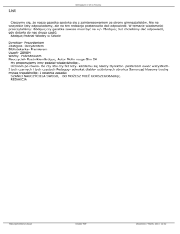 Gimnazjum nr 24 w Toruniu List Cieszymy się, że nasza gazetka spotyka się z zainteresowaniem ze strony gimnazjalistów. Nie na wszystkie listy odpowiadamy, ale na ten redakcja postanowiła dać odpowiedź. W temacie wiadomości przeczytaliśmy: „czy gazetka zawsze musi być na +/- ?” Już chcieliśmy dać odpowiedź, gdy dotarła do nas druga część: „Podział Władzy w Szkole Dyrektor- Prezydentem Zastępca- Decydentem Bibliotekarka- Premierem Uczeń- ZEREM Woźny- Pośrednikiem Nauczyciel- Rzeźnikiem” Autor Molin rouge Gim 24 My proponujemy inny podział władzy…. Uczniom po równo- Bo czy stoi czy też leży- każdemu się należy Dyrektor- pasterzem owiec wszystkichI tych czarnych i tych czystych Pedagog- adwokat diabła- uciśnionych obrońca Samorząd klasowy trochę myszą trąca… I ostatnia zasada: SZANUJ NAUCZYCIELA SWEGO, BO MOŻESZ MIEĆ GORSZEGO…. REDAKCJA http://gim24torun.cba.pl Kreator PDF Utworzono 7 March, 2017, 12:32