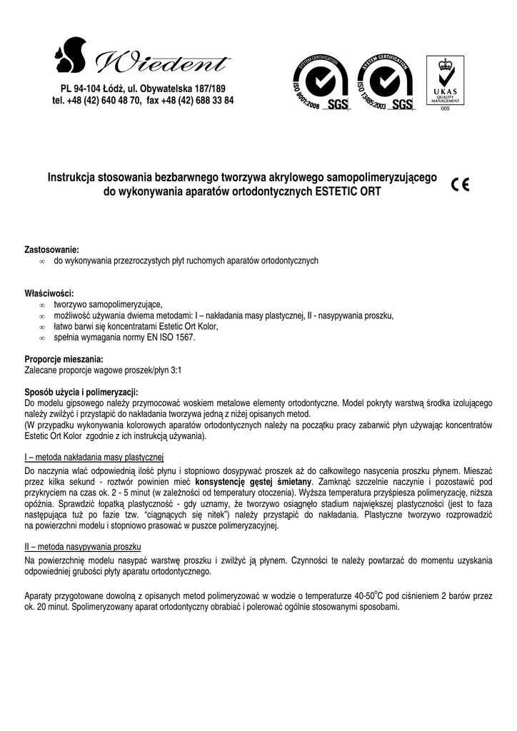 PL 94-104 Łódź, ul. Obywatelska 187/189 tel. +48 (42) 640 48 70, fax +48 (42) 688 33 84 Instrukcja stosowania bezbarwnego tworzywa akrylowego samopolimeryzującego do wykonywania aparatów ortodontycznych ESTETIC ORT Zastosowanie: • do wykonywania przezroczystych płyt ruchomych aparatów ortodontycznych Właściwości: • tworzywo samopolimeryzujące, • możliwość używania dwiema metodami: I – nakładania masy plastycznej, II - nasypywania proszku, • łatwo barwi się koncentratami Estetic Ort Kolor, • spełnia wymagania normy EN ISO 1567. Proporcje mieszania: Zalecane proporcje wagowe proszek/płyn 3:1 Sposób użycia i polimeryzacji: Do modelu gipsowego należy przymocować woskiem metalowe elementy ortodontyczne. Model pokryty warstwą środka izolującego należy zwilżyć i przystąpić do nakładania tworzywa jedną z niżej opisanych metod. (W przypadku wykonywania kolorowych aparatów ortodontycznych należy na początku pracy zabarwić płyn używając koncentratów Estetic Ort Kolor zgodnie z ich instrukcją używania). I – metoda nakładania masy plastycznej Do naczynia wlać odpowiednią ilość płynu i stopniowo dosypywać proszek aż do całkowitego nasycenia proszku płynem. Mieszać przez kilka sekund - roztwór powinien mieć konsystencję gęstej śmietany. Zamknąć szczelnie naczynie i pozostawić pod przykryciem na czas ok. 2 - 5 minut (w zależności od temperatury otoczenia). Wyższa temperatura przyśpiesza polimeryzację, niższa opóźnia. Sprawdzić łopatką plastyczność - gdy uznamy, że tworzywo osiągnęło stadium największej plastyczności (jest to faza następująca tuż po fazie tzw. “ciągnących się nitek”) należy przystąpić do nakładania. Plastyczne tworzywo rozprowadzić na powierzchni modelu i stopniowo prasować w puszce polimeryzacyjnej. II – metoda nasypywania proszku Na powierzchnię modelu nasypać warstwę proszku i zwilżyć ją płynem. Czynności te należy powtarzać do momentu uzyskania odpowiedniej grubości płyty aparatu ortodontycznego. o Aparaty przygotowane dowolną z opisanych metod polimeryzować w wodzie o temperaturze 40-50 C pod ciśnieniem 2 barów przez ok. 20 minut. Spolimeryzowany aparat ortodontyczny obrabiać i polerować ogólnie stosowanymi sposobami. Producent zaleca umieszczenie w instrukcji dla pacjentów następujących wskazówek: • aparaty ortodontyczne należy myć szczoteczką do zębów używając pasty do zębów lub innych środków specjalnie przeznaczonych do pielęgnacji tego typu wyrobów, • aparatów ortodontycznych nie należy moczyć w substancjach silnie alkalicznych lub kwaśnych, aby uniknąć uszkodzenia powierzchni, • aparaty ortodontyczne, które uległy uszkodzeniu, może naprawiać wyłącznie protetyk lub lekarz stomatolog, • należy okresowo sprawdzać dopasowanie aparatów ortodontycznych. Przechowywanie: W szczelnie zamkniętych opakowaniach, w pomieszczeniach dobrze wentylowanych, w miejscach niedostępnych dla dzieci. Okres trwałości: 3 lata od daty produkcji UWAGA: Płyn łatwopalny, drażniący - unikać wdychania oparów i kontaktu ze skórą i oczami. W razie kontaktu spłukać obficie wodą, ewentualnie zgłosić się do lekarza okulisty. Nie wylewać resztek płynu do ujęć kanalizacyjnych. Ostrzega się protetyka przed wdychaniem pyłu podczas wykonywania prac protetycznych. Przy pracach tych zaleca się stosowanie wyciągu i maski przeciwpyłowej. Opakowania: Komplety: • • 500 g proszku, 250 ml płynu 2000 g proszku, 1000 ml płynu Pojedynczo: • • • • D 0311-1 500 g proszku 2000 g proszku 250 ml płynu 1000 ml płynu Data wydania: 19.01.2011