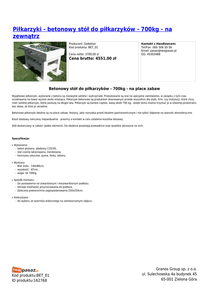 Piłkarzyki - betonowy stół do piłkarzyków - 700kg - na zewnątrz Producent: Golbeton Kod produktu: BET_01 Cena netto: 3700,00 zł Kontakt z Handlowcem: Tel/Fax: (68) 506 50 56 Email: [email protected] GG: 45303488 Cena brutto: 4551.00 zł Betonowy stół do piłkarzyków - 700kg - na place zabaw Wyjątkowe piłkarzyki, wykonane z betonu są niezwykle solidne i wytrzymałe. Produkowane są one na specjalne zamówienie, w związku z tym czas oczekiwania na towar wynosi około miesiąca. Piłkarzyki betonowe są produktem skierowanym przede wszystkim dla osób, firm, czy instytucji, które chcą mieć solidne piłkarzyki, które posłużą na długie lata. Piłkarzyki są bardzo ciężkie, ważą około 700 kg - dzięki temu można trzymać je w otwartej przestrzeni, bez obaw, że ktoś je ukradnie. Betonowe piłkarzyki idealne są na place zabaw, festyny, jako rozrywka przed lokalem gastronomicznym i nie tylko! Odporne na warunki atmosferyczne. Koszt dostawy naliczany indywidualnie - prosimy o kontakt w celu ustalenia kosztów dostawy. Stół dostarczany w całości (jeden element). Do złożenia pozostają prowadnice oraz wszelkie akcesoria na nich. Specyfikacja: ● Wykonanie: beton płukany, gładzony C25/30, stal czarna lakierowana, nierdzewna, tworzywa sztuczne, guma, farby, lakiery. ❍ ❍ ❍ ● Wymiary: Blat stołu - 140x80cm, wysokość - 87cm, waga- ok 700kg. ❍ ❍ ❍ ● Sposób montażu: Do postawienia na utwardzonym i nieutwardzonym podłożu. Istnieje możliwość przymocowania do podłoża. Zalecona powierzchnia zagospodarowania 250x250cm. ❍ ❍ ❍ ● Kolorystyka: do wyboru ze wzornika widocznego na zamieszczonym zdjęciu. ❍ Kod produktu:BET_01 ID produktu:162768 Granos Group sp. z o.o. ul. Sulechowska 4a budynek 45 65-001 Zielona Góra