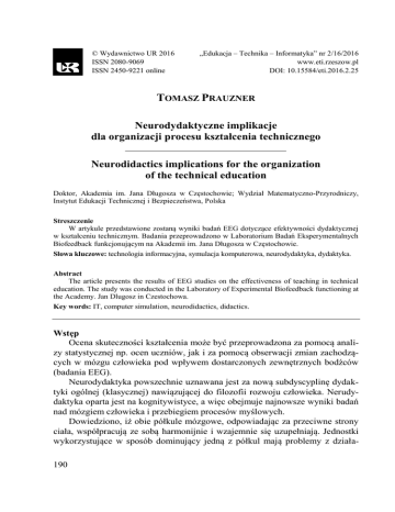 © Wydawnictwo UR 2016 ISSN 2080-9069 ISSN 2450-9221 online „Edukacja – Technika – Informatyka” nr 2/16/2016 www.eti.rzeszow.pl DOI: 10.15584/eti.2016.2.25 TOMASZ PRAUZNER Neurodydaktyczne implikacje dla organizacji procesu kształcenia technicznego Neurodidactics implications for the organization of the technical education Doktor, Akademia im. Jana Długosza w Częstochowie; Wydział Matematyczno-Przyrodniczy, Instytut Edukacji Technicznej i Bezpieczeństwa, Polska Streszczenie W artykule przedstawione zostaną wyniki badań EEG dotyczące efektywności dydaktycznej w kształceniu technicznym. Badania przeprowadzono w Laboratorium Badań Eksperymentalnych Biofeedback funkcjonującym na Akademii im. Jana Długosza w Częstochowie. Słowa kluczowe: technologia informacyjna, symulacja komputerowa, neurodydaktyka, dydaktyka. Abstract The article presents the results of EEG studies on the effectiveness of teaching in technical education. The study was conducted in the Laboratory of Experimental Biofeedback functioning at the Academy. Jan Dlugosz in Czestochowa. Key words: IT, computer simulation, neurodidactics, didactics. Wstęp Ocena skuteczności kształcenia może być przeprowadzona za pomocą analizy statystycznej np. ocen uczniów, jak i za pomocą obserwacji zmian zachodzących w mózgu człowieka pod wpływem dostarczonych zewnętrznych bodźców (badania EEG). Neurodydaktyka powszechnie uznawana jest za nową subdyscyplinę dydaktyki ogólnej (klasycznej) nawiązującej do filozofii rozwoju człowieka. Nerudydaktyka oparta jest na kognitywistyce, a więc obejmuje najnowsze wyniki badań nad mózgiem człowieka i przebiegiem procesów myślowych. Dowiedziono, iż obie półkule mózgowe, odpowiadając za przeciwne strony ciała, współpracują ze sobą harmonijnie i wzajemnie się uzupełniają. Jednostki wykorzystujące w sposób dominujący jedną z półkul mają problemy z działa190 niami kontrolowanymi przez drugą półkulę. Brak równomiernego i systematycznego korzystania z możliwości każdej z półkul, np. poprzez kształtowanie konkretnych (wąskich) umiejętności, powoduje asymetrię wykorzystania mózgu i zaniechanie pracy jednostki nad wszechstronnym rozwojem [Juszczyk 2012]. Ustawiczny proces poszukiwania doskonalszych strategii nauczania związany jest z oceną dotychczasowych niepowodzeń dydaktycznych, poszukiwaniem czynników destrukcyjnych w pracy nauczycielskiej. Jednocześnie analizuje się nowe formy pracy przy uwzględnieniu aktualnej charakterystyki osobowościowej młodego człowieka oraz związanych z tym nowych technologii informatycznych. Technologie te stają się nie tylko narzędziem badawczym, ale również narzędziem pracy dydaktycznej. Przykładem może być chociażby coraz bardziej popularne i szeroko praktykowane badania elektroencefalograficzne (EEG). Wyniki tych badań dostarczają coraz to nowszych informacji o pracy naszego mózgu. Dane te są wykorzystywane nie tylko w profilaktyce medycznej, ale również dostarczają interesujących informacji odnośnie do reakcji poszczególnych obszarów naszego mózgu w wyniku zaplanowanych badań dotyczących chociażby oceny reakcji mózgu na docierające poprzez układy sensoryczne bodźce. W tym obszarze odnajduje swoje miejsce neurodydaktyka bazująca m.in. na osiągnięciach nauk kognitywistycznych. Może nadać ona nowy wymiar procesowi uczenia się. Badania elektroencefalograficzne (EEG) w ocenie czynności bioelektrycznych mózgu Czynność mózgu, podobnie jak pracę serca, można zapisać w postaci wykresu fal (EEG). W badaniu tym wykorzystującym biologiczny mechanizm sprzężenia zwrotnego pracuje się w oparciu o aktualny zapis fal mózgowych pacjenta na podstawie aparatury komputerowej. Elektroencefalografia wykorzystuje właściwość, iż mózg ludzki w ramach swojej aktywności wytwarza różne zakresy fal elektromagnetycznych charakterystycznych dla różnych rodzajów tej aktywności. Rysunek 1. Przebieg badania EEG wykonanego w ramach Laboratorium Badań Eksperymentalnych Biofeedback funkcjonującego na Akademii im. Jana Długosza w Częstochowie podczas pracy z programem symulacyjnym 191 Cel badań Celem badań była analiza danych pilotażowych w ramach oceny skuteczności wykorzystania deterministycznych symulacji komputerowych w kształceniu technicznym. Badaniu poddano studentów studiów zaocznych w ramach prowadzonych zajęć dydaktycznych z elektroniki i elektrotechniki. Wykorzystanie metody EEG ma na celu ocenę poziomu efektywności kształcenia poprzez analizę zarejestrowanych sygnałów z mapy mózgu. Porównano aktywność pracy mózgu podczas zajęć opartych na metodzie podającej (wykład) oraz metodzie problemowej opartej na symulacji komputerowej. Dotychczasowe badania przeprowadzone przez autora pracy wskazują, iż grupa symulacji komputerowych określona jako deterministyczne programy symulacyjne może być stosowana w kształceniu technicznym w celu poprawy efektywności procesu dydaktycznego w ujęciu teorii wielostronnego kształcenia [Prauzner 2012, 2013]. Efekty badań Analizie poddane zostały następujące zarejestrowane przebiegi fal: 1) Theta (fala wolna o częstotliwości 4–7,5 Hz). Jest nazywana bramą do nauki i pamięci. Towarzyszy zwiększaniu kreatywności, procesom uczenia się. Redukuje stres, budzi intuicję i inne pozazmysłowe percepcje i umiejętności. Subiektywne stany emocjonalne: intuicyjny, twórczy, fantazjujący, obrazowy, twórczy. 2) Beta1 (z grupy BETA, fala szybka o częstotliwości 14–20 Hz). Sprzyja inspirującej energii, towarzyszy działaniu, charakteryzuje logiczne i analityczne myślenie, zaangażowanie intelektualne, werbalną komunikację. Zadania wykonywane są szybko, łatwo, gdy człowiek pracuje z pełną uwagą. W tym stanie neurony przemieszczają się w błyskawicznym tempie. Towarzyszy błyskawicznemu rodzeniu się nowych pomysłów. Umożliwia prezentację, szybką analizę i organizowanie inf