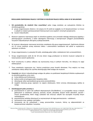 REGULAMIN ZWIEDZANIA PAŁACU I WYSTAW W MUZEUM PAŁACU KRÓLA JANA III W WILANOWIE 1. Od poniedziałku do niedzieli /bez czwartków/ pałac mogą zwiedzać, po wykupieniu biletów na określoną godzinę: a) grupy zorganizowane złożone z nie więcej niż 25 osób (ze względu na ich bezpieczeństwo i w trosce o zabytki w małych pomieszczeniach historycznych oraz wąskich i stromych przejściach); b) turyści indywidualni. 2. Muzeum zapewnia rezerwację wejść na określone godziny oraz prowadzi obsługę edukacyjną (zgodną z obowiązującym cennikiem), a także udostępnia informację o zewnętrznych usługach przewodników. Turystom indywidualnym oferujemy audioprzewodnik. 3. W muzeum obowiązuje rezerwacja terminów zwiedzania dla grup zorganizowanych. Spóźnienie dłuższe niż 15 minut skutkuje utratą ważności biletu i uniemożliwia zwiedzanie lub udział w wydarzeniu opisanym na bilecie. 4. Grupy zorganizowane, tj. powyżej 10 osób, zwiedzają pałac tylko z edukatorem lub z przewodnikiem. 5. Grupy zorganizowane osób do lat 18 oraz dzieci mogą przebywać na terenie muzeum wyłącznie w towarzystwie swoich opiekunów. 6. Ruch turystyczny w pałacu odbywa się wyznaczoną trasą w jednym kierunku, nie dotyczy to zajęć edukacyjnych. 7. Trasa zwiedzania rozpoczyna się i kończy przejściem przez bramki obrotowe. Przy wejściu na trasę zwiedzania należy zbliżyć do czytnika obowiązujący bilet wstępu do muzeum. 8. Czwartek jest dniem indywidualnego wstępu do pałacu na podstawie bezpłatnych biletów wydawanych na określoną godzinę, przy czym: a) liczba biletów jest limitowana; b) jednej osobie przysługuje jeden bezpłatny bilet; c) obowiązuje zakaz oprowadzania grup przez przewodników; d) wyjątek stanowią grupy zapisane na zajęcia edukacyjne, które wnoszą obowiązującą opłatę za wstęp. 9. Zwiedzających pałac prosimy o: a) pozostawienie w szatni lub szafkach depozytowych /31x28x40cm/, a w przypadku rzeczy o dużych gabarytach w wózkowni: płaszczy, parasoli, teczek, plecaków, dużych toreb damskich, paczek i innych przedmiotów, które mogą uszkodzić lub zniszczyć zabytki lub wyrządzić krzywdę innym zwiedzającym; b) pozostawianie wózków dziecięcych w wyznaczonym do tego pomieszczeniu – wózkowni; c) zachowanie ciszy, spokoju i porządku; d) stosowanie się do wskazówek i uwag pracowników muzeum, którzy są odpowiedzialni za bezpieczeństwo zabytków i turystów; Muzeum Pałacu Króla Jana III w Wilanowie, ul. Stanisława Kostki Potockiego 10/16, 02-958 Warszawa, tel. (+48) 22 544 27 00, faks (+48) 22 842 31 16 wpisane do prowadzonego przez Ministra Kultury i Dziedzictwa Narodowego Rejestru Instytucji Kultury pod nr 39/95 NIP 951-00-54-672, nr konta BGK: 93 1130 1017 0020 1226 4720 0001 e-mail: [email protected], www.wilanow-palac.pl e) respektowanie zakazu palenia tytoniu oraz spożywania posiłków i napojów; f) respektowanie zakazu dotykania ścian, zabytków oraz urządzeń technicznych; g) nieprowadzenie w czasie zwiedzania rozmów za pośrednictwem telefonów przenośnych oraz wyciszenie sygnałów dźwiękowych. 10. W przypadku uszkodzenia zabytku zwiedzający pokrywa koszty jego konserwacji. 11. Zwiedzający pokrywa koszt zgubionego/zniszczonego numerka z szatni w wysokości 30 zł. Opłata wnoszona jest w kasie muzeum. 12. Informujemy, że: a) fotografowanie i filmowanie we wnętrzach pałacu jest możliwe, o ile: − nie zakłóca ruchu turystycznego i nie przeszkadza innym zwiedzającym, − nie grozi uszkodzeniem zabytków i wyposażenia muzeum, − nie wyrządza szkody innym zwiedzającym (fizycznej lub związanej z ochroną ich dóbr osobistych); b) materiał zdjęciowy lub filmowy nie może być wykorzystany do celów komercyjnych bez zgody muzeum; c) zabrania się fotografowania i filmowania części systemów bezpieczeństwa w muzeum; d) ze względu na wymogi ochrony konserwatorskiej i fizycznej mienia muzeum zabronione jest stosowanie we wnętrzach pałacu lamp błyskowych, dodatkowego oświetlenia, statywów oraz innych urządzeń; e) odstępstwa od zakazów w punktach b) i d) wymagają indywidualnej zgody dyrektora muzeum; f) muzeum nie odpowiada za naruszenie przez osoby trzecie dóbr osobistych turystów lub wyrządzenie im innej szkody z powodu wykonywania zdjęć fotograficznych i filmowych; g) muzeum może zabronić fotografowania i filmowania tych zabytków, których właściciel nie wyraził na to zgody. 13. Zwracamy uwagę zwiedzającym na to, że wprowadzanie do wnętrz pałacowych innych zwierząt niż psy przewodnicy jest zabronione, co wynika z troski o bezpieczeństwo wszystkich zwiedzających i zabytków. 14. Informujemy, że osoby zakłócające spokój i porządek oraz niestosujące się do niniejszego regulaminu mogą być pozbawione prawa do zwiedzania pałacu bez zwrotu kosztów wstępu. 15. Zwracamy uwagę na to, że pomieszczenia muzealne są stale monitorowane przez personel dozoru, kamery i systemy bezpieczeństwa. 16. Prosimy o uszanowanie zasad pracy personelu dozorującego, który nie jest zobowiązany do udzielania informacji, ponieważ jego zadaniem jest przede wszystkim ochrona zabytków. Serdecznie zapraszamy do muzeum! Dyrektor Muzeum Pałacu Króla Jana III w Wilanowie Muzeum Pałacu Króla Jana III w Wilanowie, ul. Stanisława Kostki Potockiego 10/16, 02-958 Warszawa, tel. (+48) 22 544 27 00, faks (+48) 22 842 31 16 wpisane do prowadzonego przez Ministra Kultury i Dziedzictwa Narodowego Rejestru Instytucji Kultury pod nr 39/95 NIP 951-00-54-672, nr konta BGK: 93 1130 1017 0020 1226 4720 0001 e-mail: [email protected], www.wilanow-palac.pl