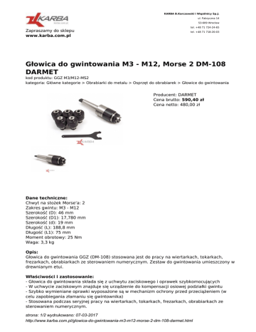KARBA B.Karczewski i Wspólnicy Sp.J. ul. Fabryczna 14 53-609 Wrocław Zapraszamy do sklepu www.karba.com.pl tel. +48 71 724-24-65 tel. +48 71 718-20-03 Głowica do gwintowania M3 - M12, Morse 2 DM-108 DARMET kod produktu: GGZ M3/M12-MS2 kategoria: Główne kategorie > Obrabiarki do metalu > Osprzęt do obrabiarek > Głowice do gwintowania Producent: DARMET Cena brutto: 590,40 zł Cena netto: 480,00 zł Dane techniczne: Chwyt na stożek Morse'a: 2 Zakres gwintu: M3 - M12 Szerokość (D): 46 mm Szerokość (D1): 17,780 mm Szerokość (d): 19 mm Długość (L): 188,8 mm Długość (L1): 75 mm Moment obrotowy: 25 Nm Waga: 3,3 kg Opis: Głowica do gwintowania GGZ (DM-108) stosowana jest do pracy na wiertarkach, tokarkach, frezarkach, obrabiarkach ze sterowaniem numerycznym. Zestaw do gwintowania umieszczony w drewnianym etui. Właściwości i zastosowanie: - Głowica do gwintowania składa się z uchwytu zaciskowego i oprawek szybkomocujących - W uchwycie zaciskowym znajduje się urządzenie do kompensacji osiowej podziałki gwintu - Szybko wymieniane oprawki wyposażone są w mechanizm ochrony przed przeciążeniem (w celu zapobiegania złamaniu się gwintownika) - Stosowana podczas seryjnej pracy na wiertarkach, tokarkach, frezarkach, obrabiarkach ze sterowaniem numerycznym. strona: 1/2 wydrukowano: 07-03-2017 http://www.karba.com.pl/glowica-do-gwintowania-m3-m12-morse-2-dm-108-darmet.html Wyposażenie: Uchwyt szybkomocujący - 1 szt. Oprawki szybkowymienne - 5 szt. Klucz - 1 szt. strona: 2/2 wydrukowano: 07-03-2017 http://www.karba.com.pl/glowica-do-gwintowania-m3-m12-morse-2-dm-108-darmet.html