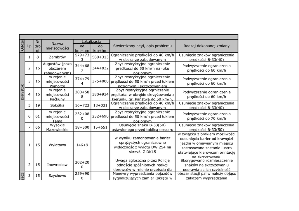 Oddzia Białystok szcz Nr Lp dro gi 1 8 2 16 3 16 4 16 5 19 6 61 7 66 Lokalizacja Stwierdzony błąd, opis problemu od do km+hm km+hm 579+73 Ograniczenie prędkości do 40 km/h Zambrów 580+313 3 w obszarze zabudowanym Augustów (poza Zbyt restrykcyjne ograniczenie 344+68 344+832 obszarem predkości do 50 km/h na łuku 7 zabudowanym) poziomym w rejonie Zbyt restrykcyjne ogrnieczenie 374+79 375+000 prędkości do 50 km/h przed łukiem miejscowości 4 poziomym i skrzyżowaniem Pomorze w rejonie Zbyt restrykcyjne ogrniczenie 380+58 380+934 prędkości w obrębie skrzyżowania z miejscowości 8 Paćkuny kierunku gr. Państwa do 50 km/h, Ograniczenie prędkości do 40 km/h Sokółka 16+723 18+031 w obszarze zabudowanym w rejonie Zbyt restrykcyjne ograniczenie 232+08 232+690 predkości do 50 km/h przed łukiem miejscowości 0 poziomym Tama Wysokie Usunięcie znaku B-33(50) 18+500 15+651 Mazowieckie ustawionego przed tablicą obszaru Nazwa miejscowości 1 15 Wylatowo 146+9 2 15 Inowrocław 202+20 0 3 15 Szychowo 259+90 0 w wyniku zamontowania barier sprężystych ograniczowno widocznośc z wylotu DW 254 na skrzyż. Z DK15 Uwaga zgłosozna przez Policję odnoście spóźnionych reakcji kierowców w rejonie przejścia dla Manewry wyprzedzania pojazdów sygnalizujących zamiar (skrętu w Rodzaj dokonanej zmiany Usunięcie znaków ograniczenia prędkości B-33(40) Podwyższenie ograniczenia prędkości do 60 km/h Podwyższenie ograniczenia prędkości do 60 km/h Podwyższenie ograniczenia prędkości do 60 km/h Usunięcie znaków ograniczenia prędkości B-33(40) Podwyższenie ograniczenia prędkości do 70 km/h Usunięcie znaków ograniczenia prędkości B-33(50) w związku z brakiem możliwości odsunięcia barier od krawędzi jezdni w omawianym miejscu zastosowane zostanie lustro ułatwiające kierowcom orintację na skrzyżowaniu Skorygowano rozmieszczenie znaków na skrzyżowaniu poprawiając ich czytelność obszar stacji paliw należy objąśc zakazem wyprzedzania Bydgos 4 5 Gdańsk 1. 15 56 6 Pulskowęsy Koronowo Lębork Wejherowo 266+20 0 zaobserwowawno przypadki wypadnięcia z łuku drogi zlokalizowanego w miejscowości. Obszar o luźnej zabudowie punkty świetlne zlokalizowane poza DK zniekształcają obraz przebiegu drogi w planie. Polecono oznakowac łuk tablicami prowadzącymi U-3a i U-3b 4+300 odcinek drogi o jezdni poszerzonej do 12m i dużych placach postojowych na obu krańcach wykorzystywany jest do zabaw i wyścigów odgrodzenie placów postojowych barierami z pozostawieniem wjazdu na DK, pozostawienei jezdni 7m + 2x0,5m i zmiana struktury pobocza przez frezowanie 6+900 obszar zabudowany na odcinku podwyższono limit prędkości z 50 międzywęzłowym gdzie brak jest do 70 km/h zjazdów i poprzecznego ruchu obszar zabudowany obowiązuje na odcinku zmodernizowanej drogi 292+45 podwyższono limit prędkości z 50 297+450 dwujezdniowej; na odcinku gdzie 0 do 70 km/h wszystkie przejścia dla pieszych są wyłącznie w miejscach sygnalizacji 258+45 297+450 0 2. 6 3. 6 4. 7 1 45 Roszków 2+950 4+860 rozległy obszar zabudowany 2 45 Bienkowice 12+710 14+430 rozległy obszar zabudowany 3 45 Tworków 10+250 11+500 rozległy obszar zabudowany 4 46 Olsztyn 5 91 Rędziny Reda Bystra 301+95 w obszarze zabudowanym widniały 303+750 0 znaki B-33 „50 km/h” ograniczenie prędkości do 70 km/h 31+430 31+750 w strefie dojazdu do miejscowości ( brak ruchu pieszego, brak zjazdów, 200+341 90+280 93+650 zbyt restrykcyjne ogranieczenie prędkości w obszarze rozległy obszar zabudowany zlikwidowano B-33 „50 km/h” w obszarze zabudowanym zlikwidowano B-33 „70 km/h” podwyższając prędkość do 90 km/h zmiana zakresu obszaru zabudowanego zmiana zakresu obszaru zabudowanego zmiana zakresu obszaru zabudowanego likwidacja B-33 (40) zmiana zakresu obszaru zabudowanego Katowice 6 91 Rudniki 88+640 89+900 7 1 Brudzowice 513+07 513+730 0 8 1 Siewierz 517+00 517+060 0 9 1 Pszczyna 581+13 587+166 4 10 52 Kozy 12+841 13+700 11 59 Żywiec 0+000 1+457 12 81 Drogomyśl 51+083 51+630 73 Celiny 35,950 38,300 42 Błaszków 230,13 231,53 42 Brzeście Bugaj 243,7 245,26 1 2 3 rozległy obszar zabudowany ograniczenie prędkości do 70 km/h na przebudowywanym łuku w obrębie "czarnego punktu" przeciążona sygnalizacja świetlna zbędne obszary zabudowane w ciągu DK1 (droga dwujezdniowa) zbyt restrykcyjne ograniczenie prędkości w obszarze zbędne ograniczenie prędkości na tymczasowym łaczniku dojazdowym do S-69 zmiana zakresu obszaru zabudowanego zmiana wartości ograniczenia prędkości na znakach B-33(90) zmiana programu sygnalizacji świetlnej i redukcja 2 przejścia dla pieszych na przekroju dwujezdniowym przestawiono znaki D-42 i D-43 na wloty boczne do DK1 likwidacja B-33 (40) projektuje się usunięcie 5 szt. Znaków B-33 (70 i 80) i przestawienie pozostałych ograniczeń blliżej przejść dla pieszych projektuje się usunięcie 2 szt. Znaków B-33(70) zbędne ograniczenie prędkości do 70 km/h na wiadukcie kolejowym Obszar zabudowany rozległy, luźna zabudowa dwustronna w większości W strefach obszaru oddalona od drogi, wprowadzone zabudowanego D-42 dwie strefy obszaru zabudowanego wprowadzono prędkość 70km/h D-42, ruch pieszych po poboczach bitumicznych szer 2m Luźna rozproszona zabudowa W strefie obszaru zabudowanego wzdłuz drogi krajowej, znikomy D-42 wprowadzono prędkość ruch pieszych,, główna zabudowa 70km/h Zwarta zabudowa lewostronna, Dla ujednolicenia oznakowania z chodnik po lewostronny za rowem sąsiednimi obszarami na krótkim odcinku drogi, trzy zabudowanymi, wprowadzone rzejścia dla pieszych, ruch pieszych ograniczenie prędkości należy wzdłuz drogi w wiekszości po zamienić na strefę obszaru poboczach gruntowych oraz w zabudowanego D-42 74 4 74 5 6 74 74 7 74 Luźna zabudowa blisko drogi powiązana z droga po lewej stronie W strefie obszaru zabudowanego D-42 wprowadzono prędkość Przyjmo 65,565 65,870 pozostała wzdłuż dróg bocznych, ruch pieszych mały wz
