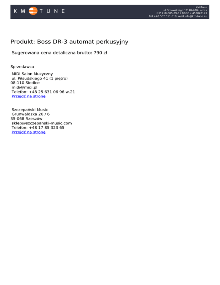 KM-Tune ul.Dmowskiego 1C 18-400 Łomża NIP 718-005-09-01 REGON 450020149 Tel +48 502 511 618, mail [email protected] Produkt: Boss DR-3 automat perkusyjny Sugerowana cena detaliczna brutto: 790 zł o Sprzedawca MIDI Salon Muzyczny ul. Piłsudskiego 41 (1 piętro) 08-110 Siedlce [email protected] Telefon: +48 25 631 06 96 w.21 Przejdź na stronę Szczepański Music Grunwaldzka 26 / 6 35-068 Rzeszów [email protected] Telefon: +48 17 85 323 65 Przejdź na stronę Powered by TCPDF (www.tcpdf.org)
