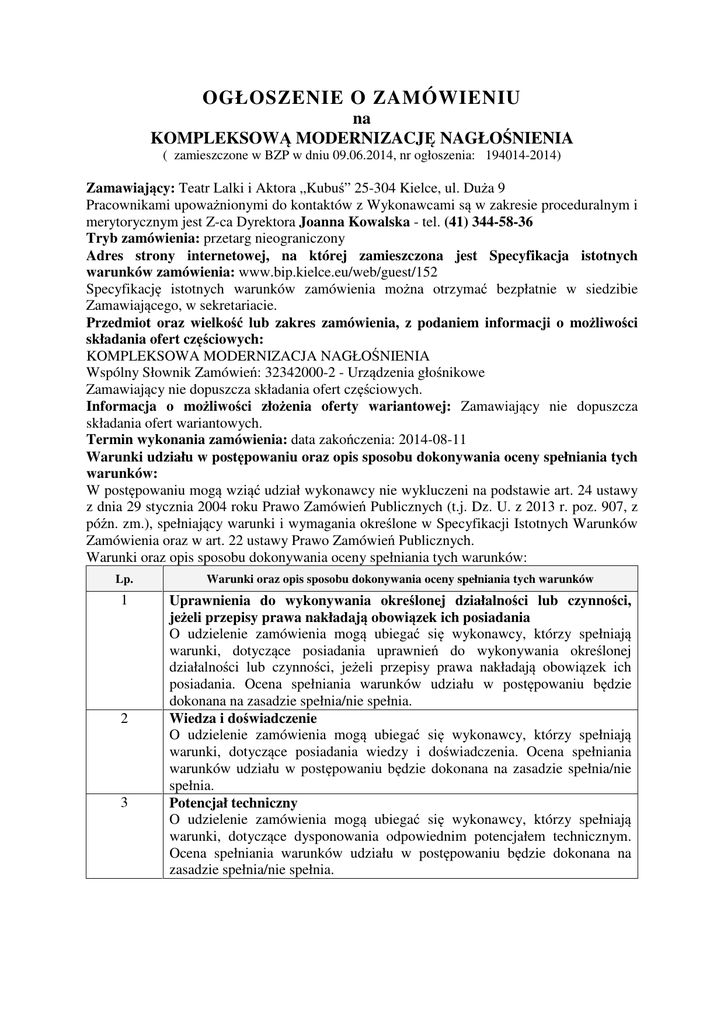 OGŁOSZENIE O ZAMÓWIENIU na KOMPLEKSOWĄ MODERNIZACJĘ NAGŁOŚNIENIA ( zamieszczone w BZP w dniu 09.06.2014, nr ogłoszenia: 194014-2014) Zamawiający: Teatr Lalki i Aktora „Kubuś” 25-304 Kielce, ul. Duża 9 Pracownikami upoważnionymi do kontaktów z Wykonawcami są w zakresie proceduralnym i merytorycznym jest Z-ca Dyrektora Joanna Kowalska - tel. (41) 344-58-36 Tryb zamówienia: przetarg nieograniczony Adres strony internetowej, na której zamieszczona jest Specyfikacja istotnych warunków zamówienia: www.bip.kielce.eu/web/guest/152 Specyfikację istotnych warunków zamówienia można otrzymać bezpłatnie w siedzibie Zamawiającego, w sekretariacie. Przedmiot oraz wielkość lub zakres zamówienia, z podaniem informacji o możliwości składania ofert częściowych: KOMPLEKSOWA MODERNIZACJA NAGŁOŚNIENIA Wspólny Słownik Zamówień: 32342000-2 - Urządzenia głośnikowe Zamawiający nie dopuszcza składania ofert częściowych. Informacja o możliwości złożenia oferty wariantowej: Zamawiający nie dopuszcza składania ofert wariantowych. Termin wykonania zamówienia: data zakończenia: 2014-08-11 Warunki udziału w postępowaniu oraz opis sposobu dokonywania oceny spełniania tych warunków: W postępowaniu mogą wziąć udział wykonawcy nie wykluczeni na podstawie art. 24 ustawy z dnia 29 stycznia 2004 roku Prawo Zamówień Publicznych (t.j. Dz. U. z 2013 r. poz. 907, z późn. zm.), spełniający warunki i wymagania określone w Specyfikacji Istotnych Warunków Zamówienia oraz w art. 22 ustawy Prawo Zamówień Publicznych. Warunki oraz opis sposobu dokonywania oceny spełniania tych warunków: Lp. Warunki oraz opis sposobu dokonywania oceny spełniania tych warunków 1 Uprawnienia do wykonywania określonej działalności lub czynności, jeżeli przepisy prawa nakładają obowiązek ich posiadania O udzielenie zamówienia mogą ubiegać się wykonawcy, którzy spełniają warunki, dotyczące posiadania uprawnień do wykonywania określonej działalności lub czynności, jeżeli przepisy prawa nakładają obowiązek ich posiadania. Ocena spełniania warunków udziału w postępowaniu będzie dokonana na zasadzie spełnia/nie spełnia. Wiedza i doświadczenie O udzielenie zamówienia mogą ubiegać się wykonawcy, którzy spełniają warunki, dotyczące posiadania wiedzy i doświadczenia. Ocena spełniania warunków udziału w postępowaniu będzie dokonana na zasadzie spełnia/nie spełnia. Potencjał techniczny O udzielenie zamówienia mogą ubiegać się wykonawcy, którzy spełniają warunki, dotyczące dysponowania odpowiednim potencjałem technicznym. Ocena spełniania warunków udziału w postępowaniu będzie dokonana na zasadzie spełnia/nie spełnia. 2 3 Osoby zdolne do wykonania zamówienia O udzielenie zamówienia mogą ubiegać się wykonawcy, którzy spełniają warunki, dotyczące dysponowania osobami zdolnymi do wykonania zamówienia. Ocena spełniania warunków udziału w postępowaniu będzie dokonana na zasadzie spełnia/nie spełnia. 5 Sytuacja ekonomiczna i finansowa O udzielenie zamówienia mogą ubiegać się wykonawcy, którzy spełniają warunki, dotyczące sytuacji ekonomicznej i finansowej. Ocena spełniania warunków udziału w postępowaniu będzie dokonana na zasadzie spełnia/nie spełnia. Wadium: oferta musi być zabezpieczona wadium w wysokości: 6 510.00 zł (słownie: sześć tysięcy pięćset dziesięć 00/100 zł) Kryteria oceny ofert i ich znaczenie: 4 Nr Kryterium Waga 90% 1 Cena (koszt) 10% 2 Okres gwarancji Miejsce i termin składania ofert: oferty należy składać siedzibie Zamawiającego, pokój nr sekretariat Zamawiającego do dnia 2014-06-17 do godz. 09:00. Termin związania ofertą: 30 dni Przed wszczęciem postępowania zastosowano dialog techniczny: nie Informacja o zamiarze ustanowienia dynamicznego systemu zakupów wraz z adresem strony internetowej, na której będą zamieszczone dodatkowe informacje dotyczące dynamicznego systemu zakupów: nie dotyczy Informacja o przewidywanym wyborze najkorzystniejszej oferty z zastosowaniem aukcji elektronicznej wraz z adresem strony internetowej, na której będzie prowadzona aukcja elektroniczna: w postępowaniu nie jest przewidziany wybór najkorzystniejszej oferty z zastosowaniem aukcji elektronicznej Informacja o przewidywanych zamówieniach uzupełniających, o których mowa w art. 67 ust. 1 pkt 6 i 7 lub art. 134 ust. 6 pkt 3 i 4 ustawy z dnia 29 stycznia 2004 roku Prawo zamówień publicznych (t.j. Dz. U. z 2013 r. poz. 907, z późn. zm.), jeżeli zamawiający przewiduje udzielenie takich zamówień: Zamawiający nie przewiduje udzielenia zamówień uzupełniających. Kielce dnia: 2014-06-09