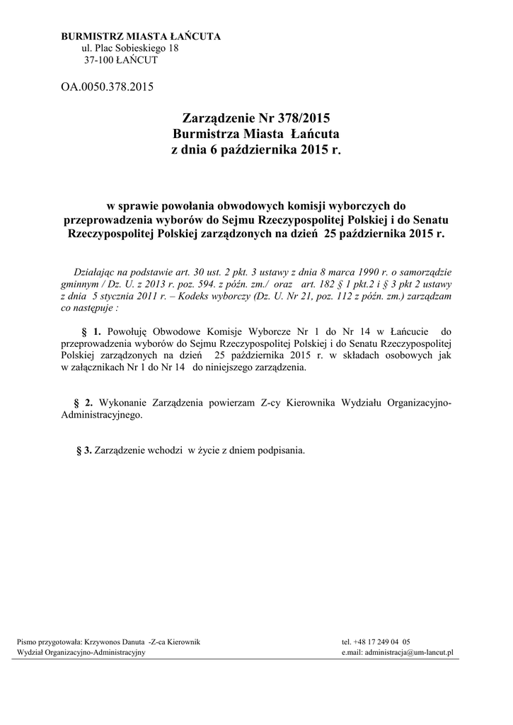 Zarządzenie Nr 378/2015 Burmistrza Miasta Łańcuta z dnia 6