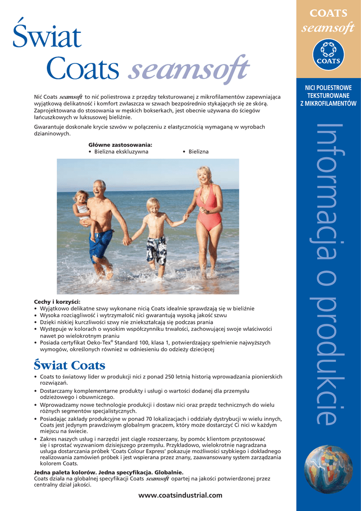 seamsoft seamsoft Nić Coats seamsoft to nić poliestrowa z przędzy teksturowanej z mikrofilamentów zapewniająca wyjątkową delikatność i komfort zwłaszcza w szwach bezpośrednio stykających się ze skórą. Zaprojektowana do stosowania w męskich bokserkach, jest obecnie używana do ściegów łańcuszkowych w luksusowej bieliźnie. Główne zastosowania: • Bielizna ekskluzywna • Bielizna Cechy i korzyści: • Wyjątkowo delikatne szwy wykonane nicią Coats idealnie sprawdzają się w bieliźnie • Wysoka rozciągliwość i wytrzymałość nici gwarantują wysoką jakość szwu • Dzięki niskiej kurczliwości szwy nie zniekształcają się podczas prania • Występuje w kolorach o wysokim współczynniku trwałości, zachowującej swoje właściwości nawet po wielokrotnym praniu • Posiada certyfikat Oeko-Tex® Standard 100, klasa 1, potwierdzający spełnienie najwyższych wymogów, określonych również w odniesieniu do odzieży dziecięcej • Coats to światowy lider w produkcji nici z ponad 250 letnią historią wprowadzania pionierskich rozwiązań. • Dostarczamy komplementarne produkty i usługi o wartości dodanej dla przemysłu odzieżowego i obuwniczego. • Wprowadzamy nowe technologie produkcji i dostaw nici oraz przędz technicznych do wielu różnych segmentów specjalistycznych. • Posiadając zakłady produkcyjne w ponad 70 lokalizacjach i oddziały dystrybucji w wielu innych, Coats jest jedynym prawdziwym globalnym graczem, który może dostarczyć Ci nici w każdym miejscu na świecie. • Zakres naszych usług i narzędzi jest ciągle rozszerzany, by pomóc klientom przystosować się i sprostać wyzwaniom dzisiejszego przemysłu. Przykładowo, wielokrotnie nagradzana usługa dostarczania próbek ‘Coats Colour Express’ pokazuje możliwości szybkiego i dokładnego realizowania zamówień próbek i jest wspierana przez znany, zaawansowany system zarządzania kolorem Coats. Jedna paleta kolorów. Jedna specyfikacja. Globalnie. Coats działa na globalnej specyfikacji Coats seamsoft opartej na jakości potwierdzonej przez centralny dział jakości. www.coatsindustrial.com Informacja o produkcie Gwarantuje doskonałe krycie szwów w połączeniu z elastycznością wymaganą w wyrobach dzianinowych. NICI POLIESTROWE TEKSTUROWANE Z MIKROFILAMENTÓW seamsoft Dane techniczne: Nr Tex z Oferty Numer Składowe Globalnej Metryczny 18 24 35 160 140 80 2 3 4 Przeciętna Wydłużenie % Zalecany Rozmiar Igły* Wytrzymałość Min. - Maks. cN Gramów Singer Metryczny 630 1,000 1,350 642 1,020 1,377 23 - 33 28 - 38 23 - 33 10 - 14 11 - 14 14 - 18 70 - 90 75 - 90 90 - 110 * Podane rekomendacje igieł należy traktować wyłącznie jako wskazówkę. Ich ostateczny wybór zależy od rodzaju zastosowania. Biorąc pod uwagę, że warunki i zastosowanie nici mogą być bardzo zróżnicowane, użytkownik nici powinien wcześniejszymi pozytywnymi testami próbnymi potwierdzić użycie danej nici do konkretnego przeznaczenia. Poniższe dane techniczne oparte są na pomiarach uśrednionych i powinny być traktowane jako orientacyjne. Właściwości chemiczne: • Kwasy: • Alkalia: • Rozpuszczalniki organiczne: • Wybielanie: • Pranie: • Wykończenie: Odporna na większość kwasów mineralnych i organicznych Odporna na słabe alkalia Generalnie odporna, jednak rozpuszcza się w związkach fenolowych Nie zmienia właściwości Znakomita trwałość Lubrykanty pokrywające nić pozwalają zachować stałą jakość przy dużej prędkości szycia i zapewniają jedynie niewielkie różnice odcieni. Właściwości chemiczne lubrykantów nie zmieniają się podczas przechowywania w różnych warunkach i nie są one szkodliwe dla zdrowia w normalnym użytkowaniu. Nici nie należy przechowywać w skrajnie nieodpowiednich warunkach lub w miejscu o wysokiej wilgotności Coats seamsoft - odporności: • Odporność na pranie w 60ºC (ISO 105 C10:2006 C(3)) (ISO 105 E01:2010) • Odporność na wodę (ISO 105 X12:2001) • Odporność na tarcie • Odporność na podchloryny (ISO 105 N01:1993) (ISO 105 D01:2010) • Odporność na pranie chemiczne (ISO 105 E04:2009) • Odporność na pot (ISO 105 B02:1994) • Odporność na światło sztuczne Poziom 4 Poziom 4 Poziom 4 Poziom 4 Poziom 4 Poziom 4 Poziom 4 Przedstawione poziomy odporności to wyniki minimalne; w praktyce w przypadku większości kolorów osiągane poziomy odporności są wyższe. © Prawa autorskie zastrzeżone 2013 www.coatsindustrial.com Informacja o produkcie Fizyczne i chemiczne właściwości nici teksturowanych z poliestrowych mikrofilamentów: NICI POLIESTROWE TEKSTUROWANE Z MIKROFILAMENTÓW
