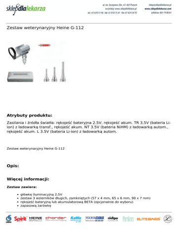 Zestaw weterynaryjny Heine G-112 Atrybuty produktu: Zasilania i źródła światła: rękojeść bateryjna 2.5V, rękojeść akum. TR 3.5V (bateria Liion) z ładowarką transf., rękojeść akum. NT 3.5V (bateria NiHM) z ładowarką autom., rękojeść akum. L 3.5V (bateria Li-ion) z ładowarką autom. Zestaw weterynaryjny Heine G-112 Opis: Więcej informacji: Zestaw zawiera: główkę iluminacyjną 2,5V zestaw 3 wzierników długich, zamkniętych (57 x 4 mm, 65 x 6 mm, 90 x 7 mm) rękojeść bateryjną lub akumulatorową BETA (opcjonalnie do wyboru) zapasową żarówkę twarde etui Powered by TCPDF (www.tcpdf.org)