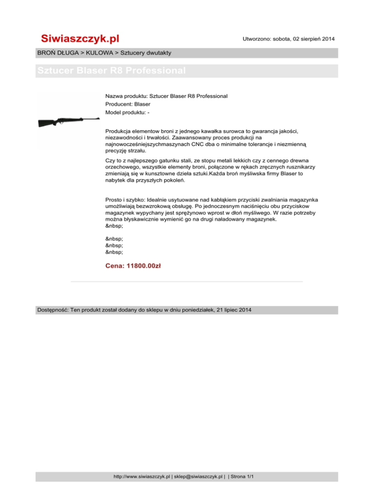 Siwiaszczyk.pl Utworzono: sobota, 02 sierpień 2014 BROŃ DŁUGA > KULOWA > Sztucery dwutakty Sztucer Blaser R8 Professional Nazwa produktu: Sztucer Blaser R8 Professional Producent: Blaser Model produktu: - Produkcja elementow broni z jednego kawałka surowca to gwarancja jakości, niezawodności i trwałości. Zaawansowany proces produkcji na najnowocześniejszychmaszynach CNC dba o minimalne tolerancje i niezmienną precyzję strzału. Czy to z najlepszego gatunku stali, ze stopu metali lekkich czy z cennego drewna orzechowego, wszystkie elementy broni, połączone w rękach zręcznych rusznikarzy zmieniają się w kunsztowne dzieła sztuki.Każda broń myśliwska firmy Blaser to nabytek dla przyszłych pokoleń. Prosto i szybko: Idealnie usytuowane nad kabłąkiem przyciski zwalniania magazynka umożliwiają bezwzrokową obsługę. Po jednoczesnym naciśnięciu obu przyciskow magazynek wypychany jest sprężynowo wprost w dłoń myśliwego. W razie potrzeby można błyskawicznie wymienić go na drugi naładowany magazynek. Cena: 11800.00zł Dostępność: Ten produkt został dodany do sklepu w dniu poniedziałek, 21 lipiec 2014 http://www.siwiaszczyk.pl | [email protected] | | Strona 1/1
