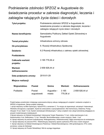 Podniesienie zdolności SPZOZ w Augustowie do świadczenia procedur w zakresie diagnostyki, leczenia i zabiegów ratujących życie dzieci i dorosłych Tytuł projektu: Podniesienie zdolności SPZOZ w Augustowie do świadczenia procedur w zakresie diagnostyki, leczenia i zabiegów ratujących życie dzieci i dorosłych Nazwa beneficjenta: Samodzielny Publiczny Zakład Opieki Zdrowotnej w Augustowie Temat priorytetu: Infrastruktura ochrony zdrowia Oś priorytetowa: 6. Rozwój Infrastruktury Społecznej Działanie: 6.2 Rozwój infrastruktury z zakresu opieki zdrowotnej Poddziałanie: Całkowita wartość projektu: 3 165 779,36 zł Wartość dofinansowania: 2 658 926,44 zł Data podpisania umowy: 2010-01-29 Miejsce realizacji: Województwo Powiat Gmina Wartość Dofinansowanie Podlaskie Powiat augustowski Augustów miasto 3 165 779,36 zł 2 658 926,44 zł Projekt będący przedmiotem niniejszego opracowania dotyczy zakupu następujących urządzeń i zestawów urządzeń w SPZOZ w Augustowie. Zakres projektu obejmuje : I. sprzęt nabywany na Blok Operacyjny: Aparat RTG z ramieniem C, Tor wizyjny do laparoskopii, artroskopii i histeroskopii, Wiertarka chirurgiczna z osprzętem, Aparat do znieczulania z oprzyrządowaniem, Nóż harmoniczny, Diatermia, Pompy infuzyjne 15 szt, Ssaki ? 2 szt, System wentylacyjno-klimatyzacyjny ? zakup urządzeń oraz usługi budowlanej polegającej na pracach modernizacyjno-instalacyjnych. II.Sprzęt nabywany na Oddział Anestezjologii i Intensywnej Terapii: Respiratory ? 2 szt., Łóżka reanimacyjne 4 szt., Kardiomonitory 5 szt, Defibrylatory ? 2 szt.; Hemofiltr, Bronchofiberoskop z torem wizyjnym, Ssaki - 3 szt III. Sprzęt nabywany do pracowni endoskopowej: Wideogastroskop, Wideokolonoskop, Myjka automatyczna do endoskopów IV. Sprzęt nabywany do pracowni RTG : Wielofunkcyjny stacjonarny aparat ucyfrowiony RTG wraz z torem wizyjnym V. Sprzęt nabywany na Oddział Ginekologiczno-Położniczy i Oddział Neonatologiczny: USG ginekologiczne, KTG, Łóżko porodowe, Lampa do fototerapii VI. Sprzęt nabywany do Poradni Rehabilitacji: Stół do wyciągu kręgosłupa Projekt realizowany będzie od VII 2009 do XII 2010 r. Cele ogólne projektu będą realizowane poprzez cele bezpośrednie projektu: 1. poprawa dostępności do specjalistycznych świadczeń zdrowotnych poprzez zwiększenie liczby świadczeń w SPZOZ w Augustowie 2. uruchomienie nowych specjalistycznych procedur medycznych 3. podniesienie jakości świadczonych usług medycznych 4. poprawa infrastruktury medycznej poprzez nabycie innowacyjnej aparatury medycznej 5. dostosowanie jednostki do dyrektyw unijnych i prawodawstwa krajowego Cele bezpośrednie przedmiotowego projektu wpisują się w realizację celu działania 6.2 Rozwój infrastruktury z zakresu opieki zdrowotnej RPO WP poprzez podniesienie standardu świadczonych usług medycznych i dostępności mieszkańców regionu do wysokiej jakości usług zdrowotnych. Niniejszy projekt ma na celu poprawę jakości lecznictwa specjalistycznego przyczyniającego się do kompleksowego diagnozowania i leczenia pacjentów poprzez rozszerzenie możliwości diagnostycznych SPZOZ w Augustowie. Projekt realizowany w SPZOZ w Augustowie umożliwi realizację celów strategicznych poprzez; ? Zwiększenie dostępu do specjalistycznych świadczeń zdrowotnych ? wzrost o 12 % ilości badań specjalistycznych ? Poprawa jakości świadczeń zdrowotnych ? zakup aparatury o funkcjonalności i jakości wyższej niż dotychczas stosowana w Szpitalu, oraz redukcja czasu oczekiwania na procedury medyczne do 0 ? Uzupełnienie usług ? projekt pozwala na uzupełnienie braków w możliwości świadczenia usług w zakresie zabiegów laparoskopowych chirurgicznych i ginekologicznych, ortopedycznych (zespolenia śródszpikowe) oraz znacznie rozszerzy możliwości diagnostyczne jednostki w zakresie bronchofiberoskopii i gastroskopii. ? Wpływa na poprawę funkcjonowania Szpitala poprzez kompleksowość projektu zakładającego zarówno zakup sprzętu jak również działania instalacyjno-modernizacyjne w zakresie dostosowania pomieszczeń Bloku Operacyjnego do wymogów poprzez instalację systemy wentylacyjno-operacyjnego. ? Wpływa na poprawę sytuacji finansowej Szpitala . Pozwoli zwiększenie przepustowości Bloku Operacyjnego, co wpłynie na likwidacje kolejek oczekujących na procedury ortopedyczne, da możliwość uruchomienia nowych procedur wpływając bezpośrednio na możliwości podwyższenia kontraktu i zwiększenia przychodów jednostki. Projekt będzie realizowany od 07.2009 do 12.2010