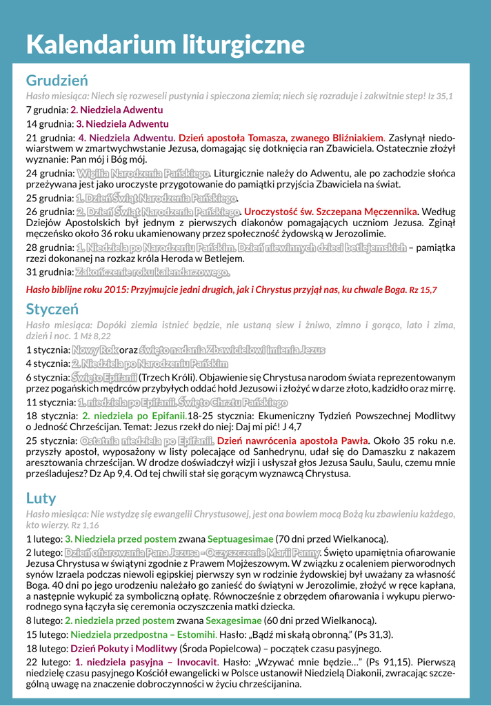Kalendarium liturgiczne Grudzień Hasło miesiąca: Niech się rozweseli pustynia i spieczona ziemia; niech się rozraduje i zakwitnie step! Iz 35,1 7 grudnia: 2. Niedziela Adwentu 14 grudnia: 3. Niedziela Adwentu 21 grudnia: 4. Niedziela Adwentu. Dzień apostoła Tomasza, zwanego Bliźniakiem. Zasłynął niedowiarstwem w zmartwychwstanie Jezusa, domagając się dotknięcia ran Zbawiciela. Ostatecznie złożył wyznanie: Pan mój i Bóg mój. 24 grudnia: Wigilia Narodzenia Pańskiego. Liturgicznie należy do Adwentu, ale po zachodzie słońca przeżywana jest jako uroczyste przygotowanie do pamiątki przyjścia Zbawiciela na świat. 25 grudnia: 1. Dzień Świąt Narodzenia Pańskiego. 26 grudnia: 2. Dzień Świąt Narodzenia Pańskiego. Uroczystość św. Szczepana Męczennika. Według Dziejów Apostolskich był jednym z pierwszych diakonów pomagających uczniom Jezusa. Zginął męczeńsko około 36 roku ukamienowany przez społeczność żydowską w Jerozolimie. 28 grudnia: 1. Niedziela po Narodzeniu Pańskim. Dzień niewinnych dzieci betlejemskich – pamiątka rzezi dokonanej na rozkaz króla Heroda w Betlejem. 31 grudnia: Zakończenie roku kalendarzowego. Hasło biblijne roku 2015: Przyjmujcie jedni drugich, jak i Chrystus przyjął nas, ku chwale Boga. Rz 15,7 Styczeń Hasło miesiąca: Dopóki ziemia istnieć będzie, nie ustaną siew i żniwo, zimno i gorąco, lato i zima, dzień i noc. 1 Mż 8,22 1 stycznia: Nowy Rok oraz święto nadania Zbawicielowi imienia Jezus 4 stycznia: 2. Niedziela po Narodzeniu Pańskim 6 stycznia: Święto Epifanii (Trzech Króli). Objawienie się Chrystusa narodom świata reprezentowanym przez pogańskich mędrców przybyłych oddać hołd Jezusowi i złożyć w darze złoto, kadzidło oraz mirrę. 11 stycznia: 1. niedziela po Epifanii. Święto Chrztu Pańskiego 18 stycznia: 2. niedziela po Epifanii.18-25 stycznia: Ekumeniczny Tydzień Powszechnej Modlitwy o Jedność Chrześcijan. Temat: Jezus rzekł do niej: Daj mi pić! J 4,7 25 stycznia: Ostatnia niedziela po Epifanii. Dzień nawrócenia apostoła Pawła. Około 35 roku n.e. przyszły apostoł, wyposażony w listy polecające od Sanhedrynu, udał się do Damaszku z nakazem aresztowania chrześcijan. W drodze doświadczył wizji i usłyszał głos Jezusa Saulu, Saulu, czemu mnie prześladujesz? Dz Ap 9,4. Od tej chwili stał się gorącym wyznawcą Chrystusa. Luty Hasło miesiąca: Nie wstydzę się ewangelii Chrystusowej, jest ona bowiem mocą Bożą ku zbawieniu każdego, kto wierzy. Rz 1,16 1 lutego: 3. Niedziela przed postem zwana Septuagesimae (70 dni przed Wielkanocą). 2 lutego: Dzień ofiarowania Pana Jezusa - Oczyszczenie Marii Panny. Święto upamiętnia ofiarowanie Jezusa Chrystusa w świątyni zgodnie z Prawem Mojżeszowym. W związku z ocaleniem pierworodnych synów Izraela podczas niewoli egipskiej pierwszy syn w rodzinie żydowskiej był uważany za własność Boga. 40 dni po jego urodzeniu należało go zanieść do świątyni w Jerozolimie, złożyć w ręce kapłana, a następnie wykupić za symboliczną opłatę. Równocześnie z obrzędem ofiarowania i wykupu pierworodnego syna łączyła się ceremonia oczyszczenia matki dziecka. 8 lutego: 2. niedziela przed postem zwana Sexagesimae (60 dni przed Wielkanocą). 15 lutego: Niedziela przedpostna – Estomihi. Hasło: „Bądź mi skałą obronną.” (Ps 31,3). 18 lutego: Dzień Pokuty i Modlitwy (Środa Popielcowa) – początek czasu pasyjnego. 22 lutego: 1. niedziela pasyjna – Invocavit. Hasło: „Wzywać mnie będzie…” (Ps 91,15). Pierwszą niedzielę czasu pasyjnego Kościół ewangelicki w Polsce ustanowił Niedzielą Diakonii, zwracając szczególną uwagę na znaczenie dobroczynności w życiu chrześcijanina.