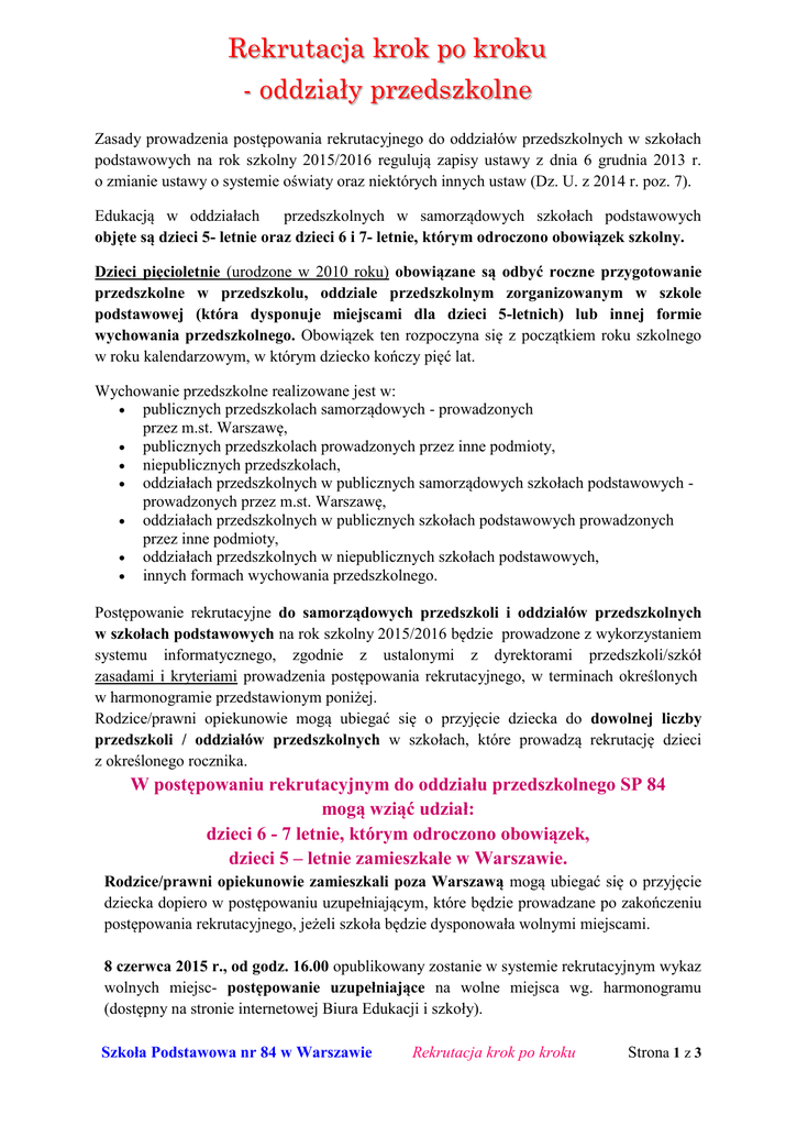 Rekrutacja krok po kroku - oddziały przedszkolne Zasady prowadzenia postępowania rekrutacyjnego do oddziałów przedszkolnych w szkołach podstawowych na rok szkolny 2015/2016 regulują zapisy ustawy z dnia 6 grudnia 2013 r. o zmianie ustawy o systemie oświaty oraz niektórych innych ustaw (Dz. U. z 2014 r. poz. 7). Edukacją w oddziałach przedszkolnych w samorządowych szkołach podstawowych objęte są dzieci 5- letnie oraz dzieci 6 i 7- letnie, którym odroczono obowiązek szkolny. Dzieci pięcioletnie (urodzone w 2010 roku) obowiązane są odbyć roczne przygotowanie przedszkolne w przedszkolu, oddziale przedszkolnym zorganizowanym w szkole podstawowej (która dysponuje miejscami dla dzieci 5-letnich) lub innej formie wychowania przedszkolnego. Obowiązek ten rozpoczyna się z początkiem roku szkolnego w roku kalendarzowym, w którym dziecko kończy pięć lat. Wychowanie przedszkolne realizowane jest w: publicznych przedszkolach samorządowych - prowadzonych przez m.st. Warszawę, publicznych przedszkolach prowadzonych przez inne podmioty, niepublicznych przedszkolach, oddziałach przedszkolnych w publicznych samorządowych szkołach podstawowych prowadzonych przez m.st. Warszawę, oddziałach przedszkolnych w publicznych szkołach podstawowych prowadzonych przez inne podmioty, oddziałach przedszkolnych w niepublicznych szkołach podstawowych, innych formach wychowania przedszkolnego. Postępowanie rekrutacyjne do samorządowych przedszkoli i oddziałów przedszkolnych w szkołach podstawowych na rok szkolny 2015/2016 będzie prowadzone z wykorzystaniem systemu informatycznego, zgodnie z ustalonymi z dyrektorami przedszkoli/szkół zasadami i kryteriami prowadzenia postępowania rekrutacyjnego, w terminach określonych w harmonogramie przedstawionym poniżej. Rodzice/prawni opiekunowie mogą ubiegać się o przyjęcie dziecka do dowolnej liczby przedszkoli / oddziałów przedszkolnych w szkołach, które prowadzą rekrutację dzieci z określonego rocznika. W postępowaniu rekrutacyjnym do oddziału przedszkolnego SP 84 mogą wziąć udział: dzieci 6 - 7 letnie, którym odroczono obowiązek, dzieci 5 – letnie zamieszkałe w Warszawie. Rodzice/prawni opiekunowie zamieszkali poza Warszawą mogą ubiegać się o przyjęcie dziecka dopiero w postępowaniu uzupełniającym, które będzie prowadzane po zakończeniu postępowania rekrutacyjnego, jeżeli szkoła będzie dysponowała wolnymi miejscami. 8 czerwca 2015 r., od godz. 16.00 opublikowany zostanie w systemie rekrutacyjnym wykaz wolnych miejsc- postępowanie uzupełniające na wolne miejsca wg. harmonogramu (dostępny na stronie internetowej Biura Edukacji i szkoły). Szkoła Podstawowa nr 84 w Warszawie Rekrutacja krok po kroku Strona 1 z 3 Rodzice/prawni opiekunowie, którzy korzystają z komputera i Internetu: o wypełnią w systemie informatycznym wniosek o przyjęcie dziecka, o drukują wypełniony wniosek i po podpisaniu przez obydwoje rodziców, składają go w przedszkolu/szkole pierwszego wyboru. Rodzice/prawni opiekunowie, którzy nie korzystają z komputera i Internetu: o pobierają wniosek w dowolnej szkole, o wypełniają go odręcznie i po podpisaniu przez obydwoje rodziców składają w szkole pierwszego wyboru, o informacje zawarte we wniosku wprowadza do systemu informatycznego dyrektor szkoły. Do wniosku rodzice / prawni opiekunowie dołączają dokumenty / oświadczenia potwierdzające spełnianie kryteriów. Przewodniczący komisji rekrutacyjnej może zażądać od rodziców / prawnych opiekunów przedstawienia dokumentów potwierdzających okoliczności zawarte w oświadczeniach (przewodniczący wyznacza termin przedstawienia dokumentów), Prosimy o zapoznanie się z wykazem dokumentów jakie należy dołączyć do wniosku / w zależności od spełnianych kryteriów / - wykaz dokumentów dostępny jest na tablicy ogłoszeń i na stronie internetowej szkoły. Oświadczenia składa się pod rygorem odpowiedzialności karnej za składanie fałszywych zeznań. Składający oświadczenie jest obowiązany do zawarcia w nim klauzuli następującej treści: „Jestem świadomy odpowiedzialności karnej za złożenie fałszywego oświadczenia” (art. 20t ust 6 ustawy o systemie oświaty) . Rodzic chcąc zapisać dziecko do oddziału przedszkolnego powinien: W dniach 9 marca - 22 marca zalogować się na stronie: http://przedszkola.edukacja-warszawa.pl 2. wypełnić odpowiednie pola w formularzu, 3. wydrukować formularz, który wygenerowany zostanie po wpisaniu wszystkich danych (formularz podpisują oboje rodzice; potwierdzając zgodność informacji zawartych w formularzu), 4. wydrukowany formularz dostarczyć do placówki pierwszego wyboru do 23 marca w godzinach pracy sekretariatu (Rodzice mogą ubiegać się o przyjęcie dziecka do dowolnej liczby szkół, placówką pierwszego wyboru jest szkoła, która znajduje się na pierwszym miejscu spośród wybranych przez rodzica placówek), 5. sprawdzić 27 kwietnia od godz. 13.00 w systemie lub w placówce pierwszego wyboru (tablica ogłoszeń wewnątrz budynku przy wejściu do placówki), gdzie dziecko zostało zakwalifikowane, 6. od 27 kwietnia od godz. 13.00 do 5 maja do godz. 16.00 dostarczyć pisemne potwierdzenie woli do szkoły, do której dziecko zostało zakwalifikowane, (potwierdzenie można pobrać w placówce lub wydrukować z systemu ). 7. sprawdzić 7 maja od godz. 13.00 (w systemie lub na tablicy ogłoszeń szkoły) czy dziecko zostało przyjęte do placówki, w której rodzic składał potwierdzenie woli. Szkoła Podstawowa nr 84 w Warszawie Rekrutacja krok po kroku Strona 2 z 3 PROCEDURA ODWOŁAWCZA Rodzice / prawni opiekunowie dzieci, które nie zostały przyjęte mogą: 1) wnioskować do komisji rekrutacyjnej o sporządzenie uzasadnienia odmowy przyjęcia dziecka do danego oddziału przedszkolnego w terminie 7 dni od dnia podania do publicznej wiadomości listy dzieci przyjętych i nieprzyjętych, (komisja w terminie 5 dni sporządza uzasad