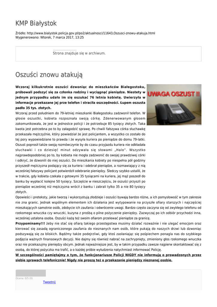KMP Białystok Źródło: http://www.bialystok.policja.gov.pl/po2/aktualnosci/11643,Oszusci-znowu-atakuja.html Wygenerowano: Wtorek, 7 marca 2017, 13:25 Strona znajduje się w archiwum. Oszuści znowu atakują Wczoraj kilkukrotnie oszuści dzwoniąc do mieszkańców Białegostoku, próbowali podszyć się za członka rodziny i wyciągnąć pieniądze. Niestety w jednym przypadku udało im się oszukać 76 letnia kobietę. Uwierzyła w informacje przekazane jej prze telefon i straciła oszczędności. Łupem oszusta padło 35 tys. złotych. Wczoraj przed południem do 79-letniej mieszkanki Białegostoku zadzwonił telefon. W głosie oszustki, kobieta rozpoznała swoją córkę. Zdenerwowanym głosem zakomunikowała, że jest w jednostce policji i że potrzebuje 85 tysięcy złotych. Taka kwota jest potrzebna po to by załagodzić sprawę. Po chwili fałszywa córka słuchawkę przekazała mężczyźnie, który powiedział że jest policjantem, a wszystko co zostało do tej pory wypowiedziane to prawda i że wysyła kuriera po pieniądze do domu 79-latki. Oszust poprosił także swoją rozmówczynie by do czasu przyjazdu kuriera nie odkładała słuchawki i co dziesięć minut odzywała się słowami „Halo”. Wszystko najprawdopodobniej po to, by kobieta nie mogła zadzwonić do swojej prawdziwej córki i odkryć, że dzwonili do niej oszuści. Do mieszkania kobiety po niespełna pół godziny przyszedł mężczyzna podający się za kuriera i odebrał pieniądze, a rozmawiający z nią wcześniej fałszywy policjant potwierdził odebranie pieniędzy. Śledczy szybko ustalili, że w trakcie, gdy kobieta czekała z gotowymi 35 tysiącami na kuriera, jej mąż poszedł do banku by wypłacić kolejne 50 tysięcy. Szczęście w nieszczęściu, że oszuści przyszli po pieniądze wcześniej niż mężczyzna wrócił z banku i zabrali tylko 35 a nie 80 tysięcy złotych. Opowieści i preteksty, jakie tworzą i wykorzystują złodzieje i oszuści bywają bardzo różne, a ich pomysłowość w tym zakresie nie zna granic. Jednak wspólnym elementem ich działania jest wytypowanie na przyszłe ofiary starszych i najczęściej mieszkających samotnie osób, zdobycie ich zaufania i odwrócenie uwagi. Bardzo często zaczyna się od zwykłego telefonu od rzekomego wnuczka czy wnuczki, kuzyna z prośbą o pilne pożyczenie pieniędzy. Zazwyczaj po ich odbiór przychodzi inna, wcześniej ustalona osoba. Oszuści każą też swoim ofiarom przelewać pieniądze za granicę. Przypominamy!!! żeby nie stać się ofiarą takiego przestępstwa musimy działać rozważnie i nie ulegać emocjom oraz kierować się zasadą ograniczonego zaufania do nieznanych nam osób, które pukają do naszych drzwi lub dzwoniąc podszywają się za bliskich. Bądźmy także podejrzliwi, gdy ktoś zasłaniając się pośpiechem ponagla nas do szybkiego podjęcia ważnych finansowych decyzji. Nie dajmy się również nabrać na zachrypnięty, zmieniony głos rzekomego wnuczka oraz nie przekazujmy pieniędzy obcym. Jednak najważniejsze jest, by w takim przypadku zawsze najpierw skontaktować się z osobą, do której pożyczka ma trafić, a o każdej próbie wyłudzenia natychmiast informować Policję. W szczególności pamiętajmy o tym, że funkcjonariusze Policji NIGDY nie informują o prowadzonych przez siebie sprawach telefonicznie! Nigdy nie proszą też o przekazanie pieniędzy nieznanej osobie. Ocena: 0/5 (0) Tweetnij