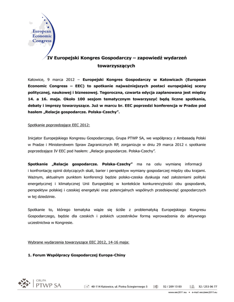 IV Europejski Kongres Gospodarczy – zapowiedź wydarzeń towarzyszących Katowice, 9 marca 2012 – Europejski Kongres Gospodarczy w Katowicach (European Economic Congress – EEC) to spotkanie najważniejszych postaci europejskiej sceny politycznej, naukowej i biznesowej. Tegoroczna, czwarta edycja zaplanowana jest między 14. a 16. maja. Około 100 sesjom tematycznym towarzyszyć będą liczne spotkania, debaty i imprezy towarzyszące. Już w marcu br. EEC poprzedzi konferencja w Pradze pod hasłem „Relacje gospodarcze. Polska-Czechy”. Spotkanie poprzedzające EEC 2012: Inicjator Europejskiego Kongresu Gospodarczego, Grupa PTWP SA, we współpracy z Ambasadą Polski w Pradze i Ministerstwem Spraw Zagranicznych RP, zorganizuje w dniu 29 marca 2012 r. spotkanie poprzedzające IV EEC pod hasłem: „Relacje gospodarcze. Polska-Czechy”. Spotkanie „Relacje gospodarcze. Polska-Czechy” ma na celu wymianę informacji i konfrontację opinii dotyczących skali, barier i perspektyw wymiany gospodarczej między obu krajami. Ważnym, aktualnym punktem konferencji będzie polsko-czeska dyskusja nad założeniami polityki energetycznej i klimatycznej Unii Europejskiej w kontekście konkurencyjności obu gospodarek, perspektyw polskiej i czeskiej energetyki oraz potencjalnych wspólnych przedsięwzięć gospodarczych w tej dziedzinie. Spotkanie to, którego tematyka wiąże się ściśle z problematyką Europejskiego Kongresu Gospodarczego, będzie dla czeskich i polskich uczestników formą wprowadzenia do aktywnego uczestnictwa w Kongresie. Wybrane wydarzenia towarzyszące EEC 2012, 14-16 maja: 1. Forum Współpracy Gospodarczej Europa-Chiny We współpracy z Ministerstwem Gospodarki, Polską Agencją Informacji i Inwestycji Zagranicznych, Polską Agencją Rozwoju Przedsiębiorczości oraz Ambasadą Polski w Pekinie, podczas IV Europejskiego Kongresu Gospodarczego zostanie zorganizowane Forum Współpracy Gospodarczej Europa–Chiny, będące niejako kontynuacją przeprowadzonej w grudniu ubiegłego roku wizyty Prezydenta RP Bronisława Komorowskiego w Państwie Środka. Jeden z trzech dni EEC zostanie poświęcony relacjom gospodarczym Europy i Chin, perspektywom ich rozwoju, szansom na uruchomienie ich potencjału, debacie o roli Polski jako partnera Chin w Europie, technologii, innowacyjności, know-how i innych atutach europejskich firm w Kraju Środka. 2. Wręczenie nagród w konkursie Top Inwestycje Komunalne 2012 Konkurs Top Inwestycje Komunalne 2012 to pomysł organizatora Europejskiego Kongresu Gospodarczego oraz redakcji portalusamorzadowego.pl, mający na celu wskazanie wśród inwestycji komunalnych z całego kraju najlepszych praktyk i sukcesów osiągniętych dzięki odważnym, prorozwojowym decyzjom dla gospodarki, regionu i mieszkańców. Podczas EEC prestiżowymi statuetkami nagrodzonych zostanie 10 najlepszych inwestycji komunalnych z całej Polski. Głównym kryterium oceny w konkursie Top Inwestycje Komunalne 2012 jest efekt prorozwojowy inwestycji, a ponadto: rozmach inwestycji w odniesieniu do budżetu i możliwości samorządu, walory estetyczne, funkcjonalność, nowatorstwo, współpraca z lokalną społecznością na etapie projektowania inwestycji, montaż finansowy (koncesja, kredyt, dotacja, PPP etc.) i aktywne gospodarowanie majątkiem. 3. Unia Europejska przez design/sztukę Stałym punktem Europejskiego Kongresu Gospodarczego jest dyskusja poświęcona funduszom unijnym. Dzięki zaangażowaniu środków europejskich od kilku już lat systematycznie i konsekwentnie w Polsce i w Europie zachodzą zmiany podnoszące standard i jakość życia zarówno w naszym najbliższym otoczeniu, jak i w skali całego regionu. Aby podkreślić istotę tych przemian zachodzących dzięki wykorzystaniu funduszy europejskich oraz zwiększyć świadomość społeczeństwa, wybrane realizacje projektów unijnych zostaną w sposób niestandardowy zaprezentowane w tkance miejskiej, co podkreśli główne cechy Katowic, jako przestrzeni aktywności artystycznej i miejsca powstawania istotnych funkcji metropolitalnych. Informacje o projektach dofinansowanych przez UE przekazane będą w sposób niecodzienny, frapujący, angażujący i ożywiający miasto. Projekt zostanie zrealizowany we współpracy z artystami, designerami i środowiskiem katowickiej Akademii Sztuk Pięknych. 4. Wręczenie wyróżnień laureatom konkursu Polskiej Agencji Rozwoju Przedsiębiorczości Już po raz trzeci w historii Europejskiego Kongresu Gospodarczego, w Katowicach zostaną wręczone wyróżnienia dla laureatów rankingu firm Polskiej Agencji Rozwoju Przedsiębiorczości (PARP) w kategoriach „Innowacyjny projekt” oraz „Innowacyjna instytucja otoczenia biznesu”. Cele konkursu to popularyzacja nowoczesnych i innowacyjnych rozwiązań w biznesie poprzez promowanie projektów, które za pośrednictwem PARP otrzymały dofinansowanie na ich realizacje, zachęcenie firm, szczególnie z sektora MSP, do poszukiwania i wdrażania nowych rozwiązań technologicznych, wprowadzania innowacyjnych zmian w procesach zarządczych, promocja efektywnego zarządzania i innowacyjnych instytucji otoczenia biznesu, które wspierały firmy we wdrażaniu innowacyjnych rozwiązań. W skład kapituły oceniającej projekty wchodzą reprezentanci Polskiej Agencji Rozwoju Przedsiębiorczości, Grupy PTWP SA oraz Ministerstwa Gospodarki. 5. Polsko-czeskie spotkanie gospodarcze Wzorem poprzednich edycji EEC, w tym roku również w Śląskim Biurze Ambasady Republiki Czech w Polsce (ul. Stalmacha 1, Katowice) odbędzie się polsko-czeskie spotkanie gospodarcze. Organizatorem wydarzenia jest Ambasada Republiki Czeskiej, wśród tematów debat znajdą się: współpraca polsko-czeska w zakresie bezpieczeństwa energetycznego, infrastruktury transportowej, ochrony środowiska czy rozwiązań logistycznych. 6. Finał kampanii informacyjno-medialnej „Polska Efektywna Energetycznie” Podczas jednego z paneli dyskusyjnych ded