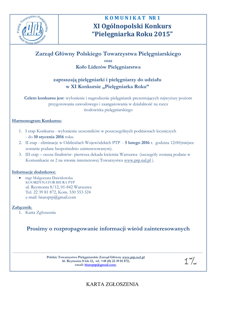 K O M U N I K A T NR 1 XI Ogólnopolski Konkurs “Pielęgniarka Roku 2015” Zarząd Główny Polskiego Towarzystwa Pielęgniarskiego oraz Koło Liderów Pielęgniarstwa zapraszają pielęgniarki i pielęgniarzy do udziału w XI Konkursie „Pielęgniarka Roku” Celem konkursu jest: wyłonienie i nagrodzenie pielęgniarek prezentujących najwyższy poziom przygotowania zawodowego i zaangażowania w działalność na rzecz środowiska pielęgniarskiego Harmonogram Konkursu: 1. I etap Konkursu - wyłonienie uczestników w poszczególnych podmiotach leczniczych - do 10 stycznia 2016 roku. 2. II etap - eliminacje w Oddziałach Wojewódzkich PTP - 5 lutego 2016 r. godzina 12:00(miejsce zostanie podane bezpośrednio zainteresowanym). 3. III etap – ocena finalistów- pierwsza dekada kwietnia Warszawa (szczegóły zostaną podane w Komunikacie nr 2 na stronie internetowej Towarzystwa www.ptp.nal.pl ). Informacje dodatkowe:  mgr Małgorzata Dawidowska KOORDYNATOR BIURA PTP ul. Reymonta 8/12, 01-842 Warszawa Tel. 22 39 81 872, Kom. 530 553 324 e-mail: [email protected] Załącznik: 1. Karta Zgłoszenia Prosimy o rozpropagowanie informacji wśród zainteresowanych ----------------------------------------------------------------------------------------------------------------------------------------------------------------Polskie Towarzystwo Pielęgniarskie Zarząd Główny www.ptp.na1.pl Al. Reymonta 8 lok 12, tel. +48 (0) 22 39 81 872; email: [email protected]; KARTA ZGŁOSZENIA UCZESTNIKA XI OGÓLNOPOLSKIEGO KONKURSU „PIELĘGNIARKA ROKU 2015” 1. Imię i nazwisko _______________________________________________________________ 2. Data urodzenia ________________________________________________________________ 3. Adres zamieszkania_____________________________________________________________ _____________________________________________________________________________ 4. Telefony kontaktowe_____________________________________________________________ 5. Adres e-mail __________________________________________________________________ 6. Miejsce pracy __________________________________________________________________ ____________________________________________________________________________ 7. Stanowisko ___________________________________________________________________ 8. Staż pracy w zawodzie __________________________________________________________ 9. Przynależność do Polskiego Towarzystwa Pielęgniarskiego Oddział……………………………… Tak * od kiedy ______________________________ Nie* 10. Działalność na rzecz pielęgniarstwa (przynależność do towarzystw naukowych, sekcji zawodowych, czynne uczestnictwo w konferencjach naukowych, itp.) z wyłączeniem obligatoryjnej przynależności do samorządu pielęgniarskiego: Tak* jaka ______________________________________________________________ ____________________________________________________________________________________________ Nie* * odpowiedź zaznacz krzyżykiem __________________________________ ______________________________ podpis i pieczęć przełożonego podpis i pieczęć Pielęgniarki Naczelnej / Przełożonej ____________________________ czytelny podpis kandydata OŚWIADCZENIE Oświadczam, że wyrażam zgodę / nie wyrażam zgody* na gromadzenie i przetwarzanie moich danych osobowych przez organizatorów konkursu pod nazwą „Pielęgniarka Roku 2015” i tylko na cele w/w konkursu (zgodnie z Ustawą z dn. 29 sierpnia 1997 r. o ochronie danych osobowych - Dz.U. z 2002 r. Nr 101, poz. 926 z późniejszymi zmianami). * niepotrzebne skreślić ____________________________ _____________________________________ miejscowość, data czytelny podpis kandydata 2