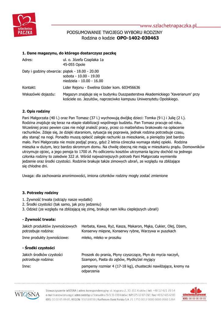 PODSUMOWANIE TWOJEGO WYBORU RODZINY Rodzina o kodzie OPO-1402-030463 1. Dane magazynu, do którego dostarczysz paczkę Adres: ul. o. Józefa Czaplaka 1a 45-055 Opole Daty i godziny otwarcia: piątek - 18.00 - 20.00 sobota - 10.00 - 19.00 niedziela - 10.00 - 16.00 Kontakt: Lider Rejonu - Ewelina Gizder kom. 603456636 Wskazówki dojazdu: Magazyn znajduje się w budynku Duszpasterstwa Akademickiego 'Xaverianum' przy kościele oo. Jezuitów, naprzeciwko kampusu Uniwersytetu Opolskiego. 2. Opis rodziny Pani Małgorzata (40 l.) oraz Pan Tomasz (37 l.) wychowują dwójkę dzieci: Tomka (9 l.) i Julię (2 l.). Rodzina znajduje się teraz na etapie stabilizacji wspólnego budżetu. Pan Tomasz pracuje od roku. Wcześniej przez pewien czas nie mógł znaleźć pracy, przez co małżeństwu brakowało na opłacenie rachunków. Zdaje się, że dzięki staraniom, sytuacja się poprawia, jednak rodzina potrzebuje czasu, aby stanąć na nogi. Ponadto muszą opłacić zaległe rachunki za mieszkanie, a pieniędzy jest bardzo mało. Pani Małgorzata nie może podjąć pracy, gdyż 2 letnia córeczka wymaga stałej opieki. Rodzina mieszka w dużym, lecz bardzo skromnym domu. Na chwilę obecną nie mają w mieszkaniu prądu. Domowników utrzymuje ojciec, a jego pensja to 1700 zł. Po odliczeniu kosztów utrzymania łączny dochód na jednego członka rodziny to zaledwie 322 zł. Wśród najważniejszych potrzeb Pani Małgorzata wymieniła jedzenie oraz środki czystości. Rodzinie brakuje także zimowych ubrań, ze względu na zbliżające się chłodne dni. Uwaga: dla zachowania anonimowości, imiona członków rodziny mogły zostać zmienione 3. Potrzeby rodziny 1. Żywność trwała (odciąży nasze wydatki) 2. Środki czystości (tak samo, jak przy jedzeniu) 3. Odzież (ze względu na zbliżającą się zimę, brakuje nam kilku cieplejszych ubrań) - Żywność trwała: Jakich produktów żywnościowych potrzebuje rodzina: Herbata, Kawa, Ryż, Kasza, Makaron, Mąka, Cukier, Olej, Dżem, Konserwy mięsne, Konserwy rybne, Warzywa w puszkach Inne produkty żywnościowe: mleko, mleko w proszku - Środki czystości Jakich środków czystości potrzebuje rodzina: Proszek do prania, Płyny czyszczące, Płyn do mycia naczyń, Szampon, Pasta do zębów, Mydło/żel myjący Inne: pampersy rozmiar 4 (17-18 kg), chusteczki nawilżające, kremy na odparzenia PODSUMOWANIE TWOJEGO WYBORU RODZINY Rodzina o kodzie OPO-1402-030463 PODSUMOWANIE TWOJEGO WYBORU RODZINY Rodzina o kodzie OPO-1402-030463 - Odzież Tomasz (ojciec) Rodzaj odzieży: uniwersalne Kategoria: dżinsy - ciemne Rozmiar: Sylwetka: pas 90 cm, wysokość 195 cm Uwagi: Małgorzata Rodzaj odzieży: zimowa Kategoria: kurtka Rozmiar: L Sylwetka: wysokość 165 cm Uwagi: lekko za tyłek, z materiału, bardziej sportowa niż elegancki płaszczyk - Obuwie Julia Rodzaj obuwia: zimowe Kategoria: kozaki Rozmiar: 24 Uwagi: Tomasz Rodzaj obuwia: zimowe Kategoria: trapery Rozmiar: 35 Uwagi: Małgorzata Rodzaj obuwia: zimowe Kategoria: płaskie kozaki Rozmiar: 41 Uwagi: nie za długie, czarne Tomasz (ojciec) Rodzaj obuwia: zimowe Kategoria: trapery PODSUMOWANIE TWOJEGO WYBORU RODZINY Rodzina o kodzie OPO-1402-030463 Rozmiar: 45 Uwagi: czarne - Pomoce szkolne Jakich pomocy szkolnych potrzebuje rodzina? Zeszyty, Bloki, Kredki, Farbki, Plastelina, Papier kolorowy, Nożyczki, Klej, Piórnik, Plecak, Przybory do pisania Inne: pisaki, pióro, ołówek, linijka, cyrkiel, plecak - z bohaterem spider man, iron man, lub innymi - Wyposażenie mieszkania Jakiego wyposażenia mieszkania potrzebuje rodzina: Koc, Pościel Inne: poszewka na 2 osobową kołdrę - Specjalne upominki Tomek - auto na pilota. Julia - wózek dla lalek. Tomasz - czarny portfel. Małgorzata - perfum. 4. Osoby opiekujące sie rodziną - Wolontariusz opiekun rodziny E-mail: [email protected] Telefon: 792316242 - Lider rejonu Imię i nazwisko: Ewelina Gizder 5. Jak zapakować paczkę Paczki można dostarczyć wyłącznie do tego magazynu, z którego wybrana została rodzina. Pamiętaj, że po wybraniu przez Ciebie rodziny nikt inny nie będzie już dla niej przygotowywał paczki. Nie musisz zaspokoić wszystkich potrzeb rodziny, zwróć jednak uwagę, że wszystkie wymienione rzeczy są dla rodziny bardzo ważne. Rzeczy które podarujesz rodzinie powinny być dla niej prezentem. Nie muszą być one nowe, ale zawsze przygotowane z myślą o drugim człowieku. Przygotuj więc paczkę tak, by podniosła poczucie własnej wartości u obdarowanych przez Ciebie osób. Wskazówki do przygotowania Paczki: * paczki powinny być podzielone na kilka, poręcznych, niezbyt ciężkich pudeł, prosimy nie dostarczać do magazynu produktów zapakowanych w reklamówki czy worki foliowe * każde pudło powinno być opisane kodem rodziny oraz opatrzone numerem, pudła należy numerować według klucza: np. 1 z 5, 2 z 5 itd. * paczce powinny znaleźć się suche i trwałe artykuły spożywcze, prosimy, aby nie pakować do pudeł produktów, które łatwo ulegają uszkodzeniu, wylaniu, rozgnieceniu PODSUMOWANIE TWOJEGO WYBORU RODZINY Rodzina o kodzie OPO-1402-030463 * aby prezent nabrał świątecznego charakteru można owinąć pudła kolorowym papierem Dziękując za Twoje zaangażowanie w SZLACHETNĄ PACZKĘ, zapraszamy do ponownego spotkania przy rozliczaniu formularza PIT. Przekaż swój 1% na Stowarzyszenie WIOSNA. Razem zmieniamy świat na lepsze!