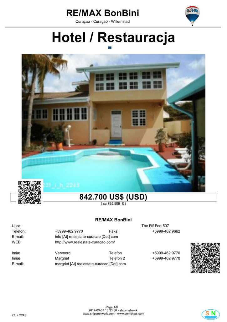 RE/MAX BonBini Curaçao - Curaçao - Willemstad Hotel / Restauracja 842.700 US$ (USD) ( ca 795.509 € ) RE/MAX BonBini Ulica: Telefon: E-mail: WEB +5999-462 9770 Faks: info [At] realestate-curacao [Dot] com http://www.realestate-curacao.com/ Imiæ Imiæ E-mail: Vervoord Telefon Margriet Telefon 2 margriet [At] realestate-curacao [Dot] com 77_i_2245 The Rif Fort 507 +5999-462 9662 Page 1/6 2017-03-07 13:33:56 - shipsnetwork www.shipsnetwork.com - www.comships.com +5999-462 9770 +5999-462 9770 RE/MAX BonBini Curaçao - Curaçao - Willemstad Numer kodu Typ budynku Poùoýenie Materiaùy Property Address Powierzchnia dziaùki Firma Ýycie Kuchnia Sypialnie Zùy Opinie Toaleta 77_i_2245 Hotel / Restauracja Seafront Beton VREDENBERG, Telamon 43 Numer kodu Nr referencyjny Status objektet Rok Powierzchnia 10 5 Biznes Inne Usùugi Garaý Carport zadaszony taras Akcesoria Dzierýawa Taras Balkon Jetty Pokój Party Klimatyzacja Resort Ogród Pralnia Goràcy zadaszony taras ogrodzony / murem 77_i_2245 1163595324 po uzgodnieniu potrzebne Page 2/6 2017-03-07 13:33:56 - shipsnetwork www.shipsnetwork.com - www.comships.com 1 RE/MAX BonBini Curaçao - Curaçao - Willemstad 77_i_2245 Page 3/6 2017-03-07 13:33:56 - shipsnetwork www.shipsnetwork.com - www.comships.com RE/MAX BonBini Curaçao - Curaçao - Willemstad 77_i_2245 Page 4/6 2017-03-07 13:33:56 - shipsnetwork www.shipsnetwork.com - www.comships.com RE/MAX BonBini Curaçao - Curaçao - Willemstad 77_i_2245 Page 5/6 2017-03-07 13:33:56 - shipsnetwork www.shipsnetwork.com - www.comships.com RE/MAX BonBini Curaçao - Curaçao - Willemstad 77_i_2245 Page 6/6 2017-03-07 13:33:56 - shipsnetwork www.shipsnetwork.com - www.comships.com