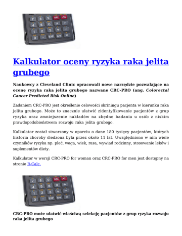 Kalkulator oceny ryzyka raka jelita grubego Naukowcy z Cleveland Clinic opracowali nowe narzędzie pozwalające na ocenę ryzyka raka jelita grubego nazwane CRC-PRO (ang. Colorectal Cancer Predicted Risk Online) Zadaniem CRC-PRO jest określenie celowości skriningu pacjenta w kierunku raka jelita grubego. Może to znacznie ułatwić zidentyfikowanie pacjentów z grup ryzyka oraz zmniejszenie nakładów na zbędne badania u osób z niskim prawdopodobieństwem rozwoju raka jelita grubego. Kalkulator został stworzony w oparciu o dane 180 tysięcy pacjentów, których historia choroby śledzona była przez około 11 lat. Uwzględniono w nim wiele czynników ryzyka np. płeć, waga, wiek, rasa, wywiad rodzinny, stosowanie leków i suplementów diety. Kalkulator w wersji CRC-PRO for woman oraz CRC-PRO for men jest dostępny na stronie R-Calc. CRC-PRO może ułatwić wlaściwą selekcję pacjentów z grup ryzyka rozwoju raka jelita grubego Źródło: Wikimedia Commons, autor Christian Horvat, licencja CC BY SA 3.0 CRC-PRO może stać się kolejnym krokiem w kierunku medycyny spersonalizowanej, podnosząc efektywność opieki medycznej. Piśmiennictwo: Wells BJ., Kattan MW., Cooper GS. et al. ColoRectal Cancer Predicted Risk Online (CRC-PRO) Calculator Using Data from the Multi-Ethnic Cohort Study. J Am Board Fam Med, 2014; 27, 1: 42-55. *** W/w zespół badawczy opracował już wiele podobnych narzędzi, oceniających ryzyko innych schorzeń takich jak choroby serca, rak piersi, stercza czy tarczycy. Data publikacji: 05.01.2014r.