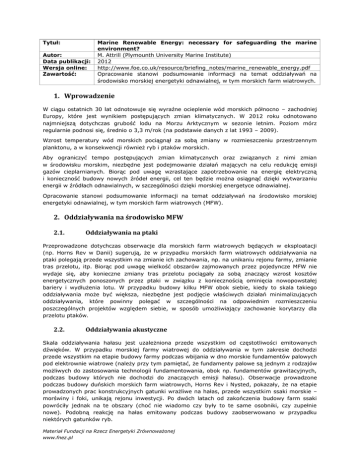 Tytuł: Autor: Data publikacji: Wersja online: Zawartość: Marine Renewable Energy: necessary for safeguarding the marine environment? M. Attrill (Plymounth University Marine Institute) 2012 http://www.foe.co.uk/resource/briefing_notes/marine_renewable_energy.pdf Opracowanie stanowi podsumowanie informacji na temat oddziaływań na środowisko morskiej energetyki odnawialnej, w tym morskich farm wiatrowych. 1. Wprowadzenie W ciągu ostatnich 30 lat odnotowuje się wyraźne ocieplenie wód morskich północno – zachodniej Europy, które jest wynikiem postępujących zmian klimatycznych. W 2012 roku odnotowano najmniejszą dotychczas grubość lodu na Morzu Arktycznym w sezonie letnim. Poziom mórz regularnie podnosi się, średnio o 3,3 m/rok (na podstawie danych z lat 1993 – 2009). Wzrost temperatury wód morskich pociągnął za sobą zmiany w rozmieszczeniu przestrzennym planktonu, a w konsekwencji również ryb i ptaków morskich. Aby ograniczyć tempo postępujących zmian klimatycznych oraz związanych z nimi zmian w środowisku morskim, niezbędne jest podejmowanie działań mających na celu redukcję emisji gazów cieplarnianych. Biorąc pod uwagę wzrastające zapotrzebowanie na energię elektryczną i konieczność budowy nowych źródeł energii, cel ten będzie można osiągnąć dzięki wytwarzaniu energii w źródłach odnawialnych, w szczególności dzięki morskiej energetyce odnawialnej. Opracowanie stanowi podsumowanie informacji na temat oddziaływań na środowisko morskiej energetyki odnawialnej, w tym morskich farm wiatrowych (MFW). 2. Oddziaływania na środowisko MFW 2.1. Oddziaływania na ptaki Przeprowadzone dotychczas obserwacje dla morskich farm wiatrowych będących w eksploatacji (np. Horns Rev w Danii) sugerują, że w przypadku morskich farm wiatrowych oddziaływania na ptaki polegają przede wszystkim na zmianie ich zachowania, np. na unikaniu rejonu farmy, zmianie tras przelotu, itp. Biorąc pod uwagę wielkość obszarów zajmowanych przez pojedyncze MFW nie wydaje się, aby konieczne zmiany tras przelotu pociągały za sobą znaczący wzrost kosztów energetycznych ponoszonych przez ptaki w związku z koniecznością ominięcia nowopowstałej bariery i wydłużenia lotu. W przypadku budowy kilku MFW obok siebie, kiedy to skala takiego oddziaływania może być większa, niezbędne jest podjęcie właściwych działań minimalizujących oddziaływania, które powinny polegać w szczególności na odpowiednim rozmieszczeniu poszczególnych projektów względem siebie, w sposób umożliwiający zachowanie korytarzy dla przelotu ptaków. 2.2. Oddziaływania akustyczne Skala oddziaływania hałasu jest uzależniona przede wszystkim od częstotliwości emitowanych dźwięków. W przypadku morskiej farmy wiatrowej do oddziaływania w tym zakresie dochodzi przede wszystkim na etapie budowy farmy podczas wbijania w dno morskie fundamentów palowych pod elektrownie wiatrowe (należy przy tym pamiętać, że fundamenty palowe są jednym z rodzajów możliwych do zastosowania technologii fundamentowania, obok np. fundamentów grawitacyjnych, podczas budowy których nie dochodzi do znaczących emisji hałasu). Obserwacje prowadzone podczas budowy duńskich morskich farm wiatrowych, Horns Rev i Nysted, pokazały, że na etapie prowadzonych prac konstrukcyjnych gatunki wrażliwe na hałas, przede wszystkim ssaki morskie – morświny i foki, unikają rejonu inwestycji. Po dwóch latach od zakończenia budowy farm ssaki powróciły jednak na te obszary (choć nie wiadomo czy były to te same osobniki, czy zupełnie nowe). Podobną reakcję na hałas emitowany podczas budowy zaobserwowano w przypadku niektórych gatunków ryb. Materiał Fundacji na Rzecz Energetyki Zrównoważonej www.fnez.pl Skala oddziaływania akustycznego MFW na etapie eksploatacji nie wydaje się już być tak znacząca. Na tym etapie emitowane są głównie dźwięki o częstotliwościach granicznych lub poza zakresem słyszalności gatunków organizmów morskich. 2.3. Oddziaływania pól elektromagnetycznych (PEM) Pola elektromagnetyczne są emitowane przez kable wchodzące w skład wewnętrznej i zewnętrznej infrastruktury przyłączeniowej MFW. Natężenie emitowanych PEM jest uzależnione od wybranej technologii okablowania, natężenia przesyłanego prądu oraz głębokości zakopania kabli w dnie morskim. Wiele gatunków organizmów morskich, np. ryb czy ssaków, wykrywa pola elektromagnetyczne, a niektóre z nich wykorzystuje je do orientacji w przestrzeni. Potencjalnie więc istnieje ryzyko, że emitowane pola elektromagnetyczne mogą doprowadzić do zmiany zachowania przedstawicieli niektórych gatunków. W chwili obecnej brakuje jednak wiarygodnych wyników badań, które jednoznacznie wskazałyby na zakres i skalę takiego oddziaływania. 2.4. Efekt rafy Powierzchnie podwodnych elementów elektrowni wiatrowych mogą stanowić nowe miejsce osiedlania się dla niektórych gatunków organizmów bentosowych, tworząc tzw. „sztuczną rafę”, a w konsekwencji przyciągać w rejon inwestycji np. ryby, dla których nowopowstała „rafa” będzie stanowić bogatą bazę pokarmową, a następnie ssaki i ptaki morskie. Oddziaływanie tego typu potwierdzają m.in. wyniki monitoringu porealizacyjnego przeprowadzonego dla MFW Horns Rev, które wykazały 60-krotny wzrost biomasy w rejonie farmy po jej wybudowaniu. Wzrost bioróżnorodności na obszarze MFW może być również związany z ograniczeniem możliwości trałowania w jej granicach. Wymuszona zmiana metody połowowej, np. z włoków na sieci stawne, może w efekcie doprowadzić do wzrostu liczebności populacji ryb, w tym również gatunków będących przedmiotem rybołówstwa, i przełożyć się tym samym na wzrost wartości połowów, pomimo wprowadzonych na obszarze farmy ograniczeń dla rybołówstwa. 3. Podsumowanie Morska energetyka odnawialna, w tym morskie farmy wiatrowe, oddziaływują na środowisko morskie na wszys